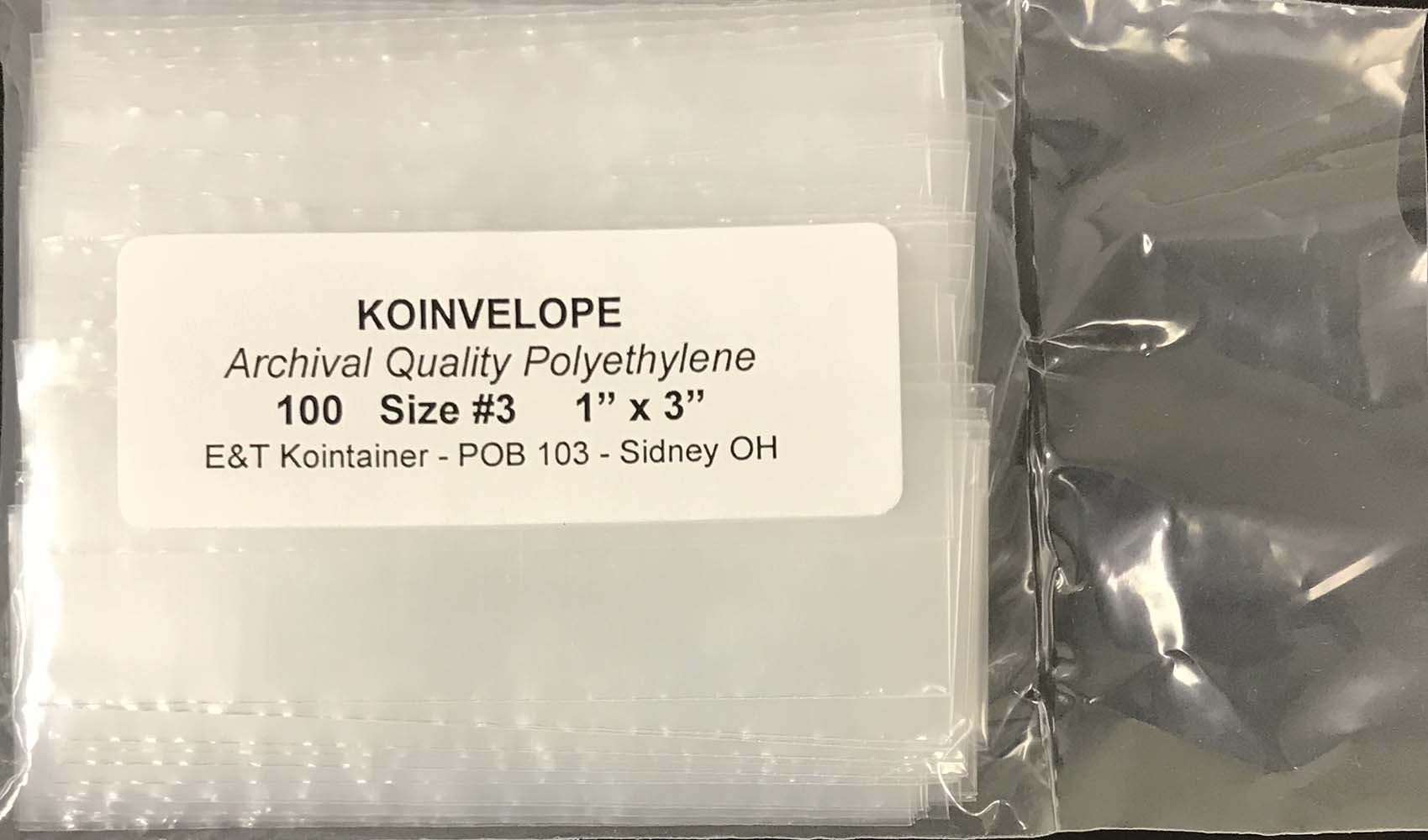 E & T Kointainer introduced the use of inert polyethylene bags in the 1950s. Just insert the coin in the bag, fold over, and place in a flip or paper envelope. 100 Koinvelopes per pack.