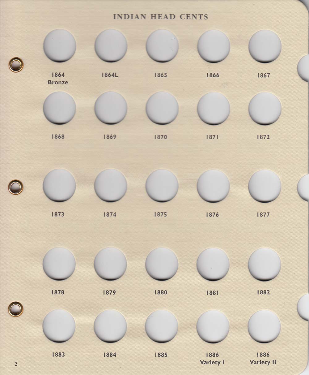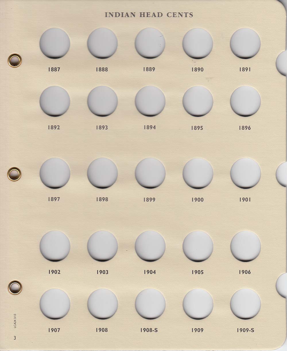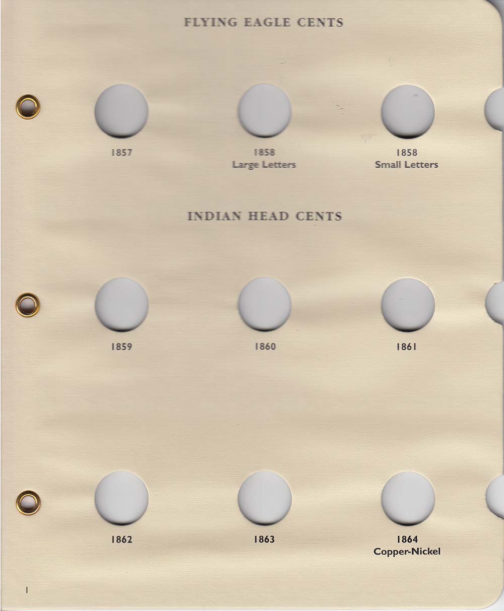 This album includes spaces for Flying Eagle cents of 1857 to 1858 including 1858 Large and Small Letter varieties, and Indian Head Cents from 1859 to 1909. There is not a space for 1856. Littleton albums provide archival-quality, acid-free, and PVC-free long-term storage for your collection. Each album gives you a brief history about the series, along with mintage figures. Littleton albums feature sturdy 3-ring binder construction, so album pages lie flat and can be easily removed. Brass eyelets reinforce the pages, and thumb-holds make slide removal convenient. Crystal-clear slides show both obverse and reverse. Album fits in a 1.5-inch slipcase (sold separately). PAGE 1: FLYING EAGLE CENTS (1857)(1858 LARGE LETTERS)(1858 SMALL LETTERS) INDIAN HEAD CENTS (1859)(1860)(1861) (1862)(1863)(1864 COPPER-NICKEL) PAGE 2: (1864 BRONZE)(1864L)(1865)(1866)(1867) (1868)(1869)(1870)(1871)(1872) (1873)(1874)(1875)(1876)(1877) (1878)(1879)(1880)(1881)(1882) (1883)(1884)(1885)(1886 VARIETY 1)(1886 VARIETY 11) PAGE 3: (1887)(1888)(1889)(1890)(1891) (1892)(1893)(1894)(1895)(1896) (1897)(1898)(1899)(1900)(1901) (1902)(1903)(1904)(1905)(1906) (1907)(1908)(1908-S)(1909)(1909-S)
