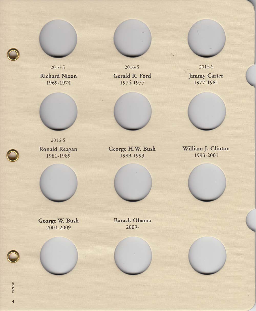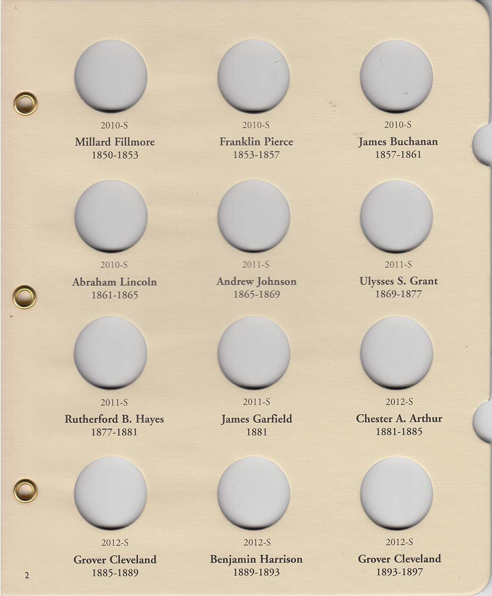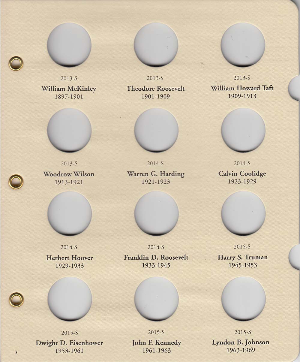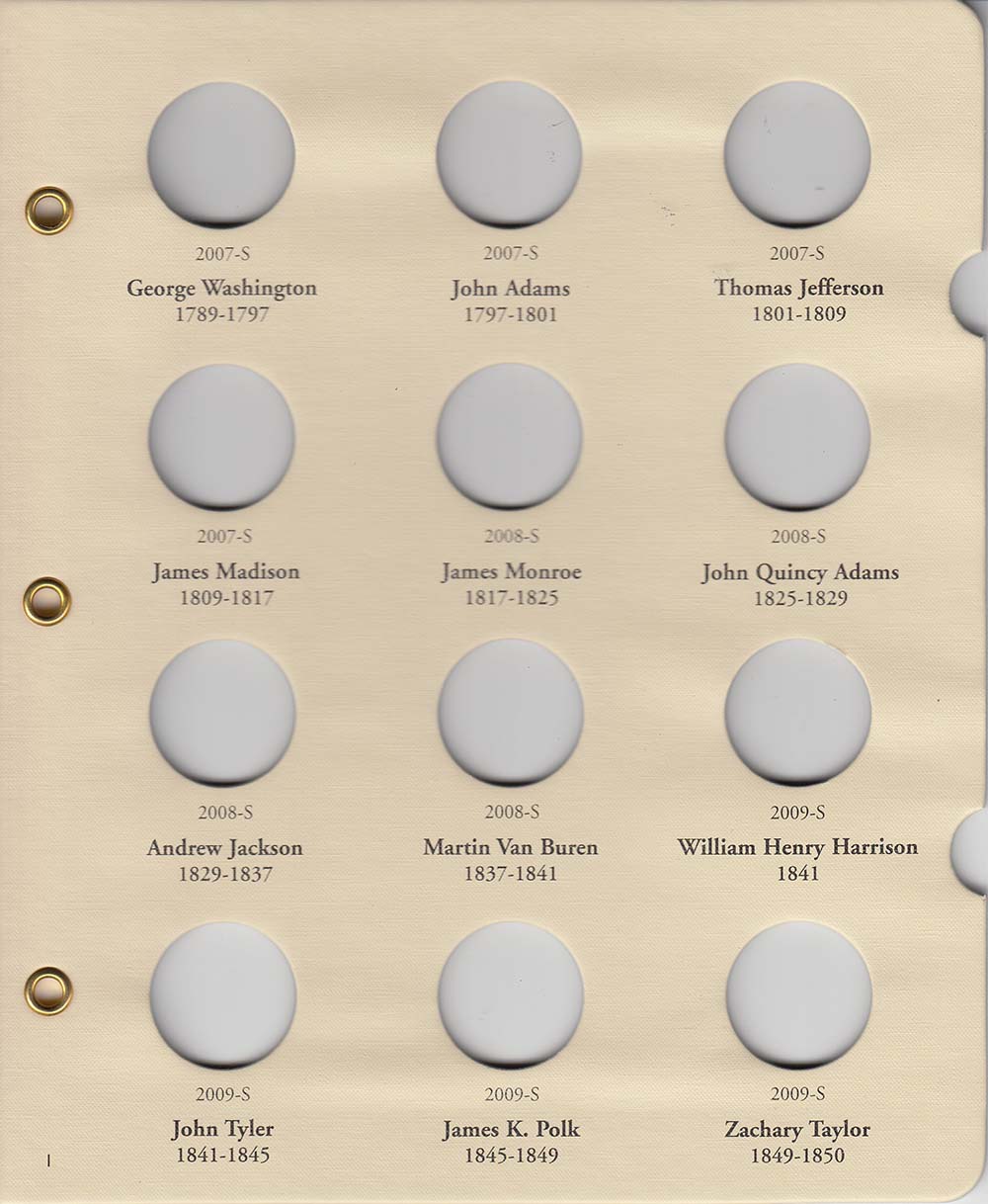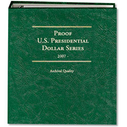 This album includes spaces for the specially made Proof Presidential Dollar coins from the San Francisco Mint. Littleton albums provide archival-quality, acid-free, and PVC-free long-term storage for your collection. Each album gives you a brief history about the series, along with mintage figures. Littleton albums feature sturdy 3-ring binder construction, so album pages lie flat and can be easily removed. Brass eyelets reinforce the pages, and thumb-holds make slide removal convenient. Crystal-clear slides show both obverse and reverse. Album fits in a 1.5-inch slipcase (sold separately).