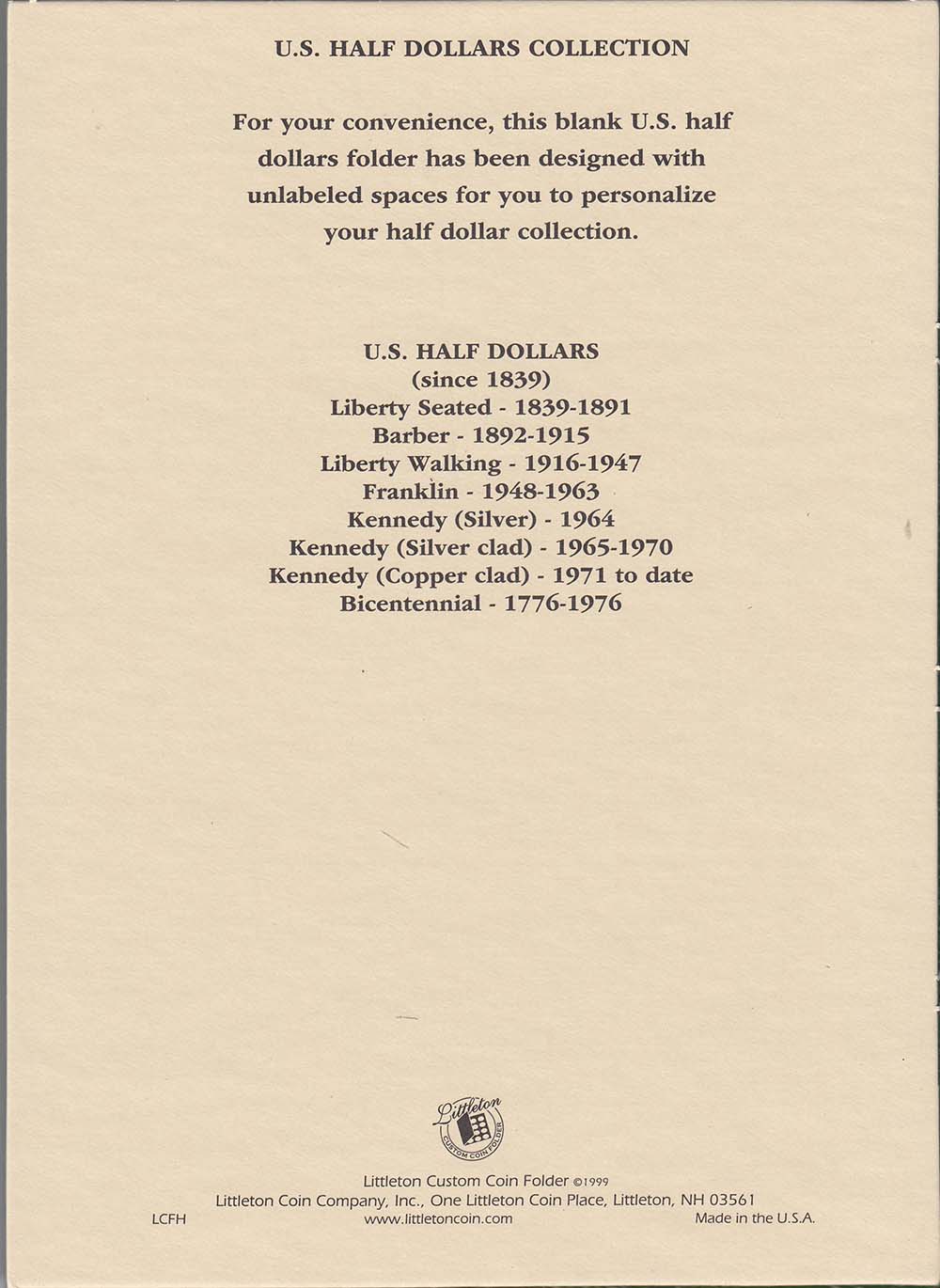 Littleton folders are handsome and durable. They hold your coins securely and are 6 1/2" x 8 3/8" to easily fit on your bookshelf. Green leather-look with gold embossing on exterior. This folder has 36 slots.