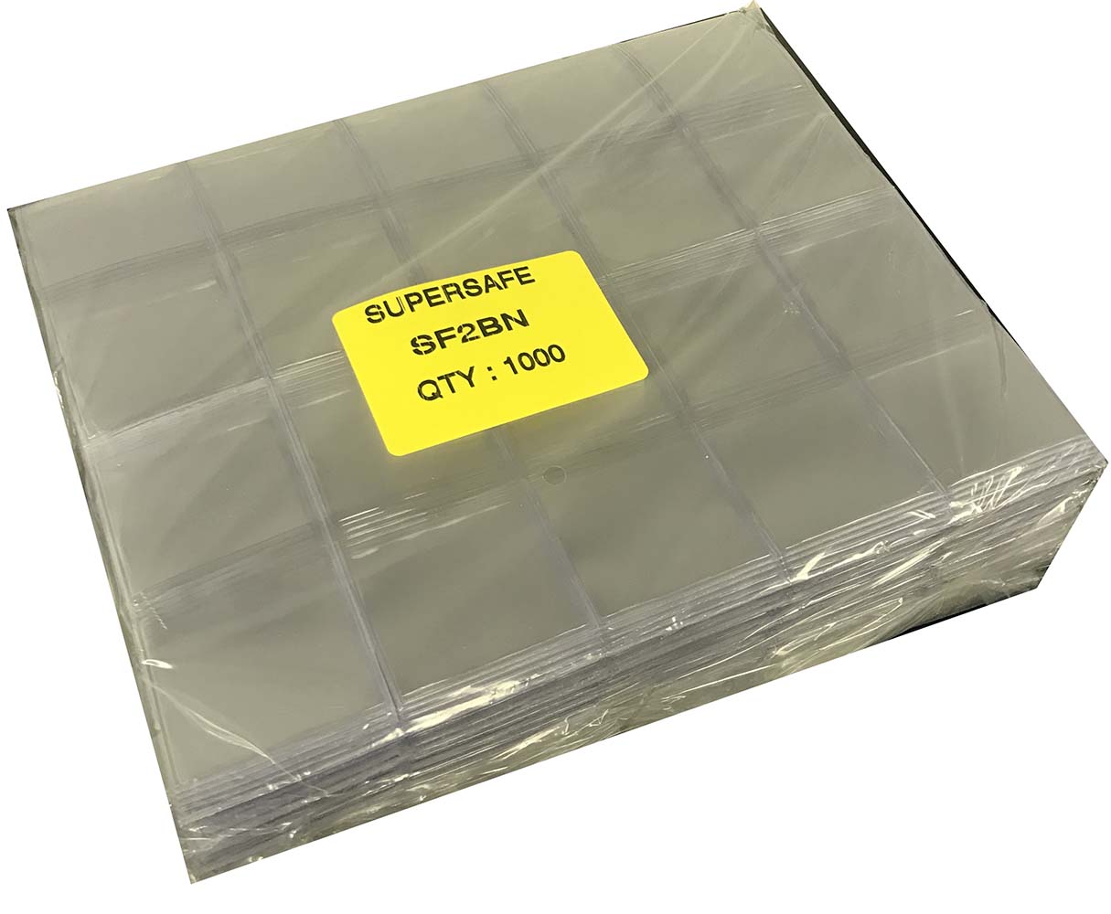 Supersafe safety flips are made of "safety vinyl"--vinyl that has low levels of softeners. Sold in packs of 100 flips (with paper 2x2 inserts) and packs of 1000 flips (without inserts).