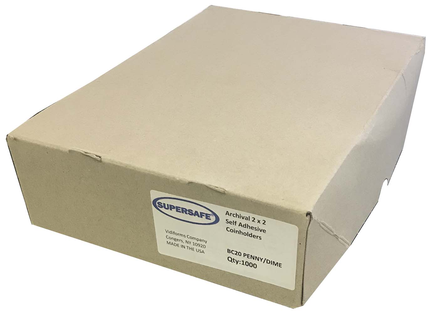 Speed up your coin holdering process using our Supersafe brand self-adhesive 2x2 coin holders. Just peel off the backing, insert a coin and press to close. Save time from not having to staple and reduce risk of staple damage. The holders are made of all archival materials and include no PVC or harmful additives. The non-migrating self adhesive gives an air tight seal to protect your coins. Supersafe coin holders also feature a convenient tab for easy handling Sold in packs of 50 holders or boxes of 1000 holders.