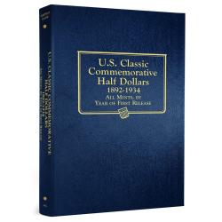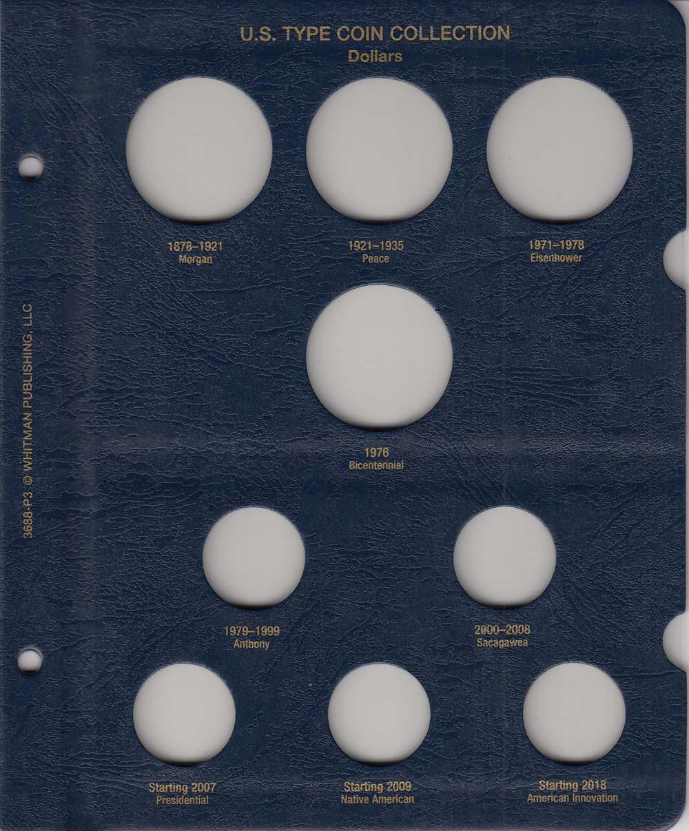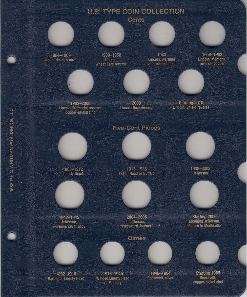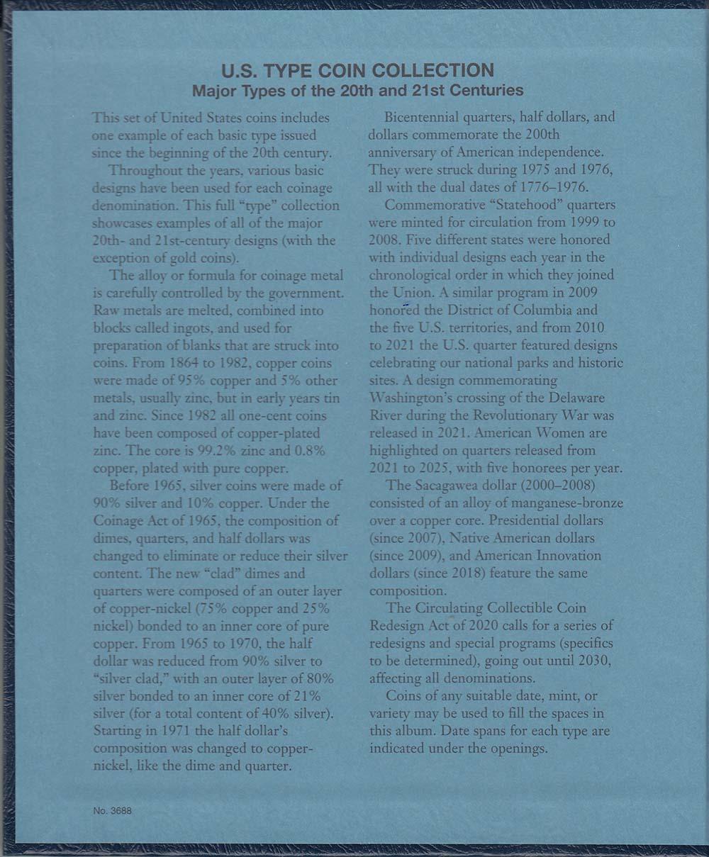 This Whitman Classic Album for US Type Coin Collection 20th and 21st Centuries (Whitman model number 3688) consists of a dark blue leatherette binder with blue loose-leaf hinged pages. Both the binder and pages are gold stamped. The pages are held in the binder with two posts that screw apart so that pages can be added, removed and replaced with ease and have thumb notches for easy window removal. The album has a data sheet with mintages and other historical information.