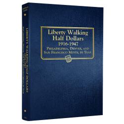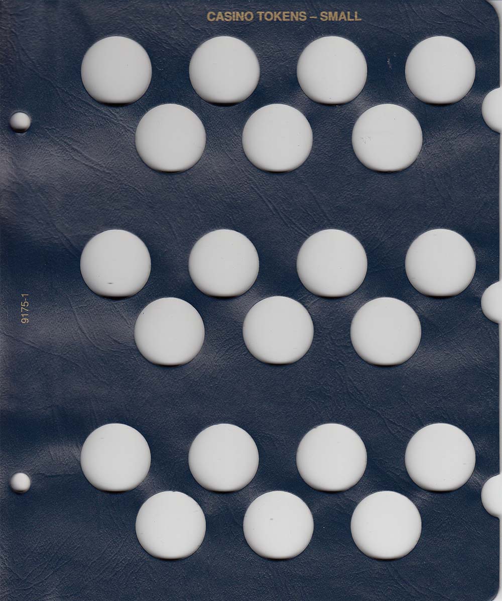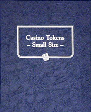 This Whitman Classic Album for Casino Minor Tokens (Whitman model number 9175) consists of a dark blue leatherette binder with blue loose-leaf hinged pages. Both the binder and pages are gold stamped. The pages are held in the binder with two posts that screw apart so that pages can be added, removed and replaced with ease and have thumb notches for easy window removal. The album has a data sheet with mintages and other historical information.