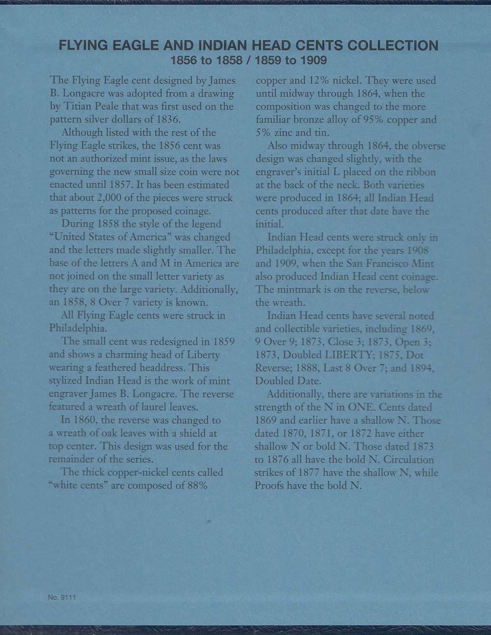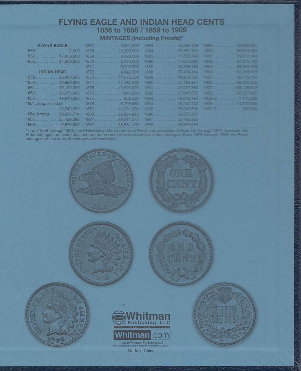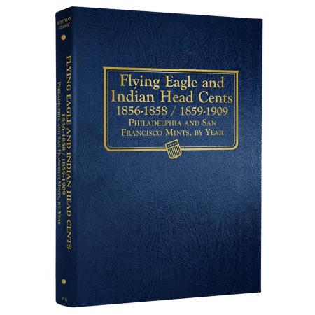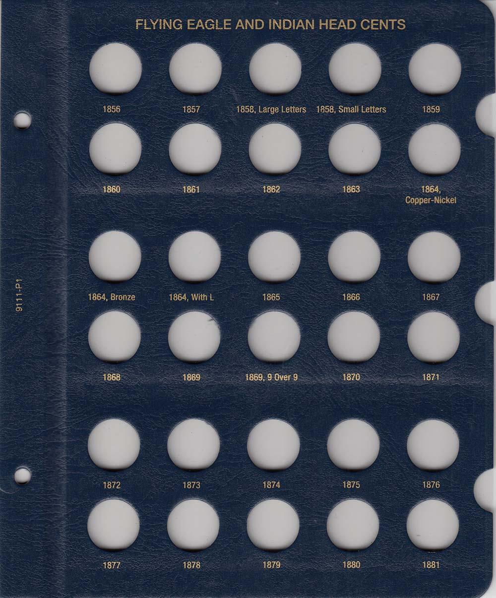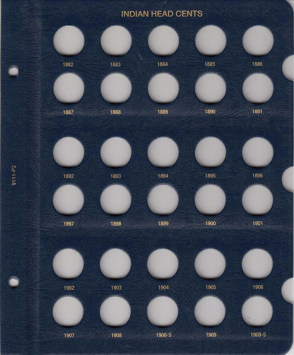 This Whitman Classic Album for Indian Cents 1856-1909 (Whitman model number 9111) consists of a dark blue leatherette binder with blue loose-leaf hinged pages. Both the binder and pages are gold stamped. The pages are held in the binder with two posts that screw apart so that pages can be added, removed and replaced with ease and have thumb notches for easy window removal. The album has a data sheet with mintages and other historical information.