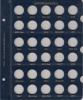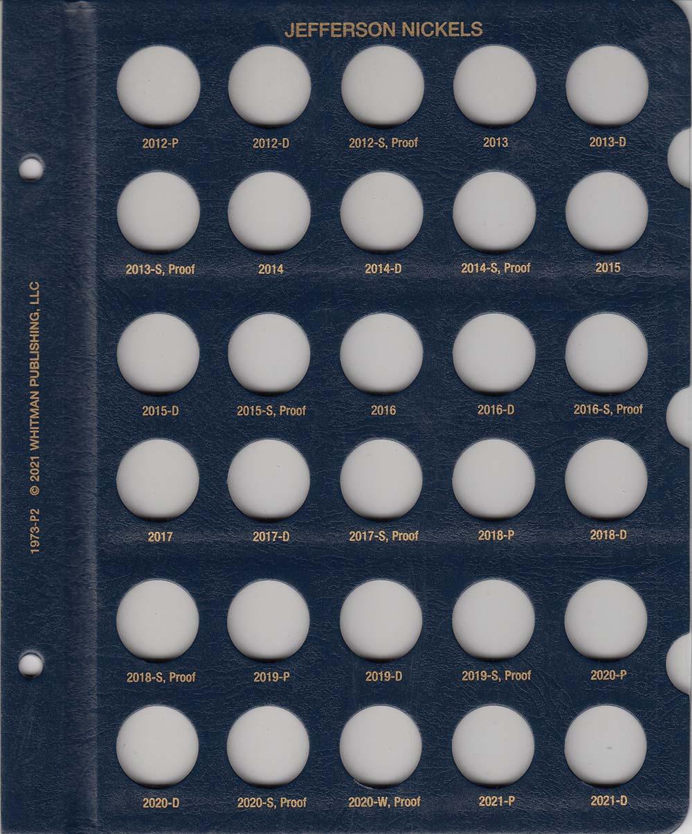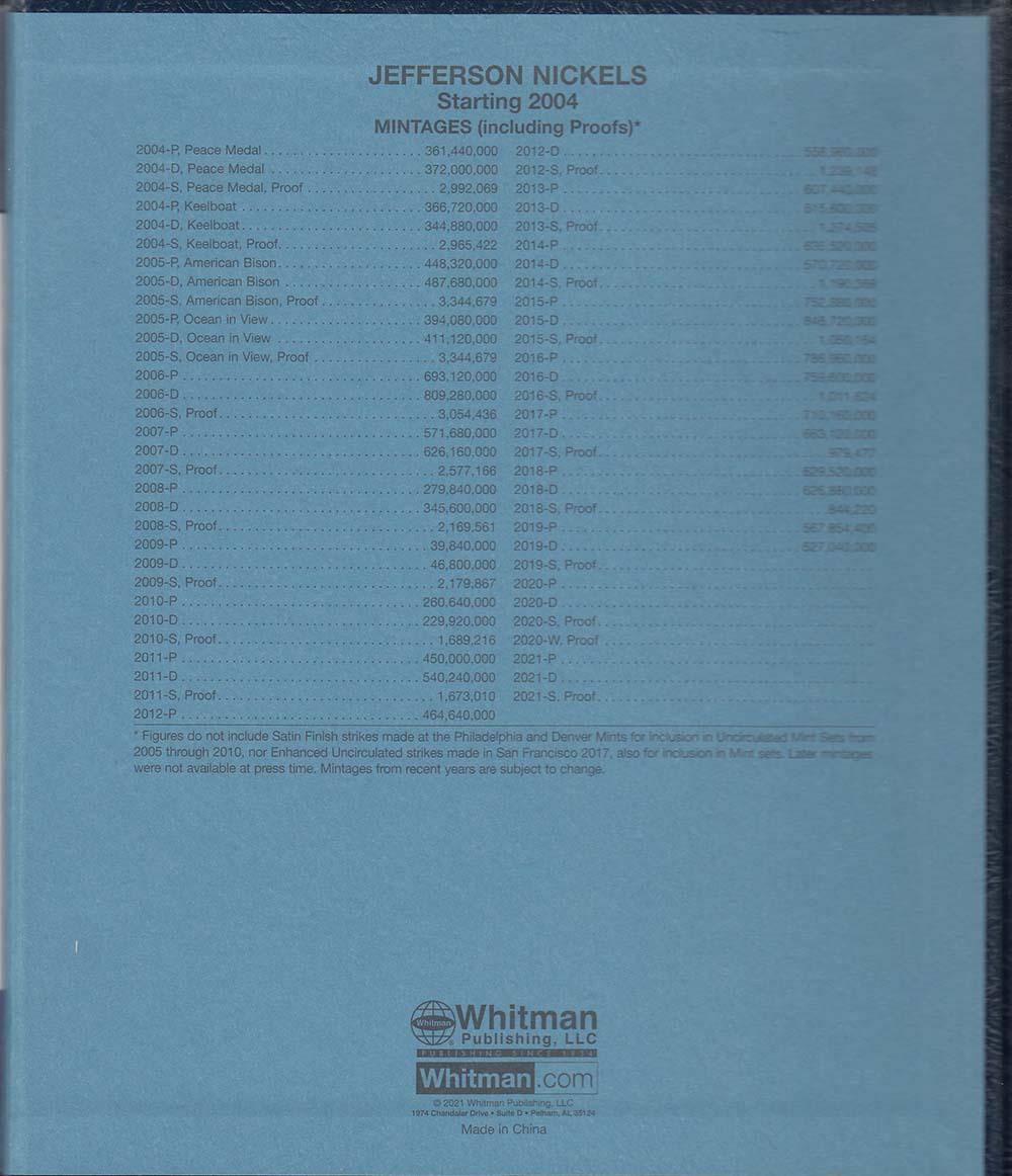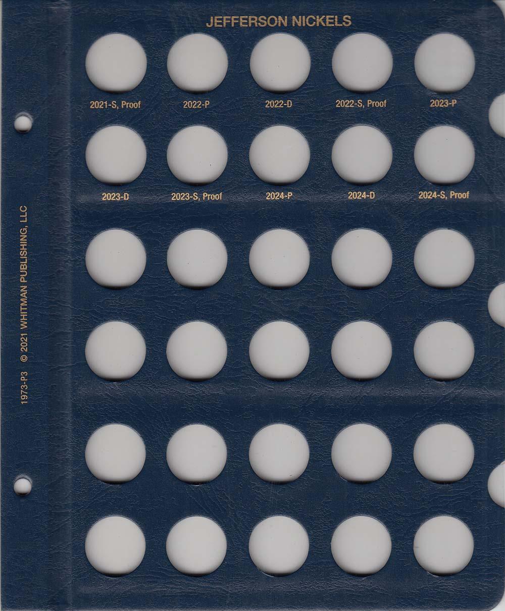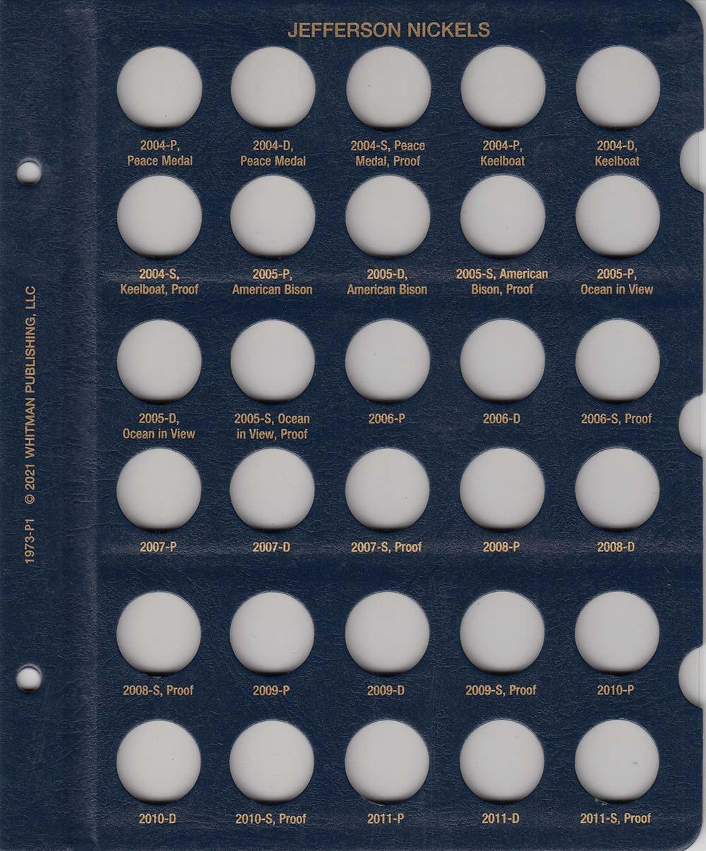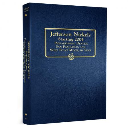 This Whitman Classic Album for Jefferson Nickels Starting 2004 consists of a dark blue leatherette binder with blue loose-leaf hinged pages. Both the binder and pages are gold stamped. The pages are held in the binder with two posts that screw apart so that pages can be added, removed and replaced with ease and have thumb notches for easy window removal. The album has a data sheet with mintages and other historical information.