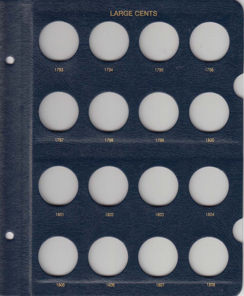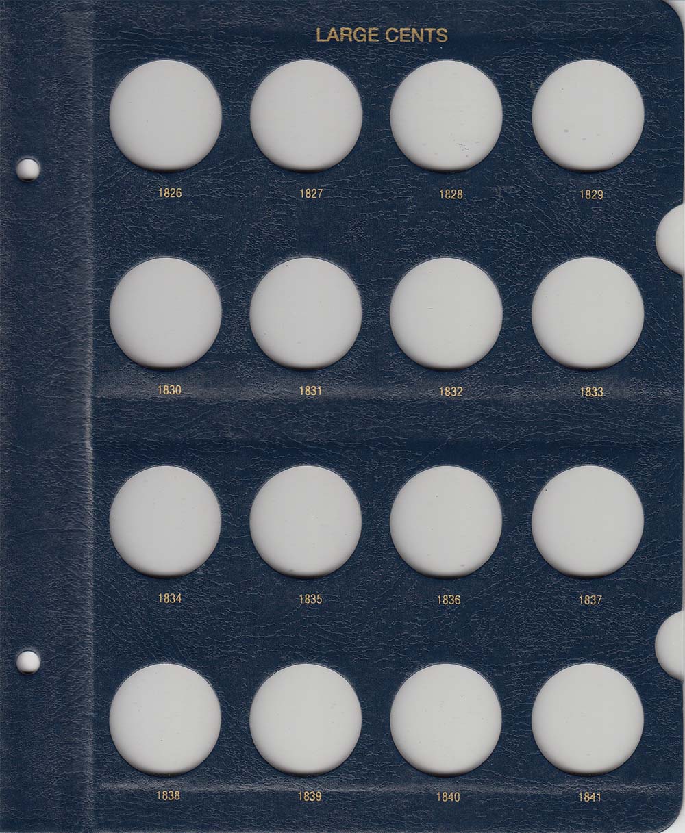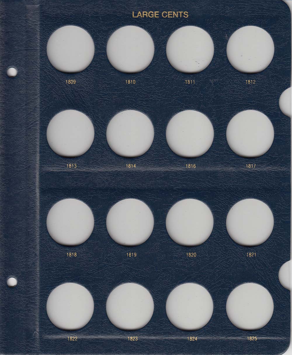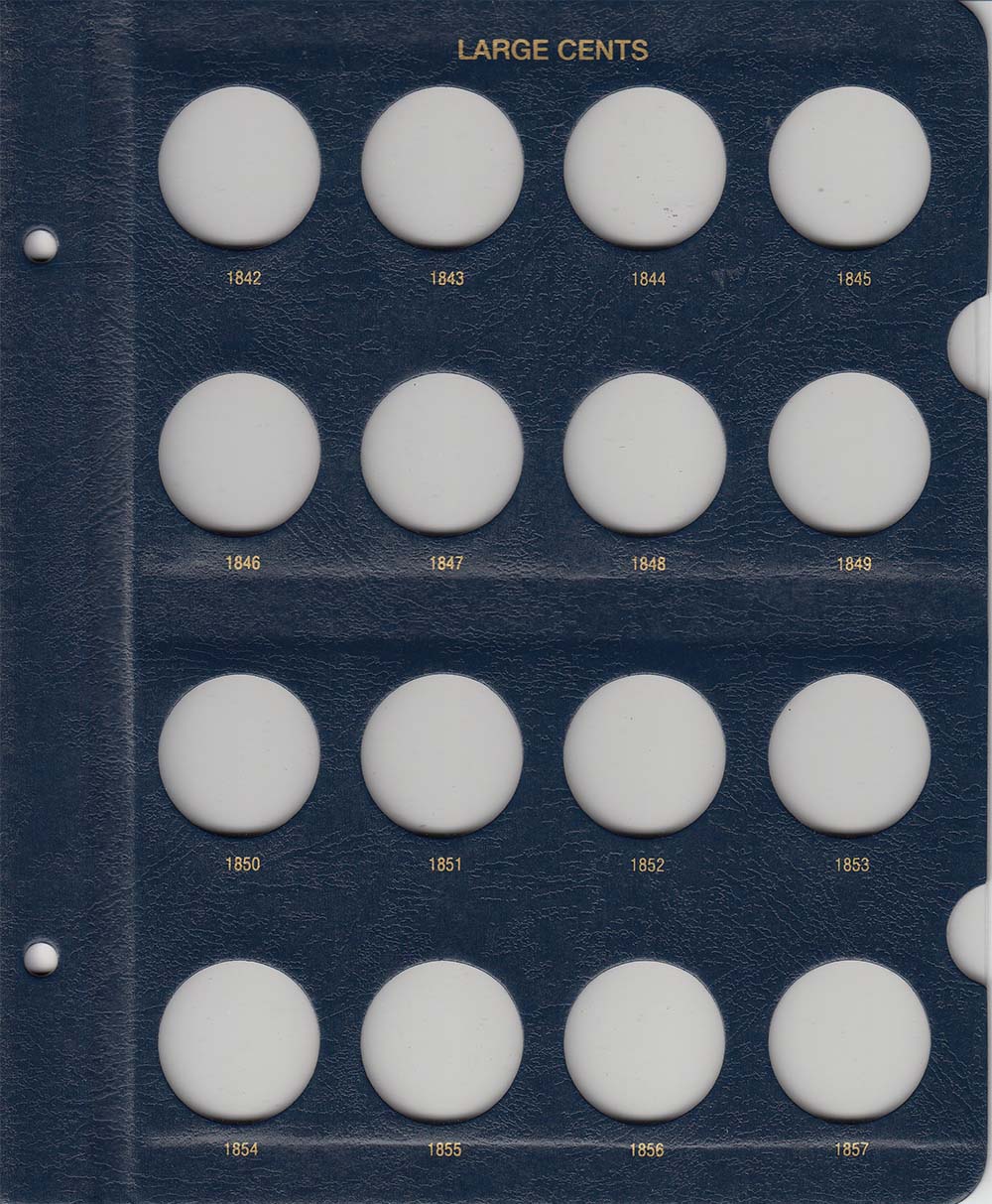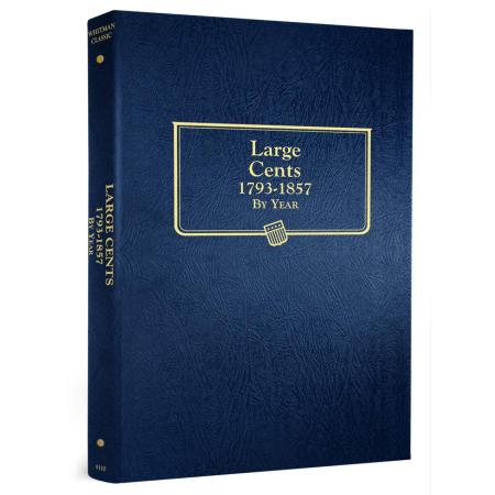 This Whitman Classic Album for Large Cents (Whitman model number 9110) consists of a dark blue leatherette binder with blue loose-leaf hinged pages. Both the binder and pages are gold stamped. The pages are held in the binder with two posts that screw apart so that pages can be added, removed and replaced with ease and have thumb notches for easy window removal. The album has a data sheet with mintages and other historical information.