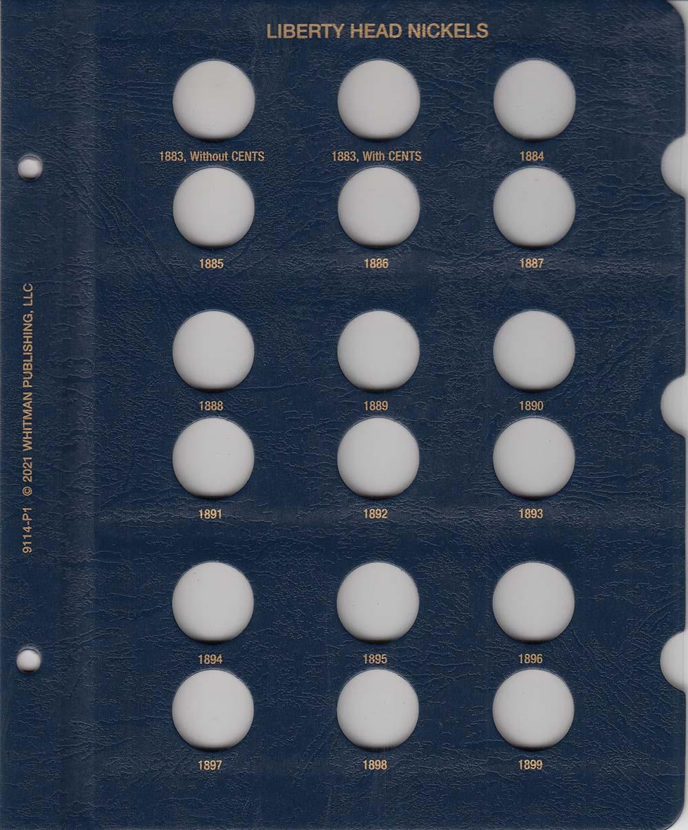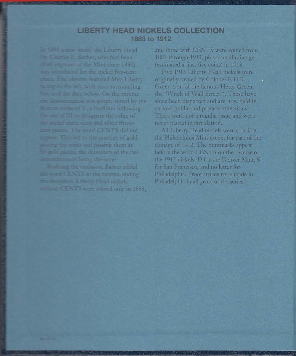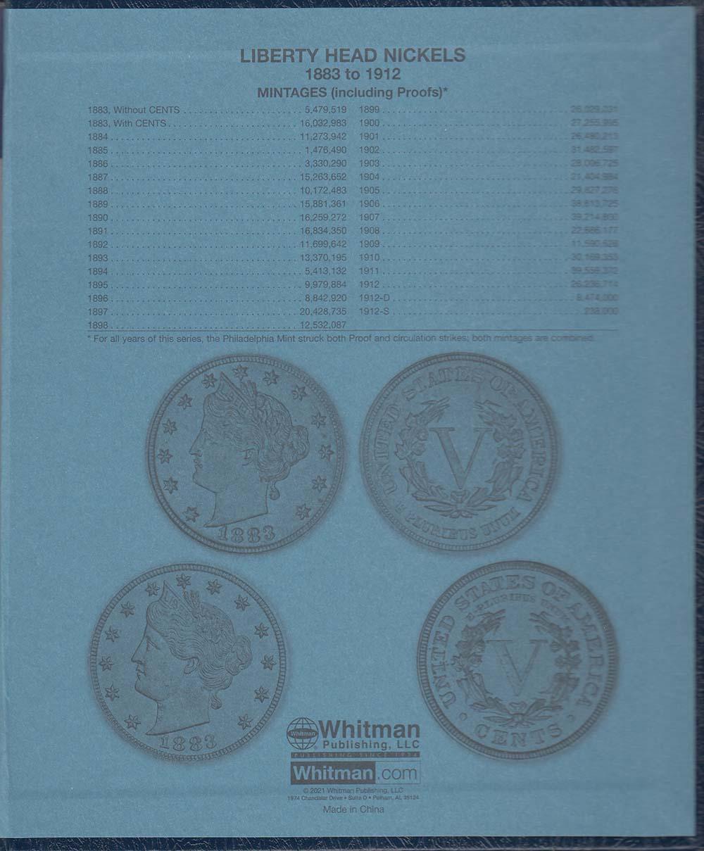 This Whitman Classic Album for Liberty Nickels 1883-1912 (Whitman model number 9114) consists of a dark blue leatherette binder with blue loose-leaf hinged pages. Both the binder and pages are gold stamped. The pages are held in the binder with two posts that screw apart so that pages can be added, removed and replaced with ease and have thumb notches for easy window removal. The album has a data sheet with mintages and other historical information.