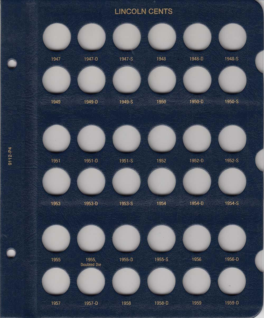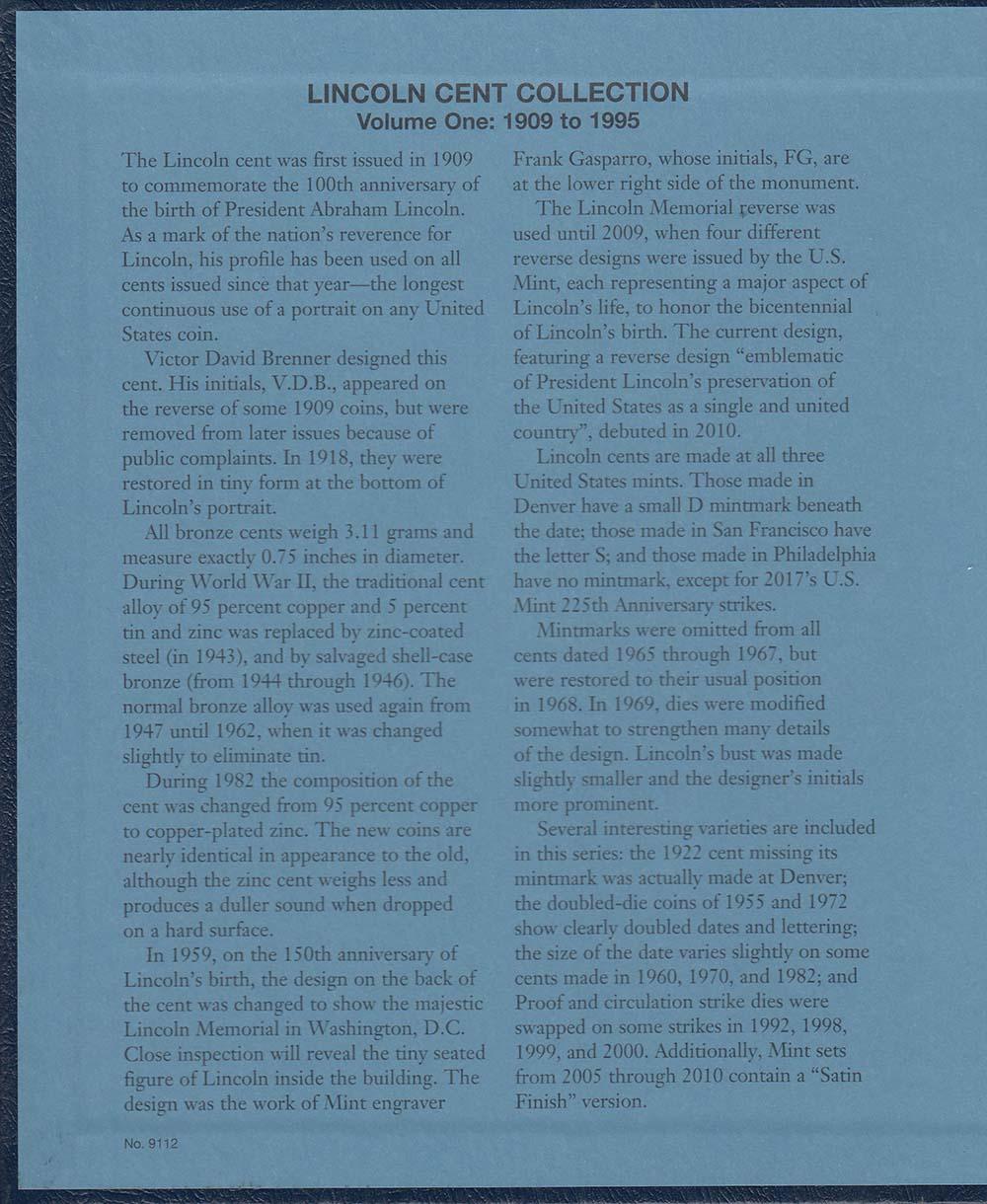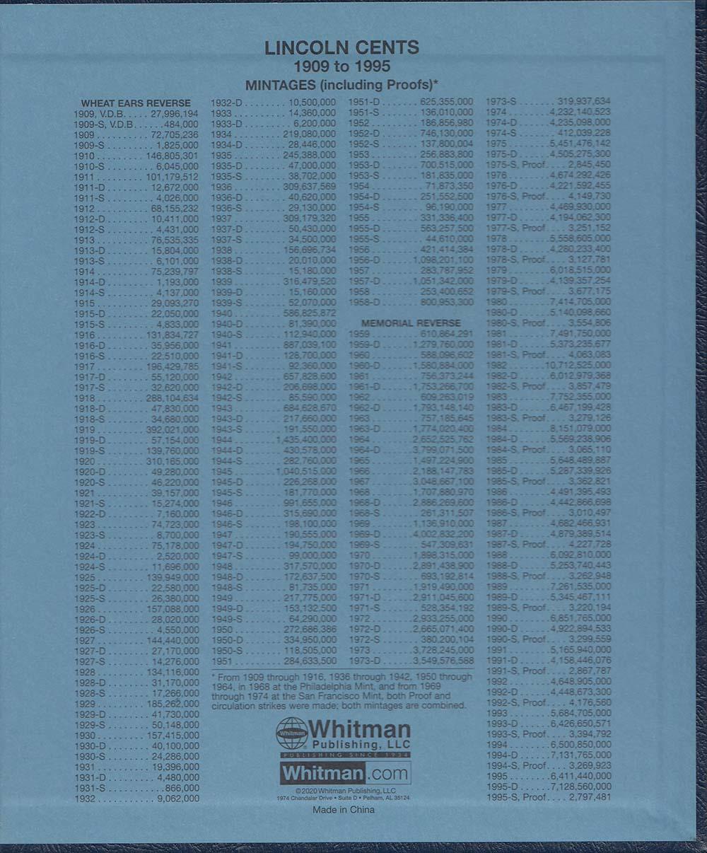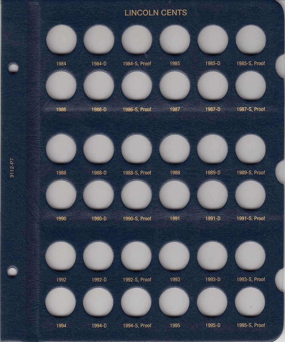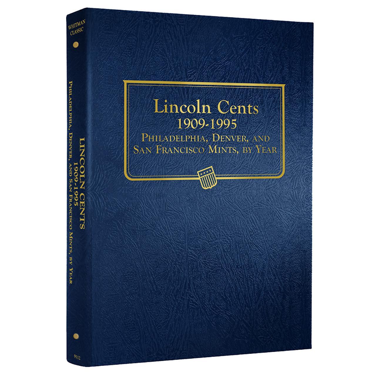 This Whitman Classic Album for Lincoln Cents 1909-1995 (Whitman model number 9112) consists of a dark blue leatherette binder with blue loose-leaf hinged pages. Both the binder and pages are gold stamped. The pages are held in the binder with two posts that screw apart so that pages can be added, removed and replaced with ease and have thumb notches for easy window removal. The album has a data sheet with mintages and other historical information.