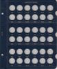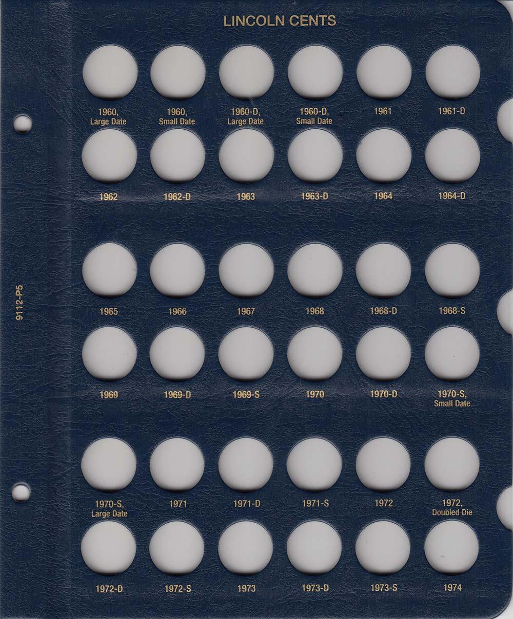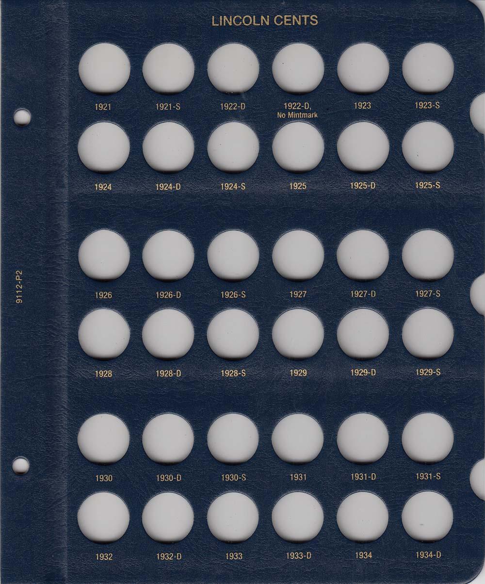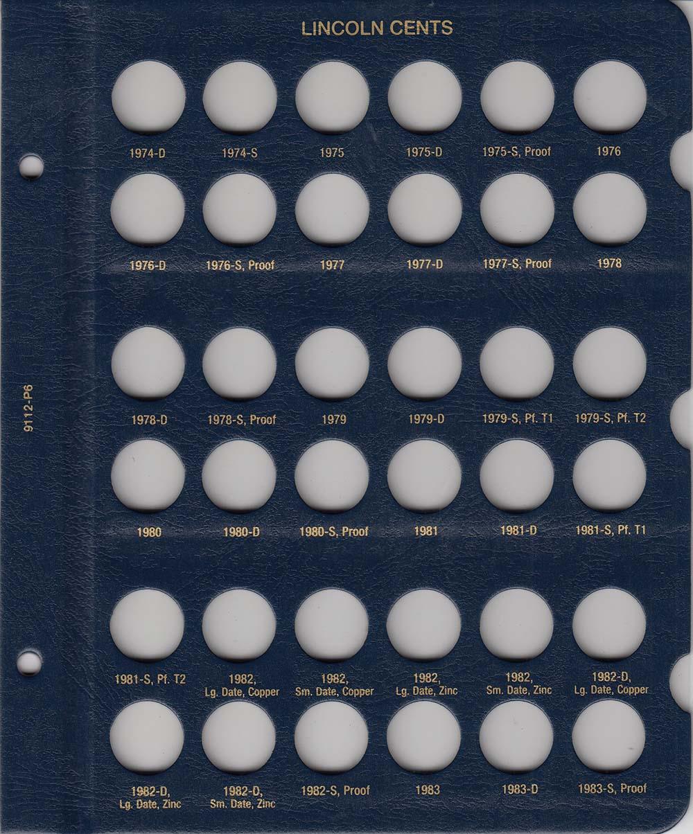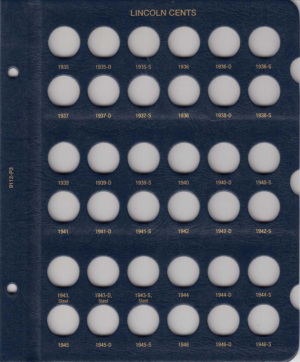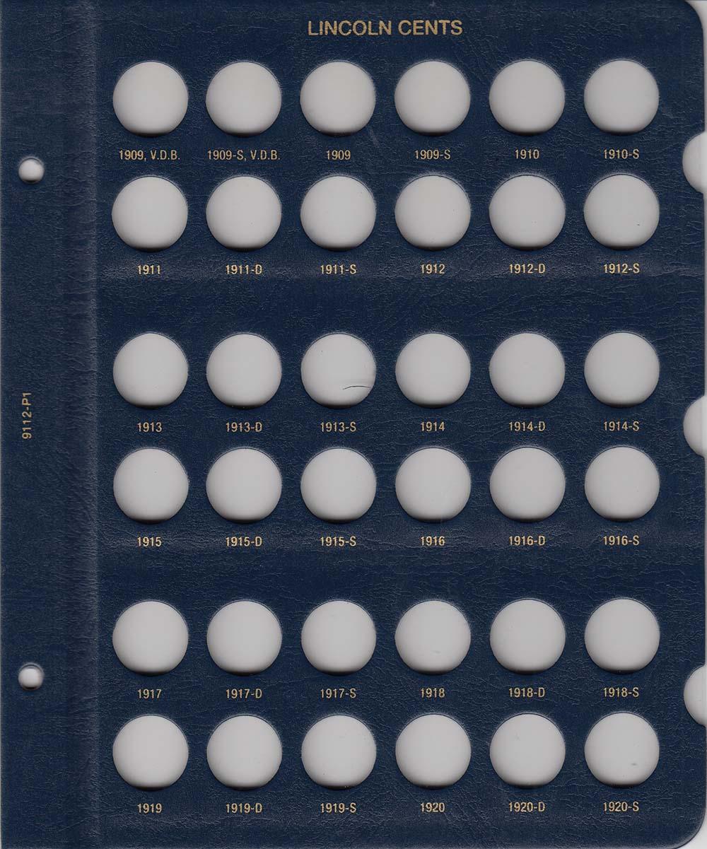This Whitman Classic Album for Lincoln Cents 1909-1995 (Whitman model number 9112) consists of a dark blue leatherette binder with blue loose-leaf hinged pages. Both the binder and pages are gold stamped. The pages are held in the binder with two posts that screw apart so that pages can be added, removed and replaced with ease and have thumb notches for easy window removal. The album has a data sheet with mintages and other historical information.