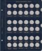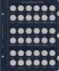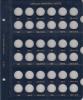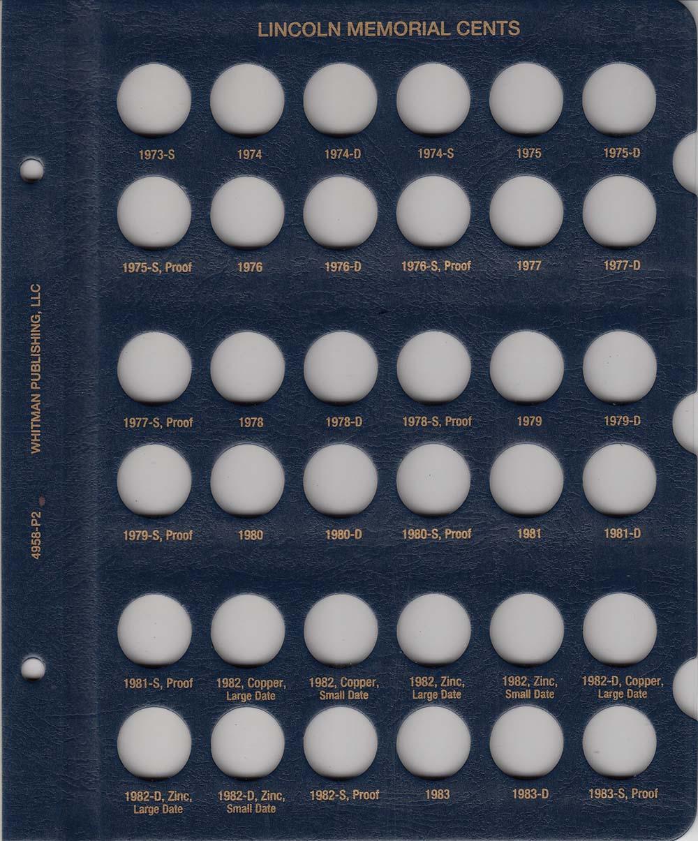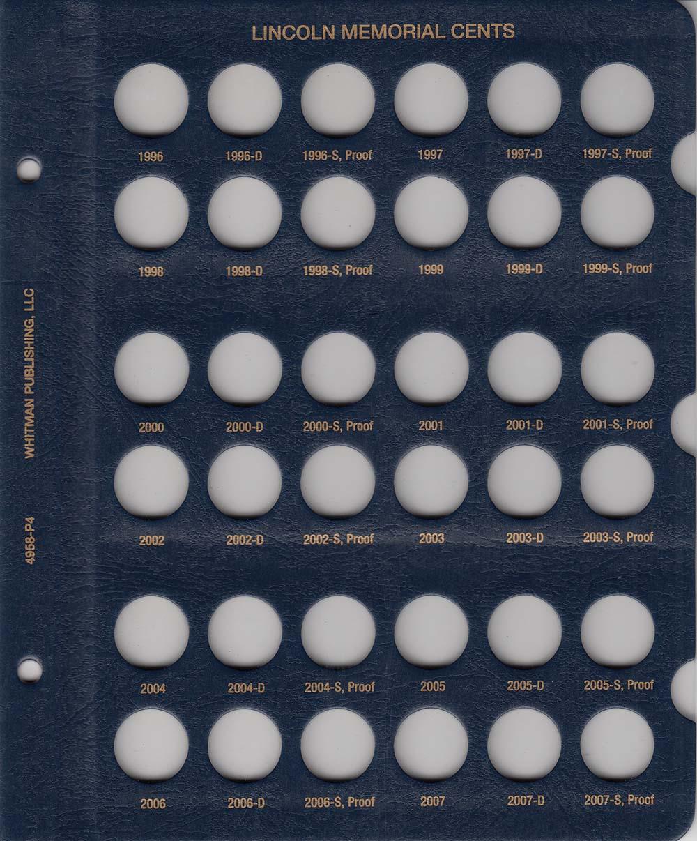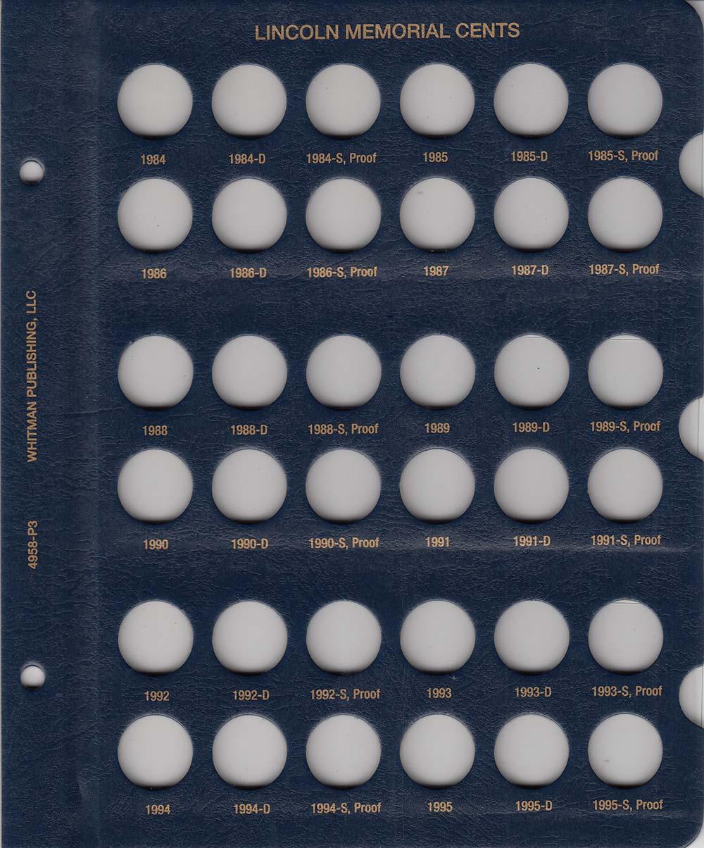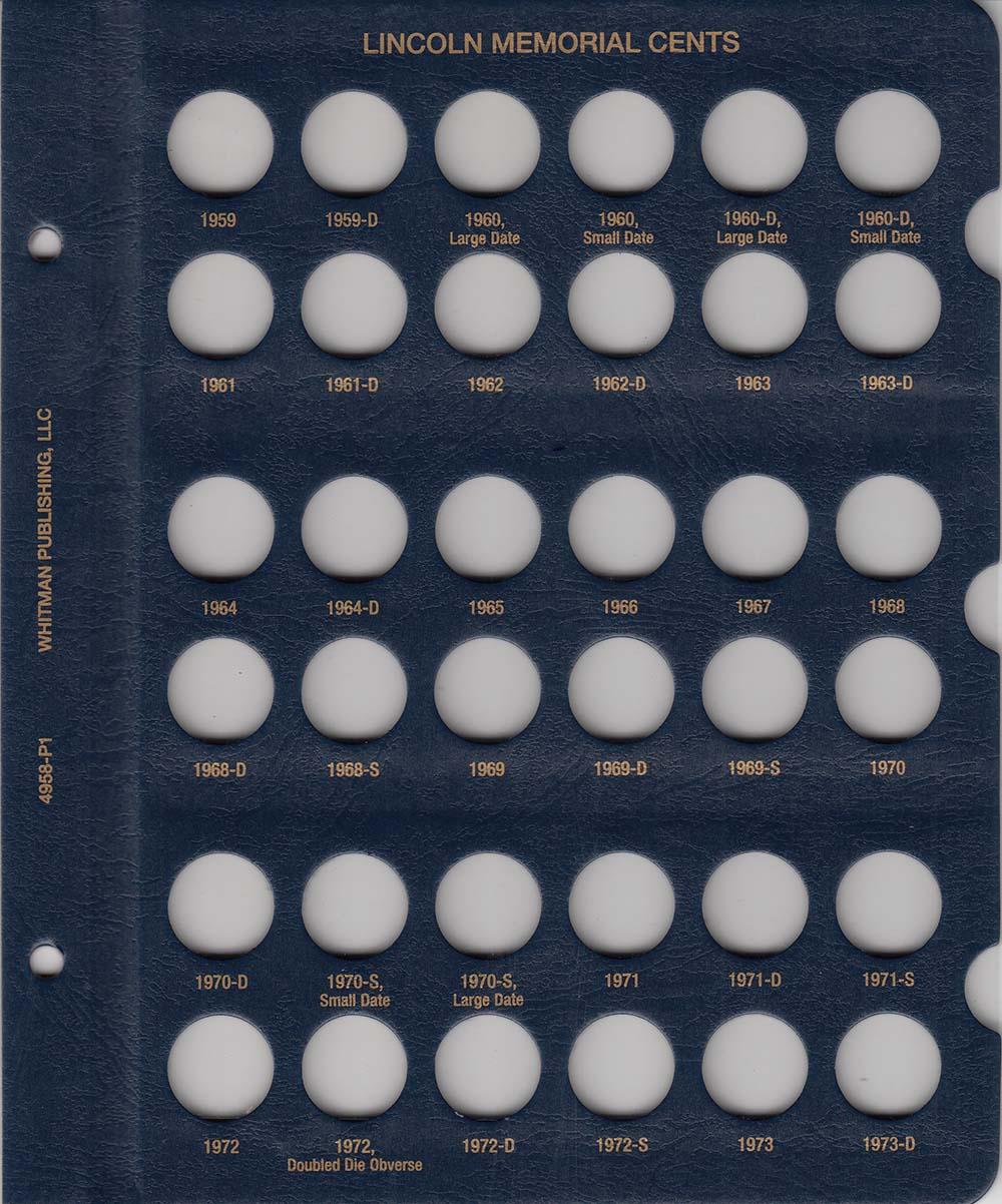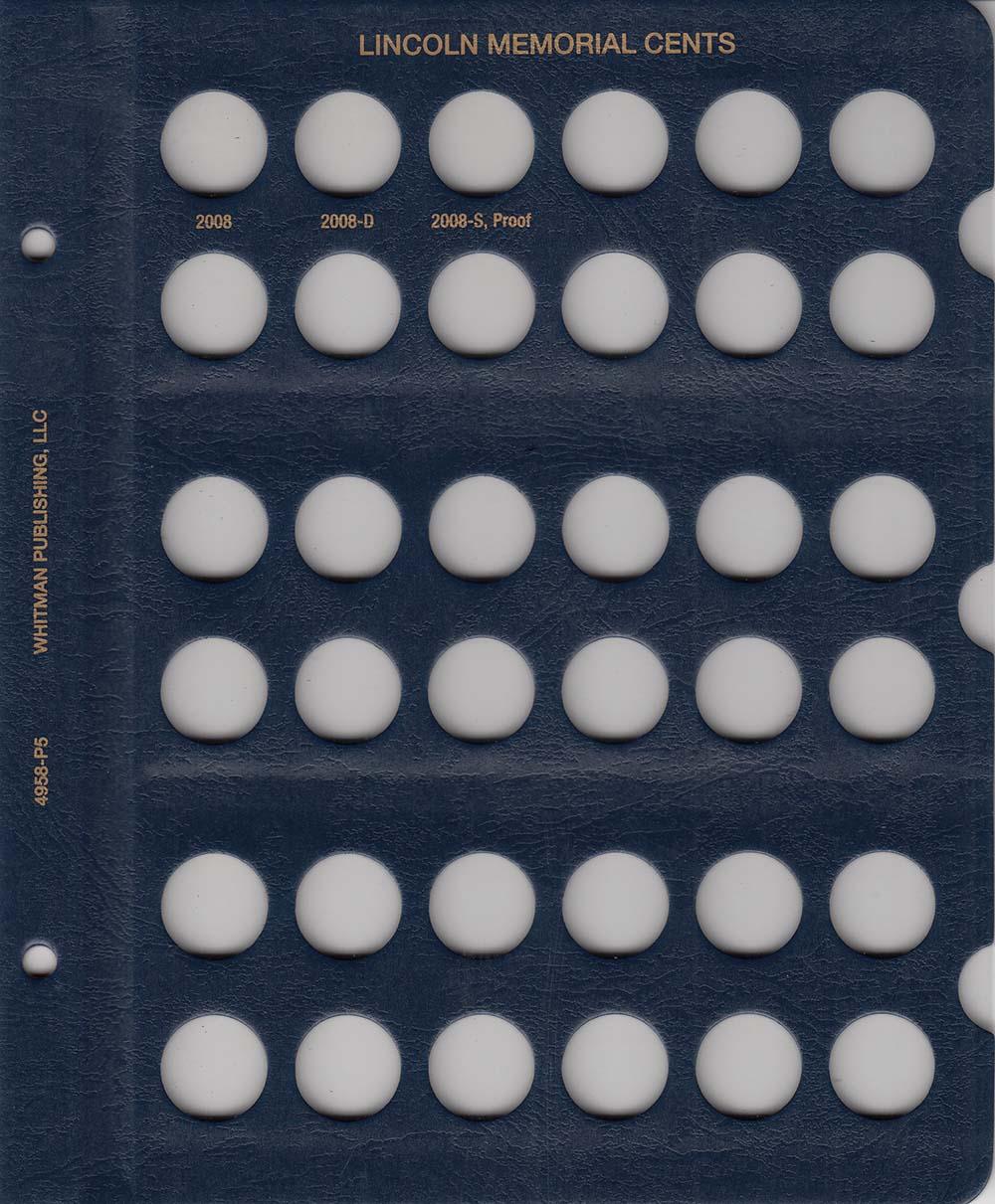 This Whitman Classic Album for Lincoln Cents 1959-2008 (Whitman model number 4958) consists of a dark blue leatherette binder with blue loose-leaf hinged pages. Both the binder and pages are gold stamped. The pages are held in the binder with two posts that screw apart so that pages can be added, removed and replaced with ease and have thumb notches for easy window removal. The album has a data sheet with mintages and other historical information.
