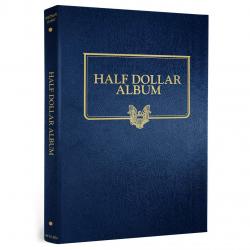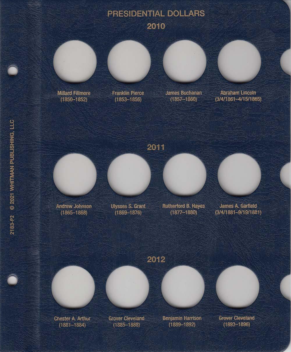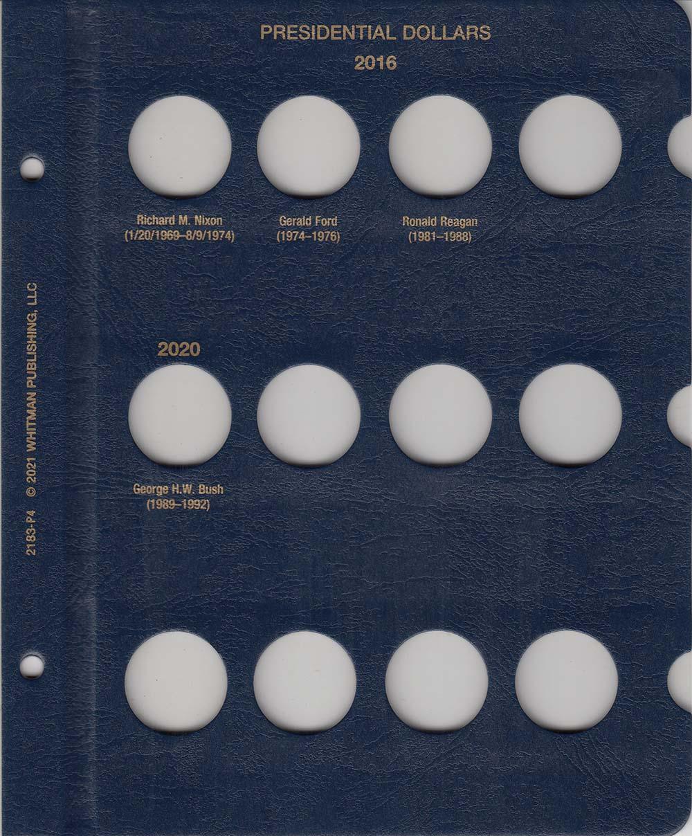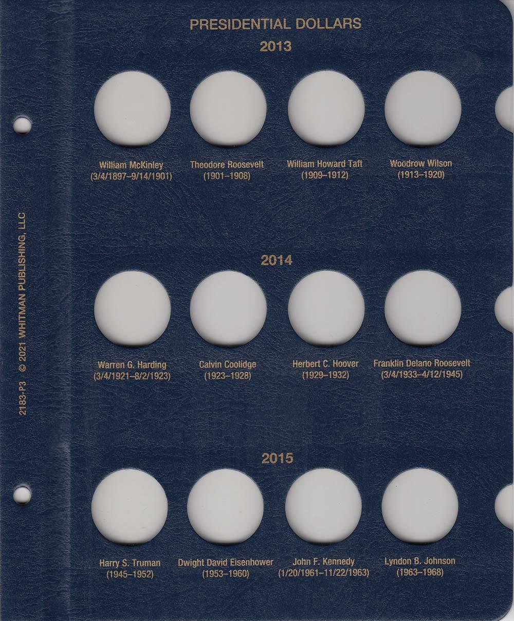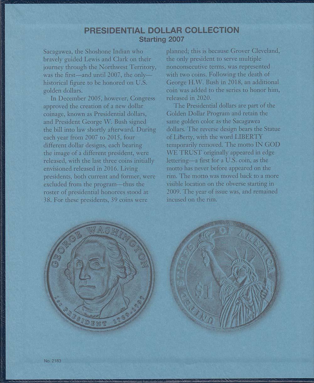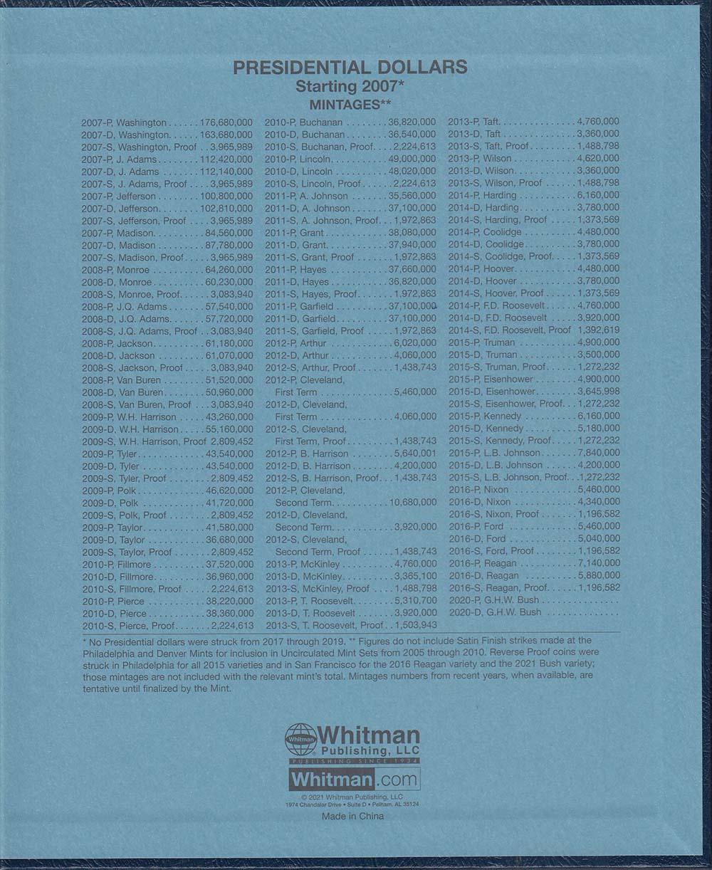 This Whitman Classic Album for Presidential Dollars Date Set 2007-Date consists of a dark blue leatherette binder with blue loose-leaf hinged pages. Both the binder and pages are gold stamped. The pages are held in the binder with two posts that screw apart so that pages can be added, removed and replaced with ease and have thumb notches for easy window removal. The album has a data sheet with mintages and other historical information. In total, the album contains 48 openings covering 2007 through 2020 plus 8 unmarked openings for future releases.
