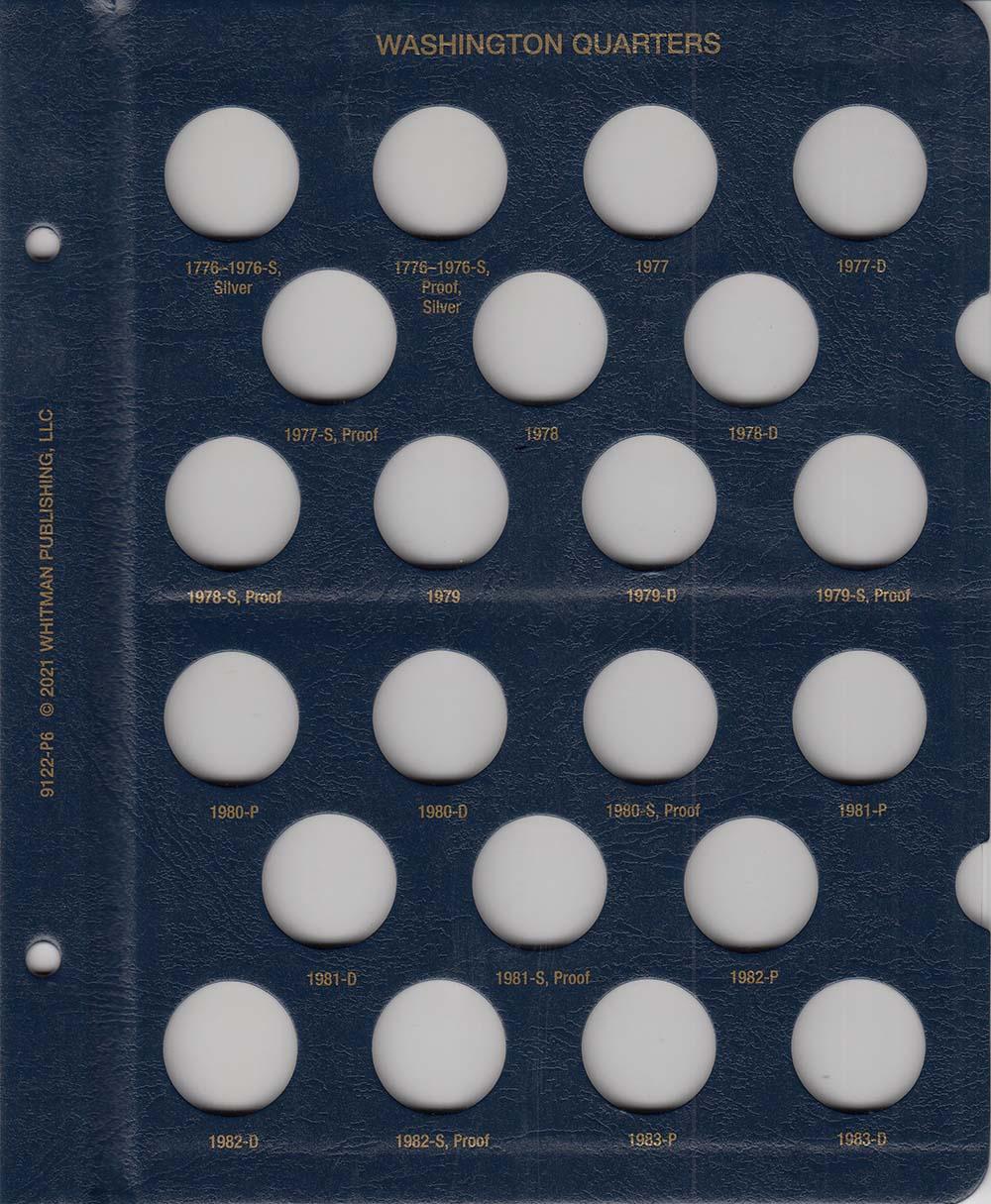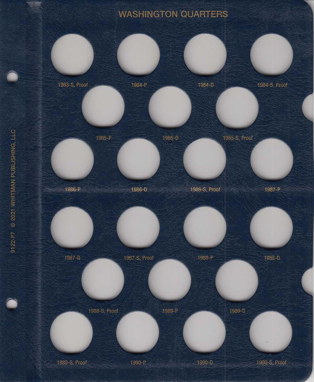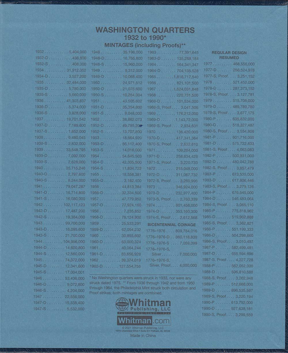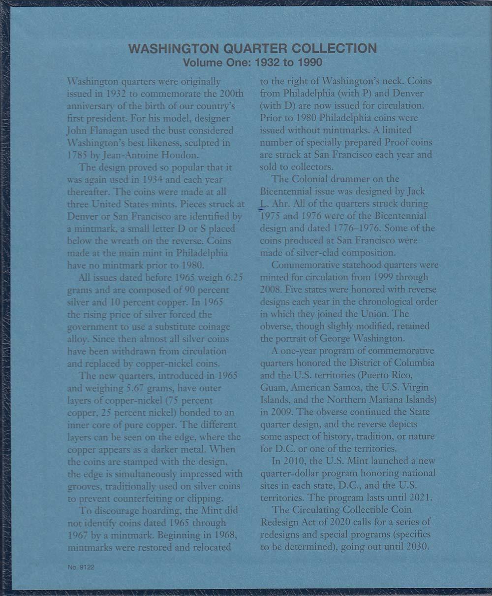 This Whitman Classic Album for Washington Quarters 1932-1990 (Whitman model number 9122) consists of a dark blue leatherette binder with blue loose-leaf hinged pages. Both the binder and pages are gold stamped. The pages are held in the binder with two posts that screw apart so that pages can be added, removed and replaced with ease and have thumb notches for easy window removal. The album has a data sheet with mintages and other historical information.