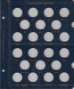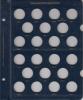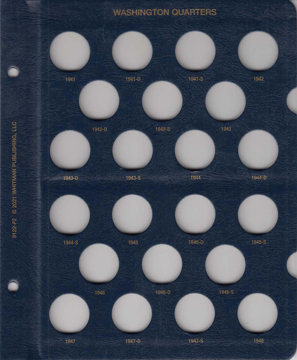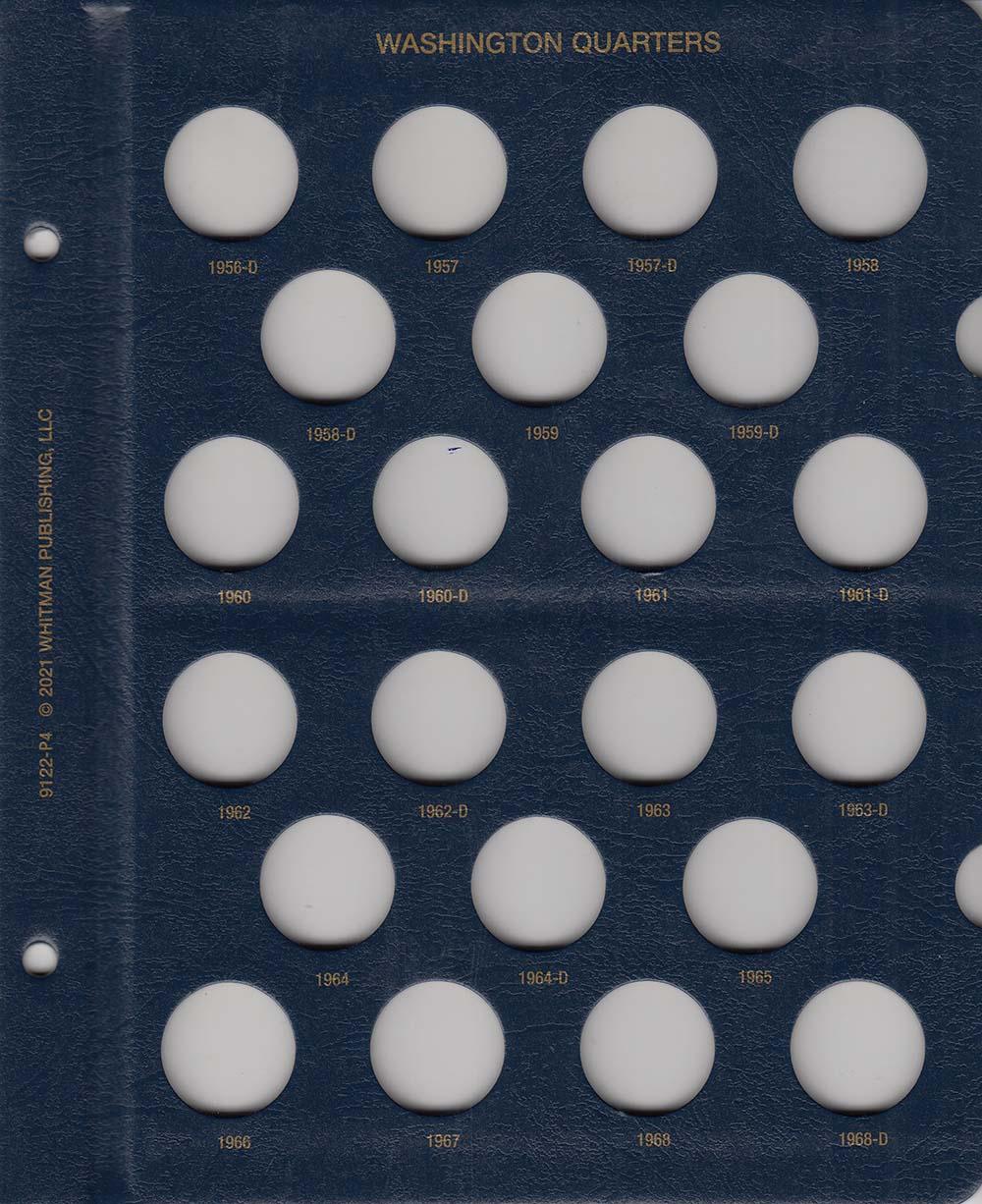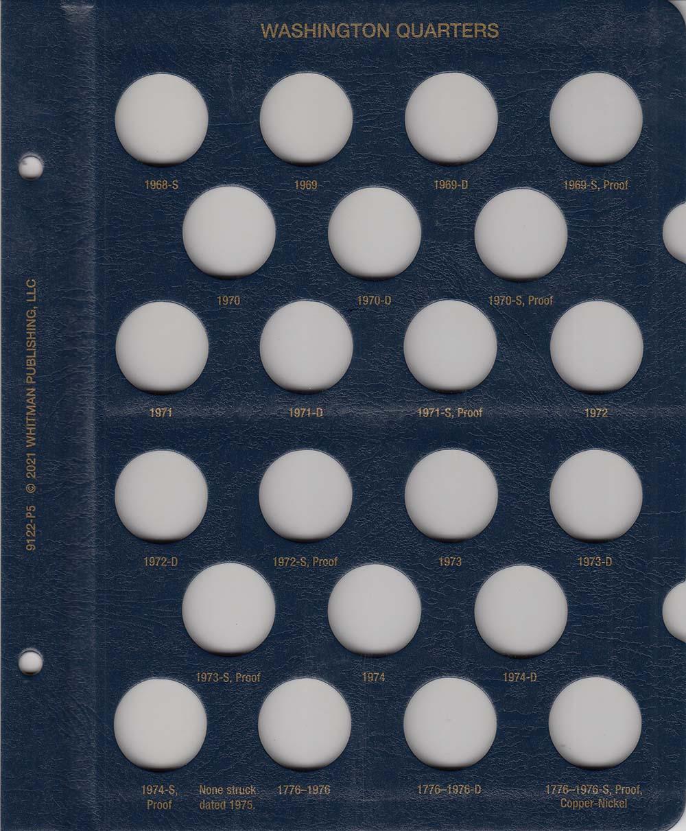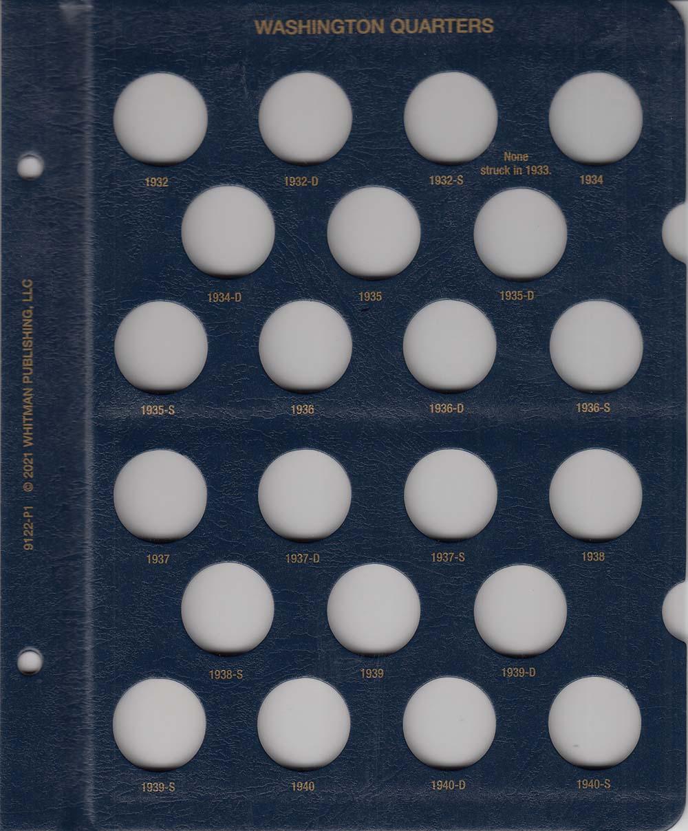 This Whitman Classic Album for Washington Quarters 1932-1990 (Whitman model number 9122) consists of a dark blue leatherette binder with blue loose-leaf hinged pages. Both the binder and pages are gold stamped. The pages are held in the binder with two posts that screw apart so that pages can be added, removed and replaced with ease and have thumb notches for easy window removal. The album has a data sheet with mintages and other historical information.