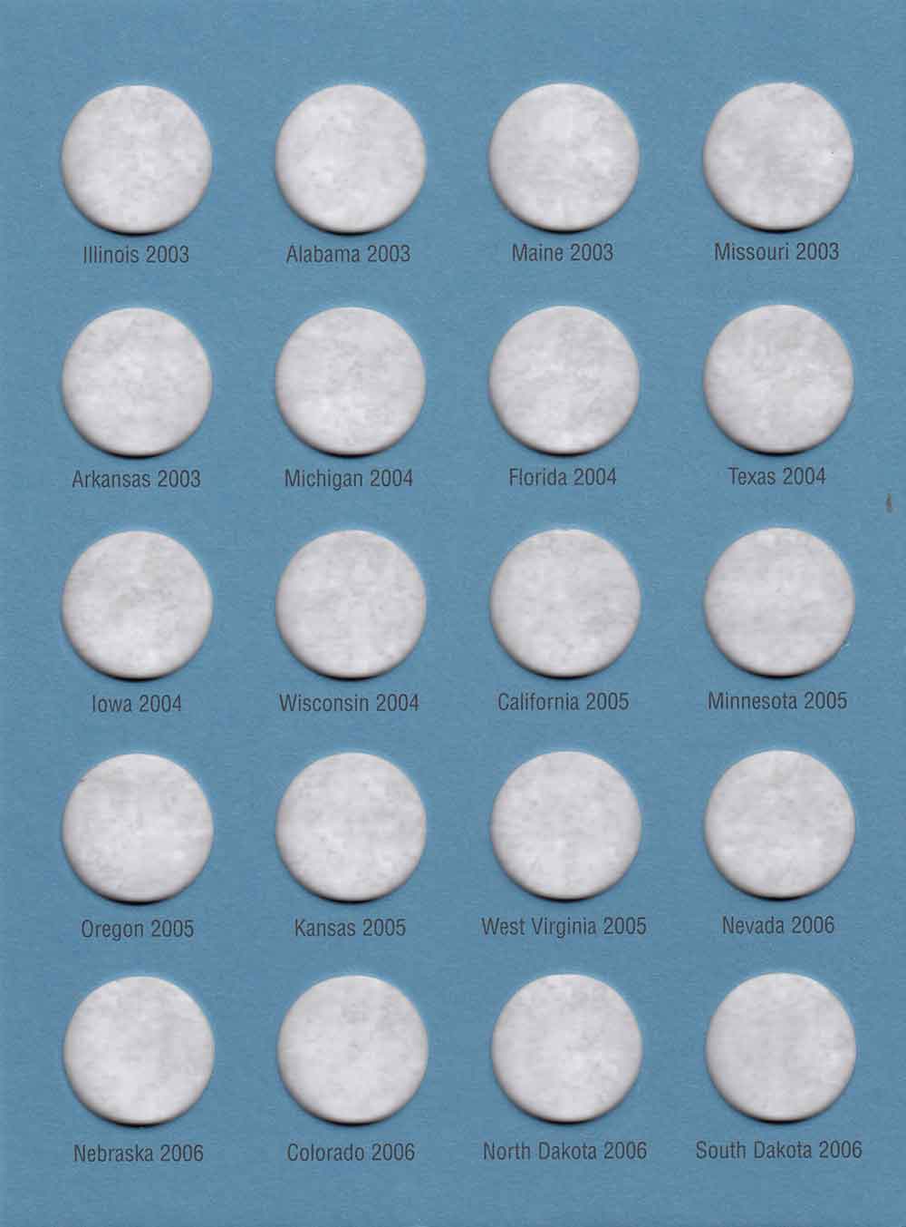 A full color version of the classic Whitman folder with room for one quarter per state. The folder includes holes for the 2009 issues for Washington DC and the Territories (56 total holes). Each folder opens flat so that all coins can be viewed at once. Each folder includes mintage figures and other data for the series.