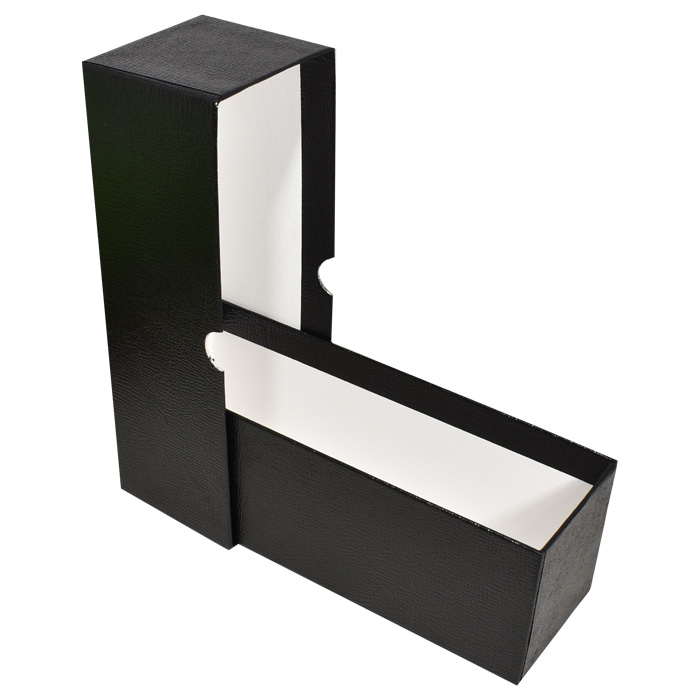 The Guardhouse single row crown box measures 8.25 x 2.63 x 2.87 and holds crown size coins in paper holders. It can also be used to hold certified coins or coin slabs. Manufactured with a high quality textured exterior, the Guardhouse crown box features re-enforced tape filaments, which give the box strength and durability. Unlike other boxes, Guardhouse coin storage boxes are constructed with a high quality interior white board that is wear resistant and will not rub off into fine paper dust residue over time. This black standard Guardhouse box is designed to fully enclose the crown size paper coin holders, and is ideal when storing and organizing coins.