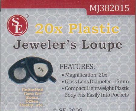 This compact, lightweight plastic jewelers loupe will fit handily in your pocket when not in use. The 15mm diamater lens provides 20X magnification.