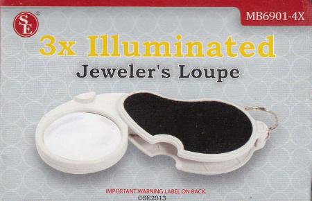 This plastic bodied loupe has a keychain attachment. The fold out 1 3/4 inch diameter lens provides 3X magnification. Two CR1620 batteries (included) power a super bright white LED.