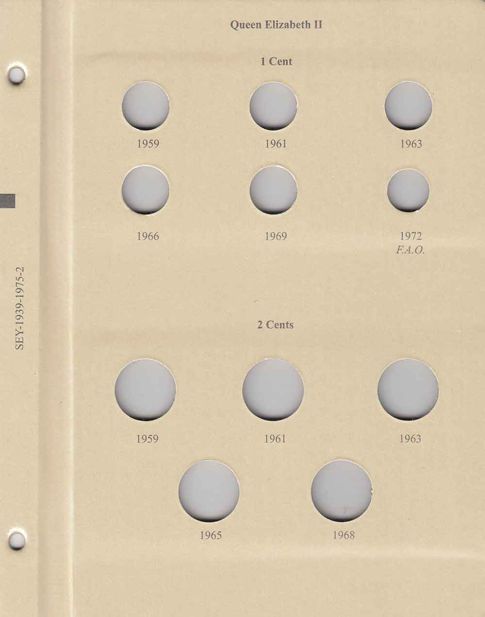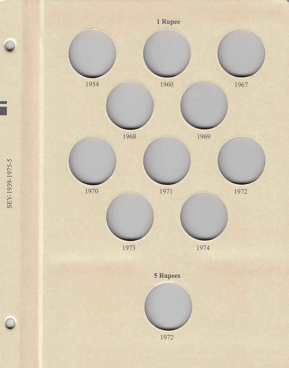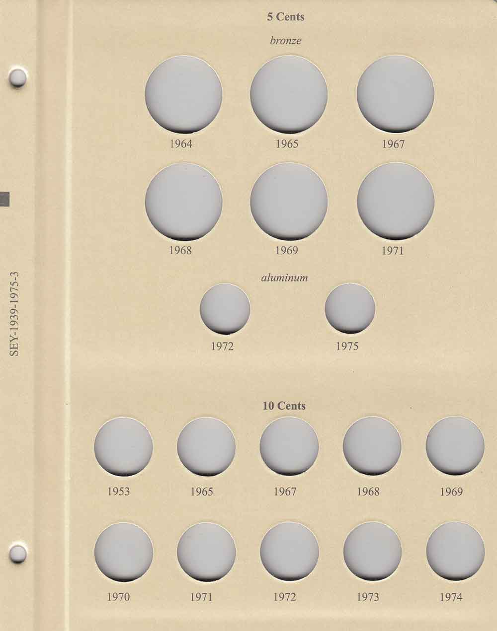 This album consists of 5 pages and contains a total of 75 slots. These slots are designed to house coins issued by Seychelles between 1939 and 1975, with the correct diameters and dates for all known varieties.