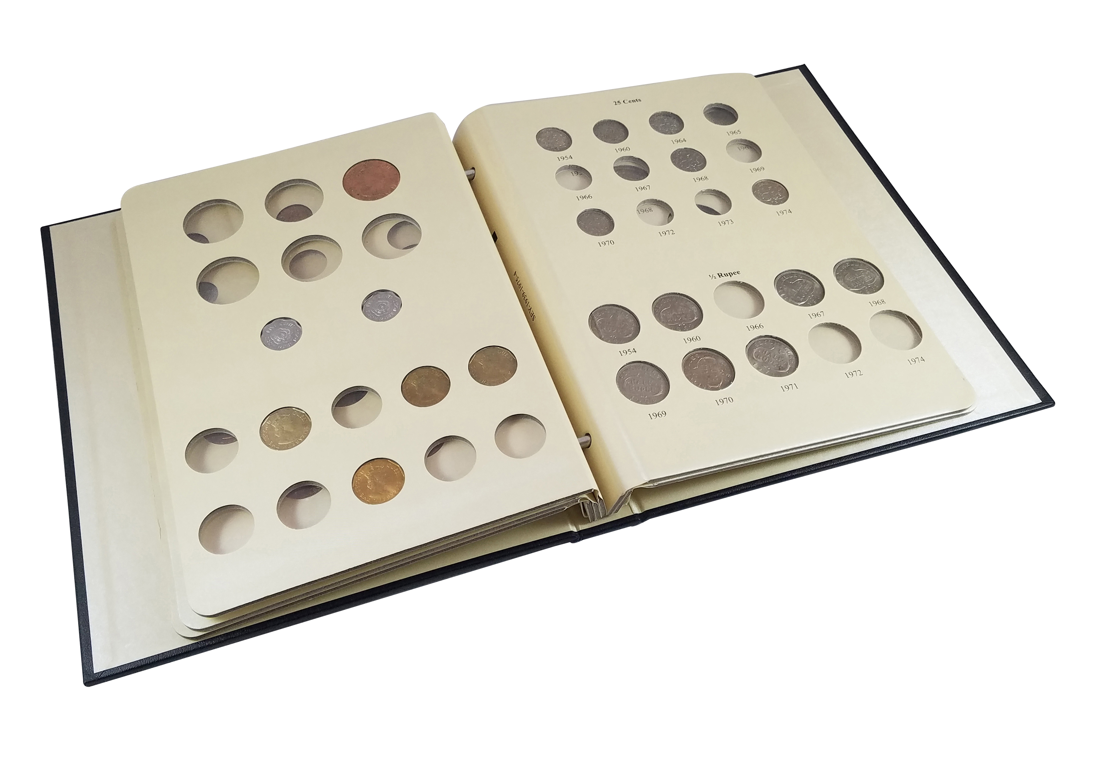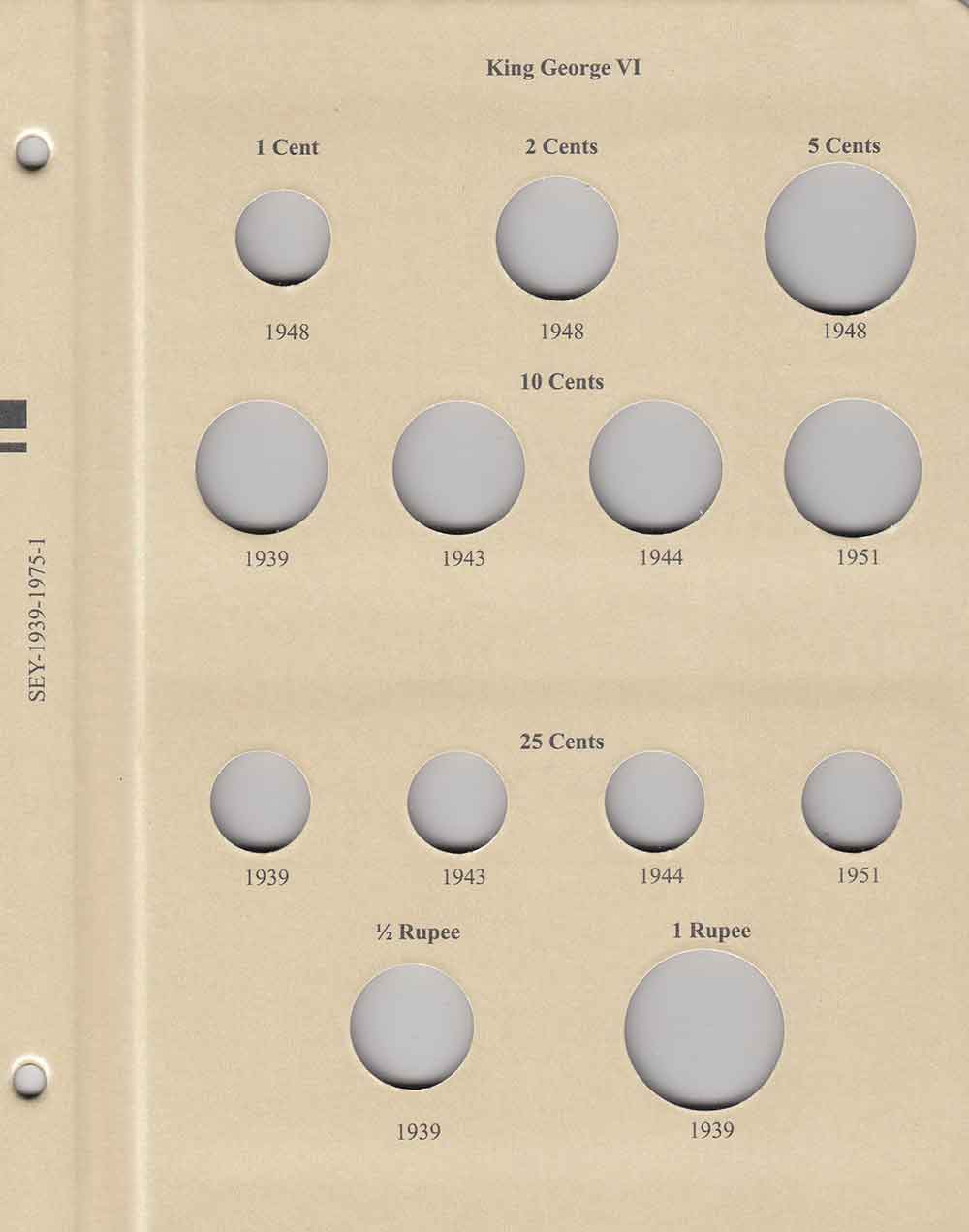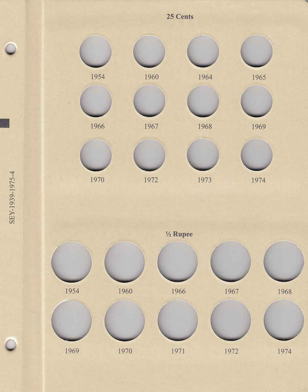 This album consists of 5 pages and contains a total of 75 slots. These slots are designed to house coins issued by Seychelles between 1939 and 1975, with the correct diameters and dates for all known varieties.
