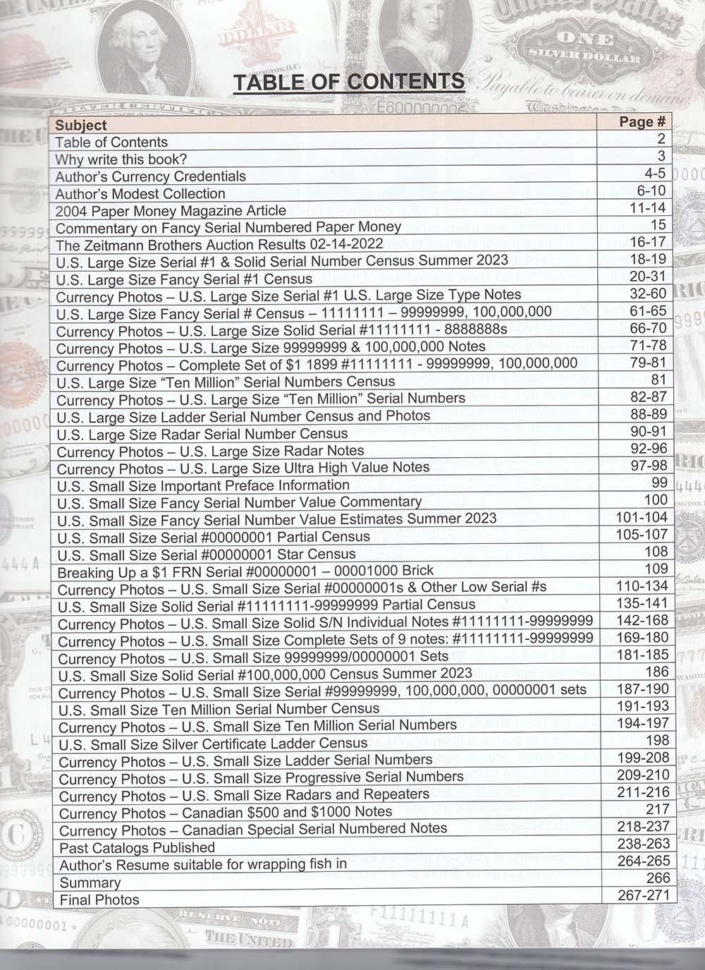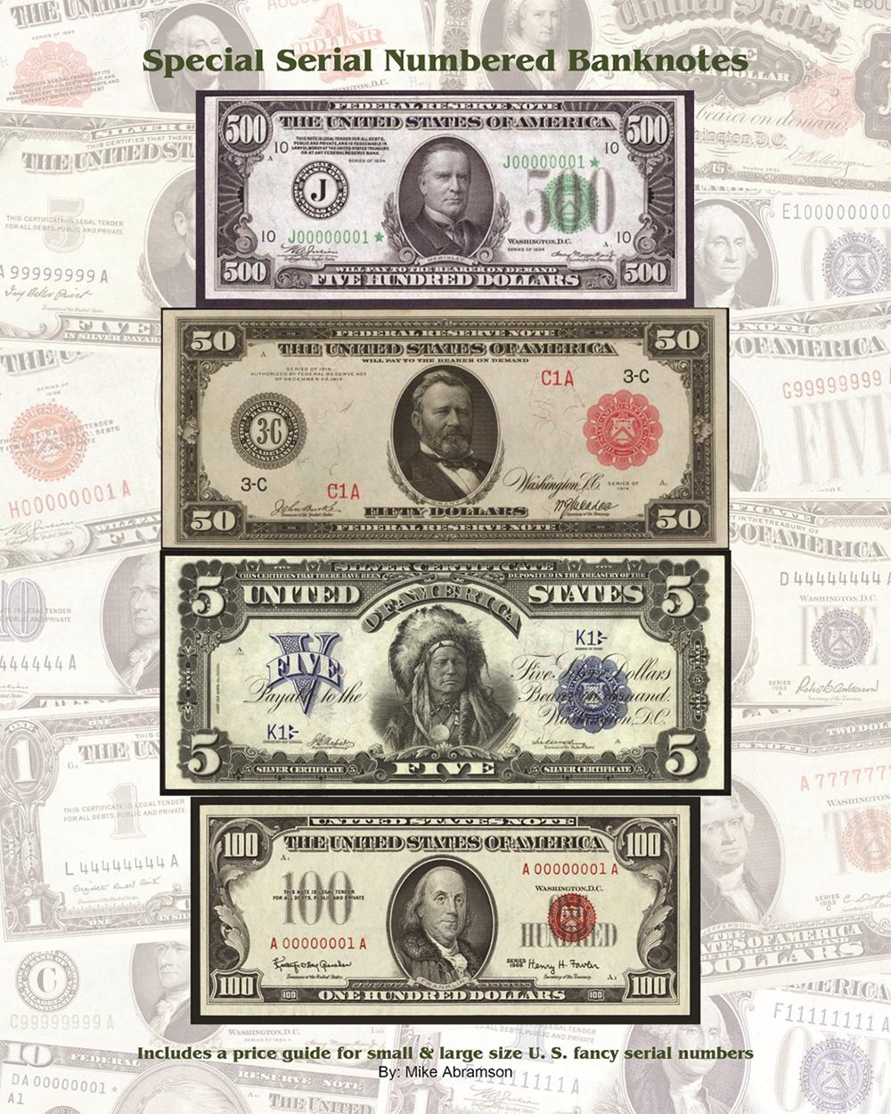 The new industry standard guidebook to special serial numbered U.S. Currency. This 270 page book features both a historical and current set of price guidelines as to the value of both Large Size and Small Size U.S. Type Notes with fancy serial numbers. The book contains over 500 color photos of the rarest banknotes that have been sold over the past eight decades. The book addresses the values of Ultra Low Serial Numbers, Solid Serial Numbers, Ladder Serials, Progressive, Radars, Repeaters and others.