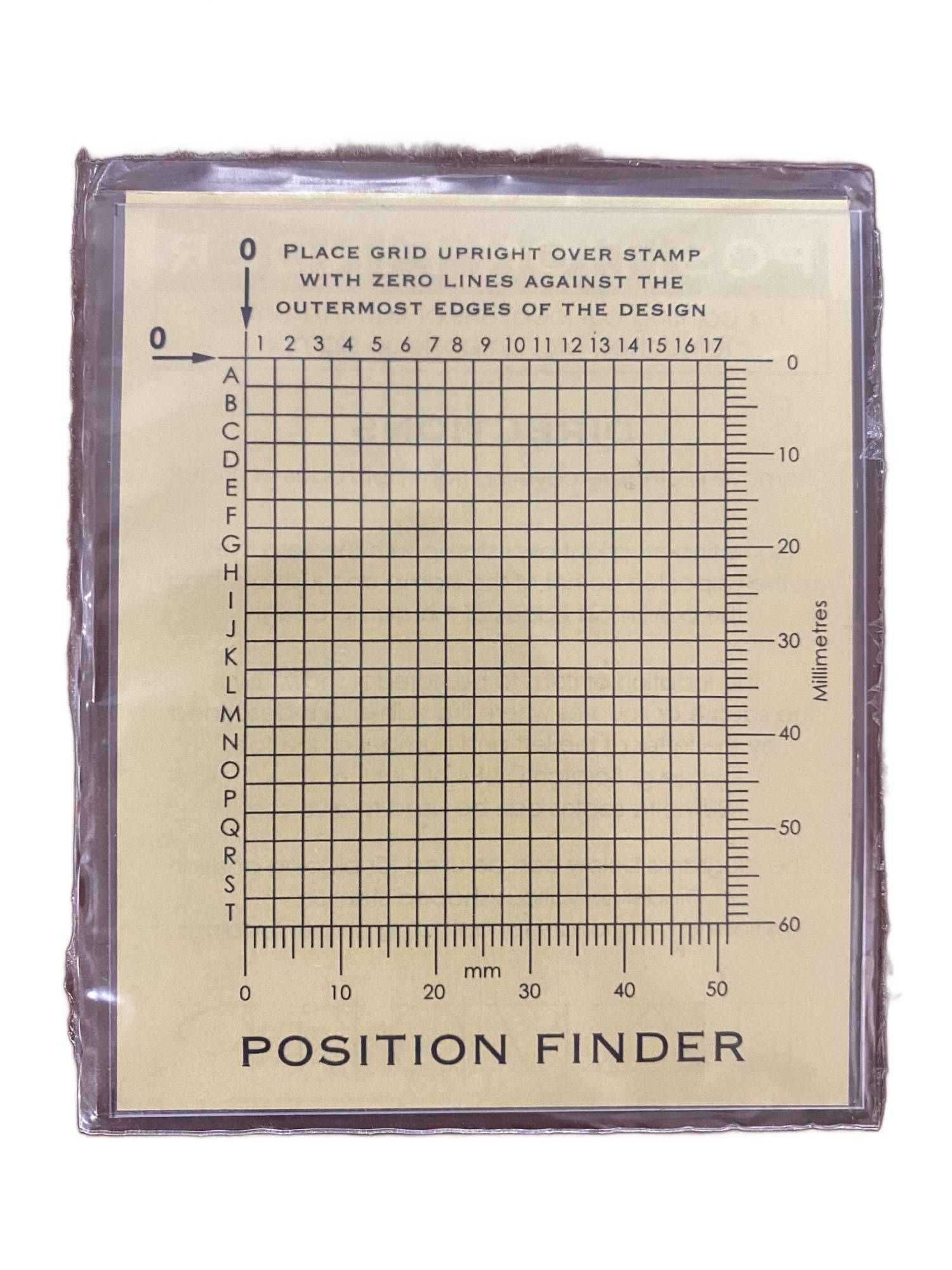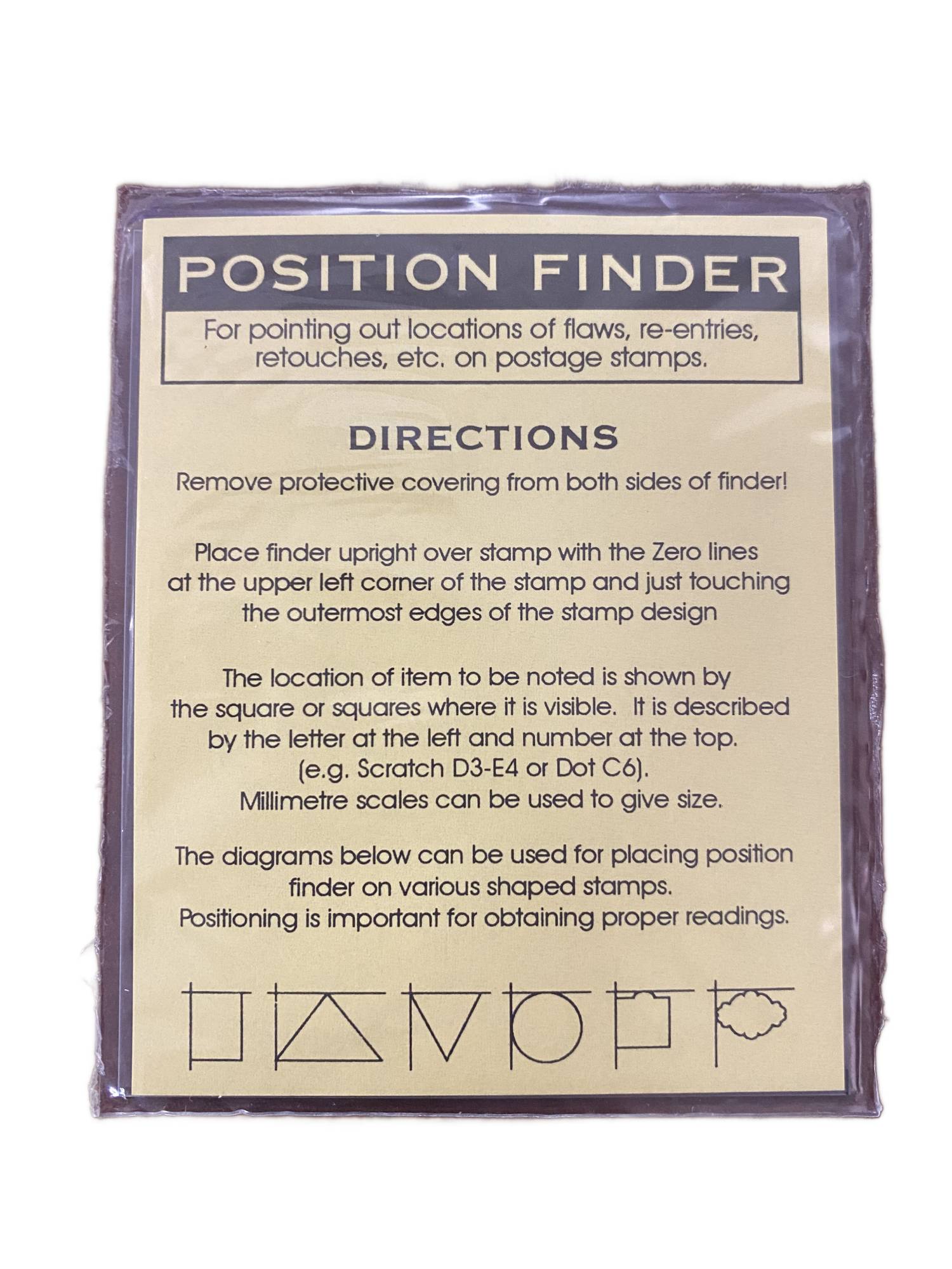 Unitrade's Position Finder is a lettered and numbered grid that is engraved in reverse on a clear transparent material. It is a useful gadget that is simple to use and easy to understand. It provides a standard indicator of every point in the printing of a stamp design via correspondence, books and press writings. Comes supplied with full instructions on how to use.