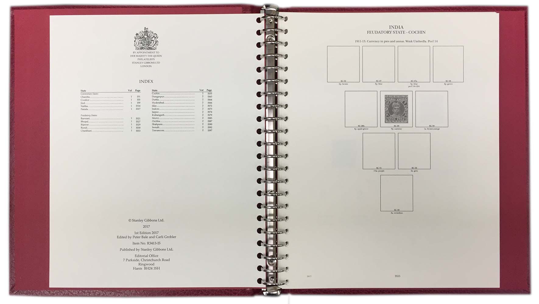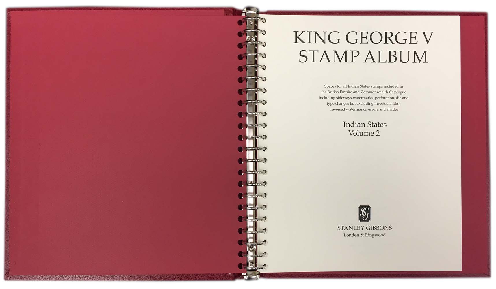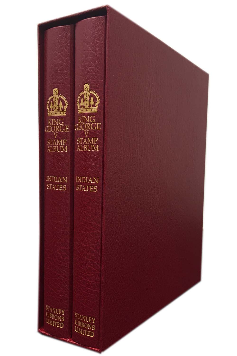 The King George V Indian States 1910-1936 is presented in a two volume set of luxury padded binders, housed in one slipcase. All albums are handmade with a 22-Ring mechanism to securely hold your collection and comes supplied with a matching slipcase. Pre-printed on cream acid free paper with spaces for all main SG numbers as per our Commonwealth and Empire stamp catalogue 1840-1970. There are spaces for all Postage, Air Due, Postal Fiscal and Official Stamps, Perforation and watermark changes including sideways but not inverted or reversed, different plates, Types and Dies, Shades and varieties are not included. SG Numbers as per the Commonwealth & British Empire catalogue.