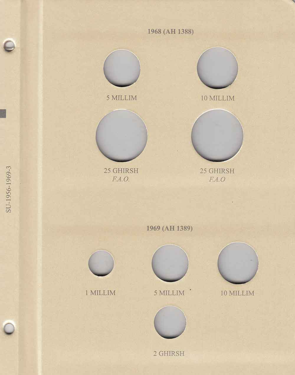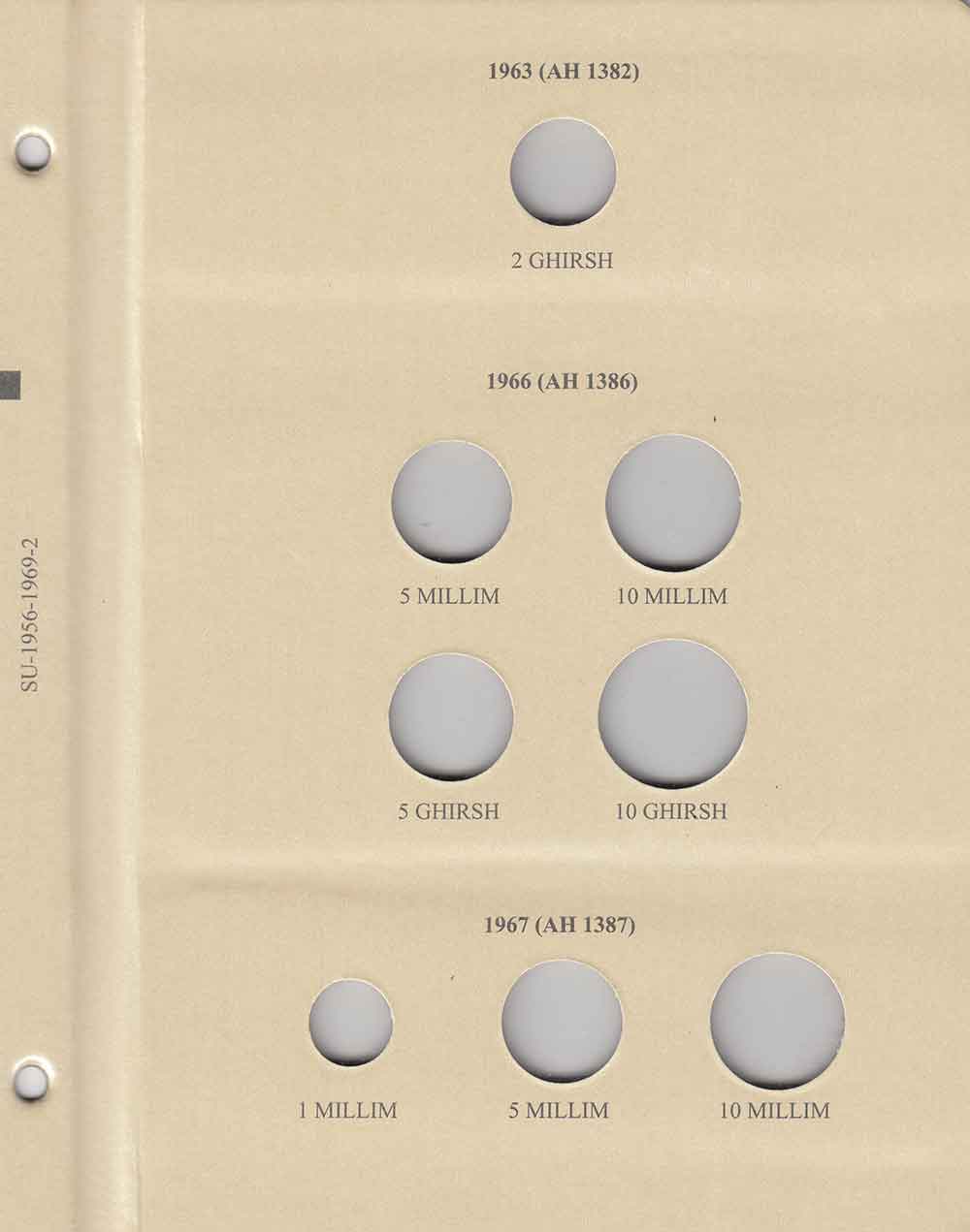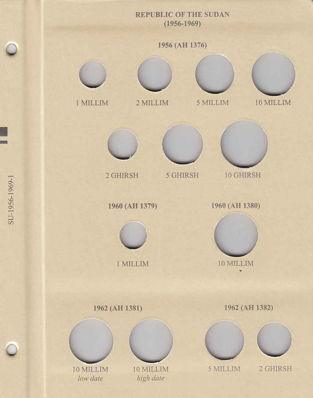 This album consists of 5 pages and contains a total of 53 slots. These slots are designed to house coins issued by Sudan between 1956 and 1969, with the correct diameters and dates for all known varieties.