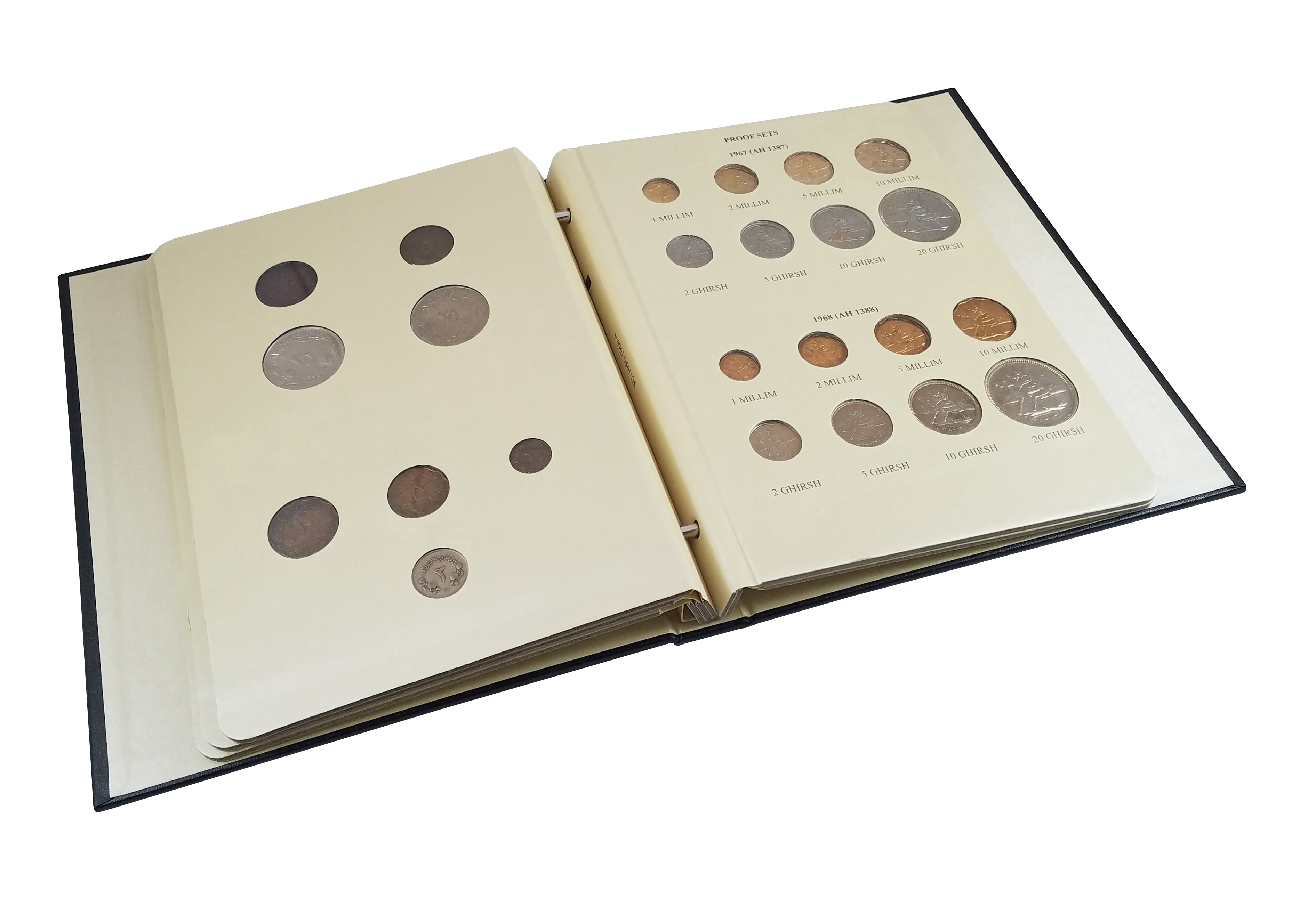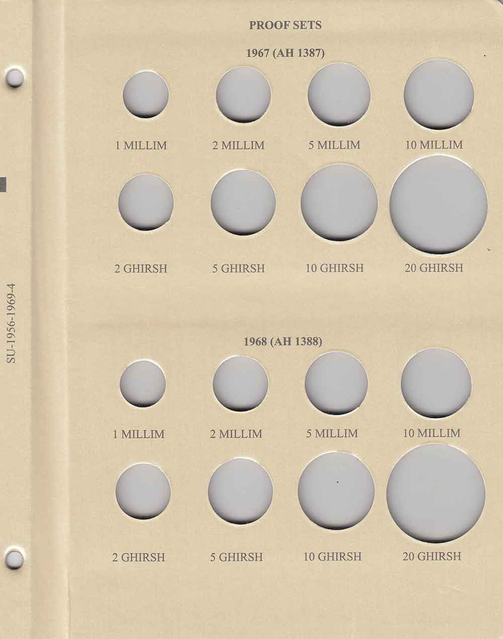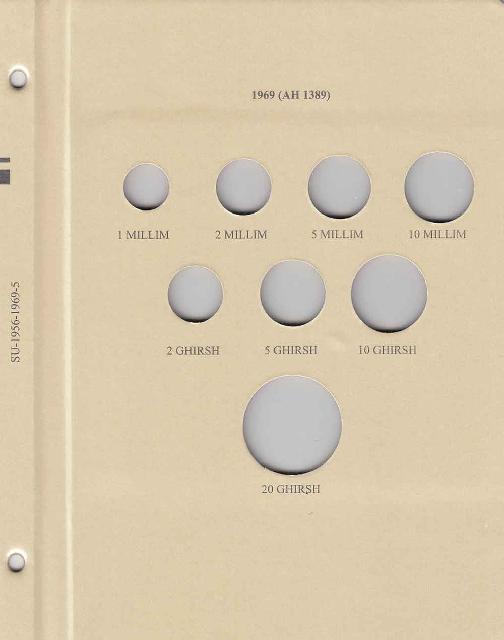 This album consists of 5 pages and contains a total of 53 slots. These slots are designed to house coins issued by Sudan between 1956 and 1969, with the correct diameters and dates for all known varieties.