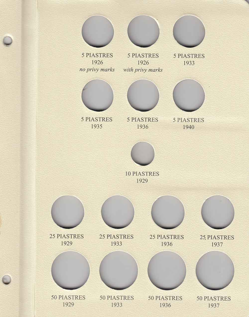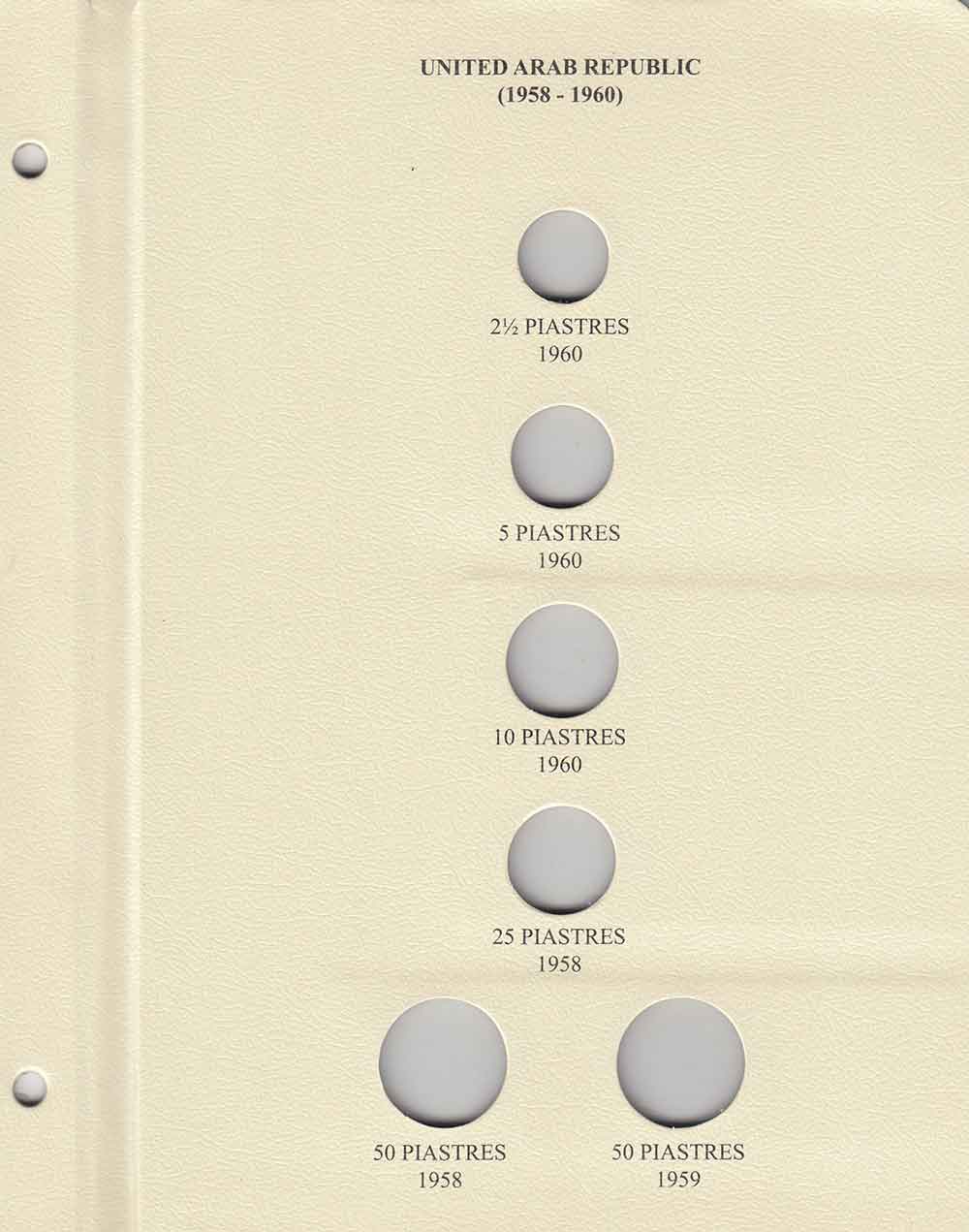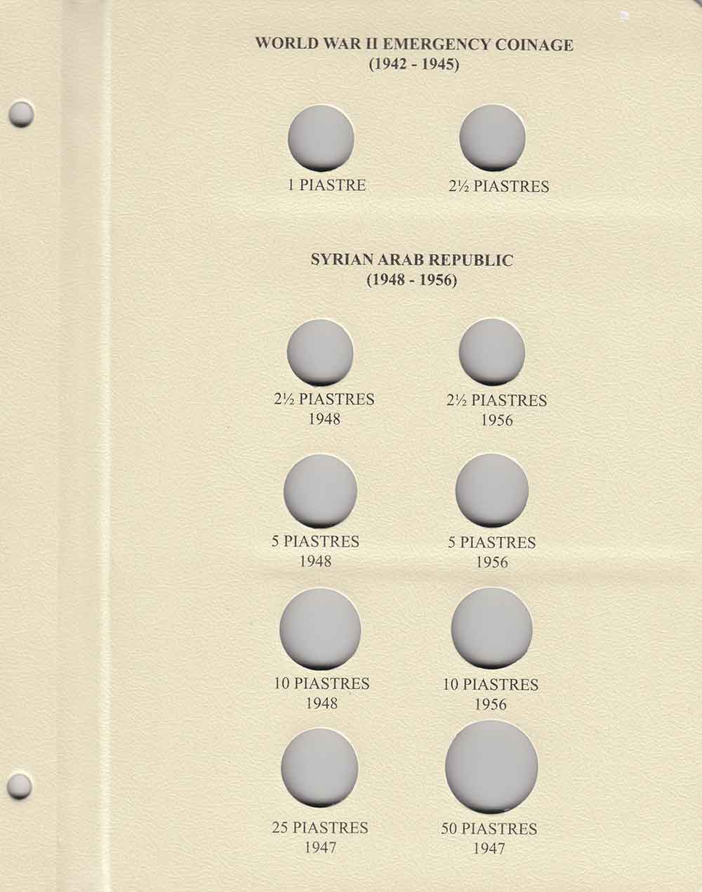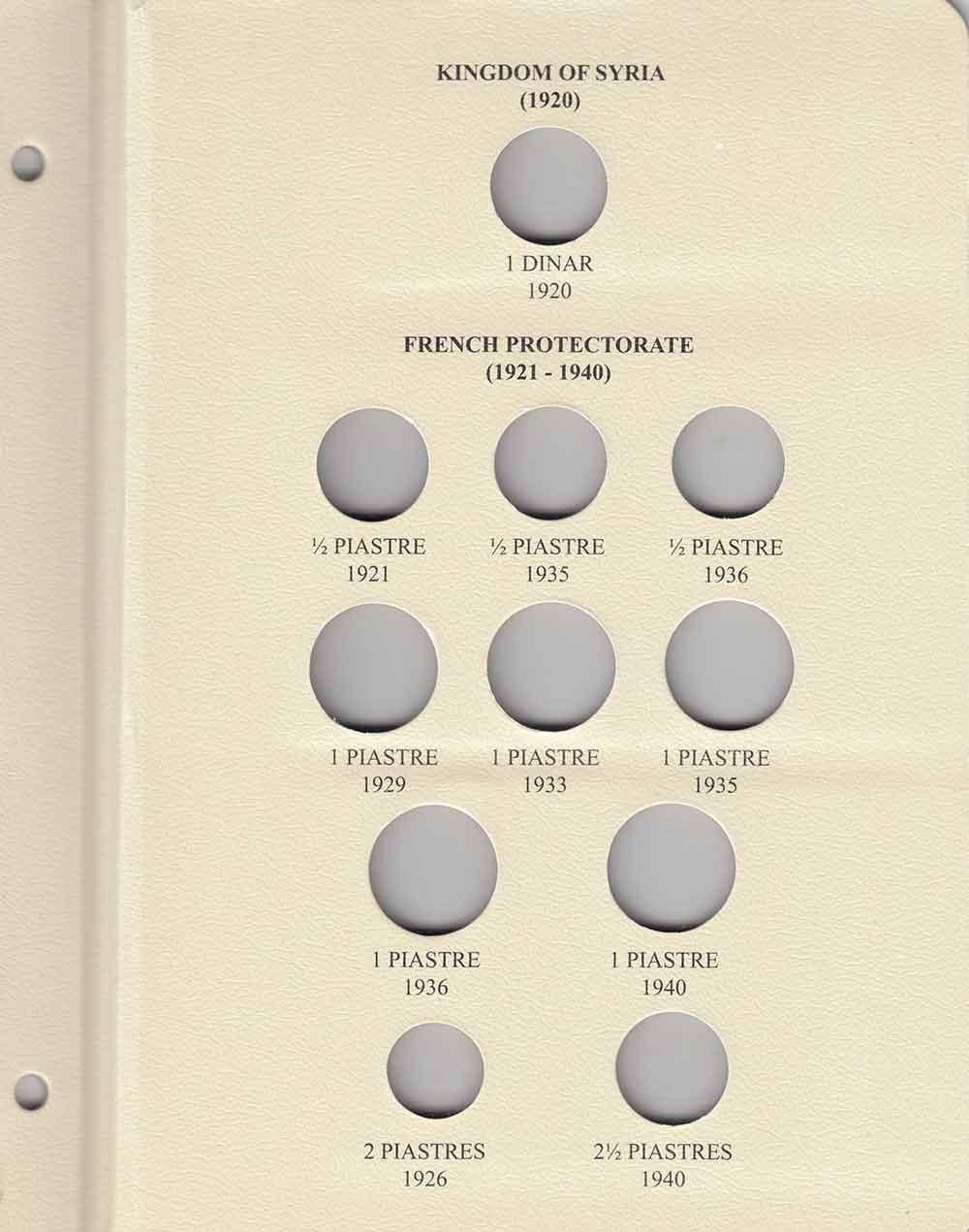 This album consists of 5 pages and contains a total of 45 slots. These slots are designed to house coins issued by Syria between 1920 and 1960, with the correct diameters and dates for all known varieties.