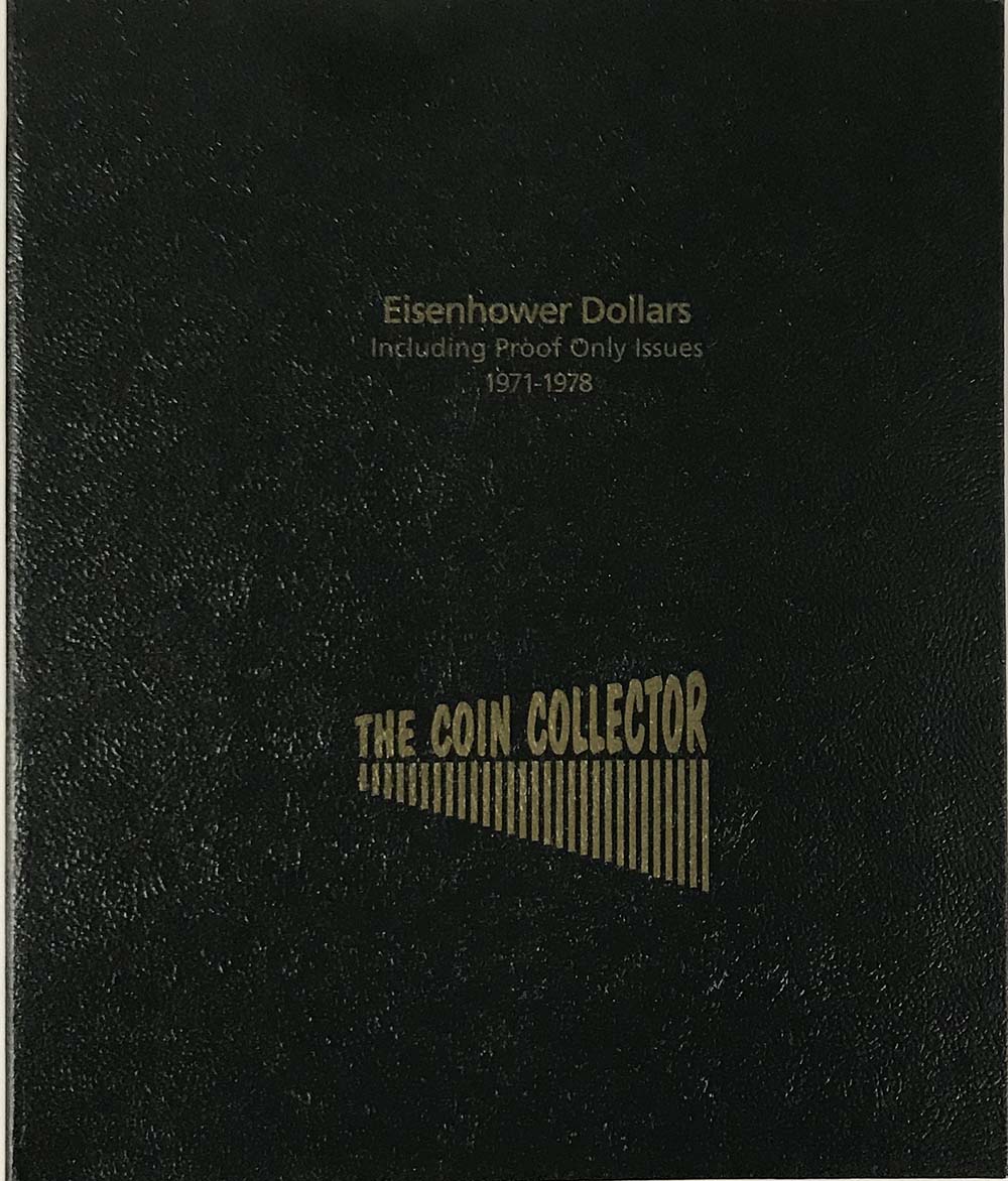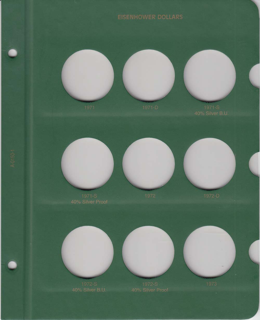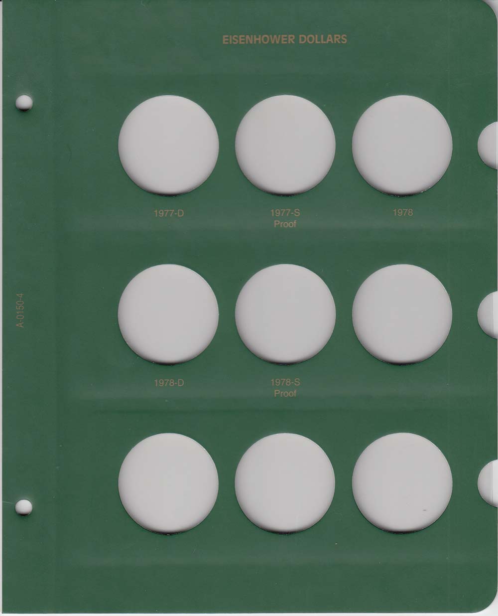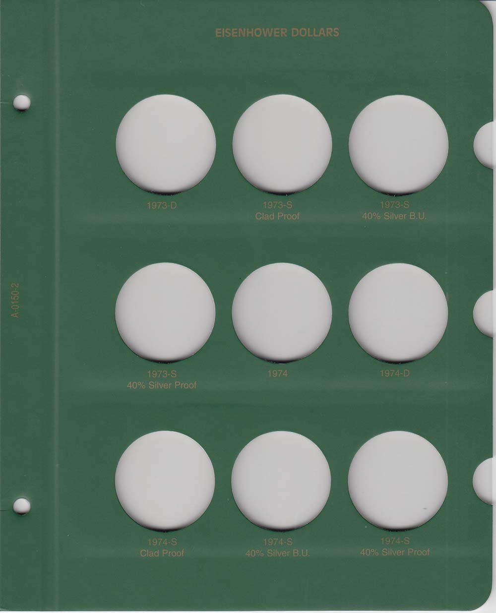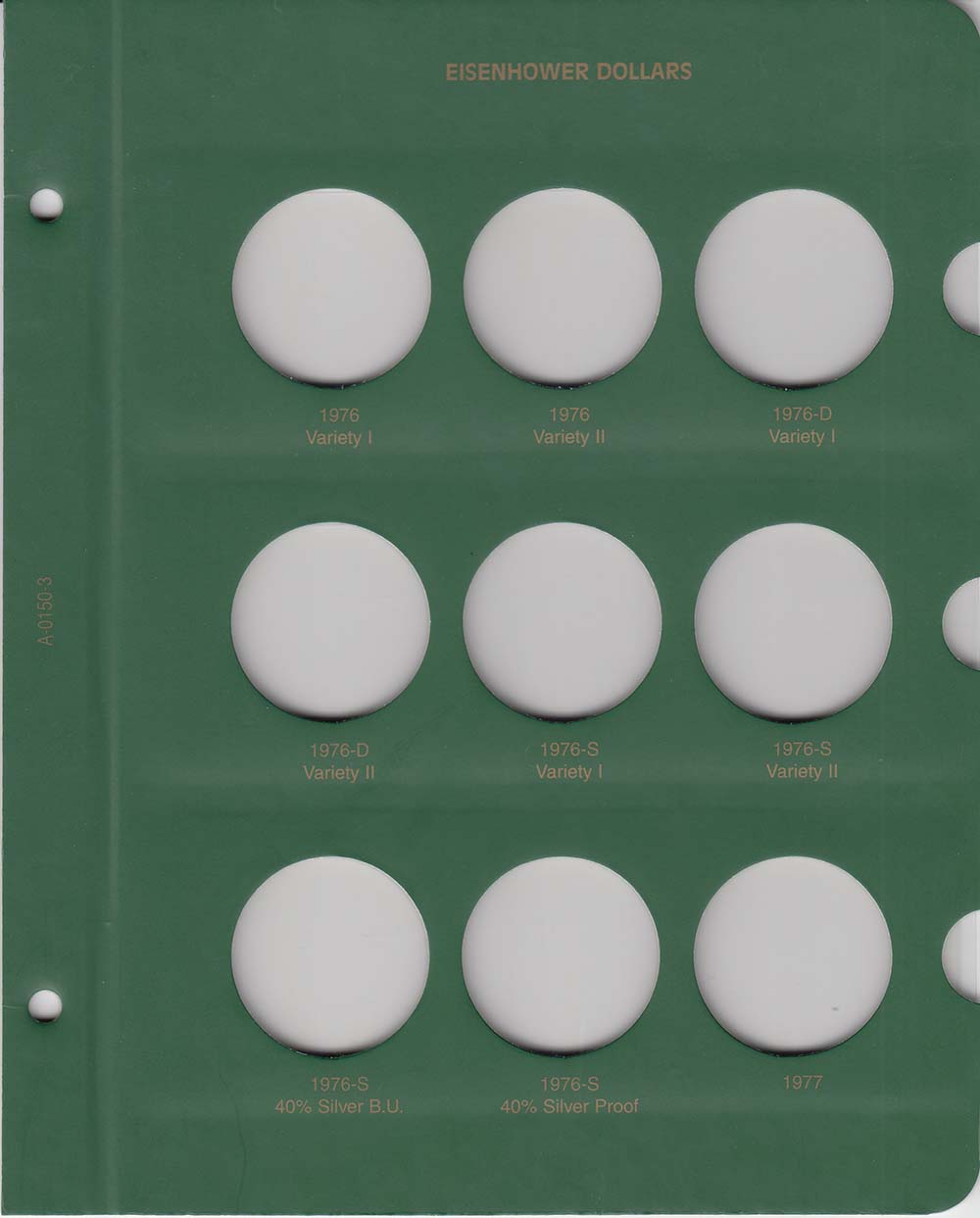 The album has slots for each of the regular issue Eisenhower Dollars from 1971 to 1978 including the P-mint and D-mint coins from each year, the regular clad proofs from 1973 to 1978, the 40% silver S-mint proofs from 1971 to 1974 and 1976, the 40% silver S-mint uncirculated coins from 1971 to 1974 and 1976, and both Type 1 and Type 2 varieties for the 1976 coins (P, D and S). There are 4 additional blank slots.