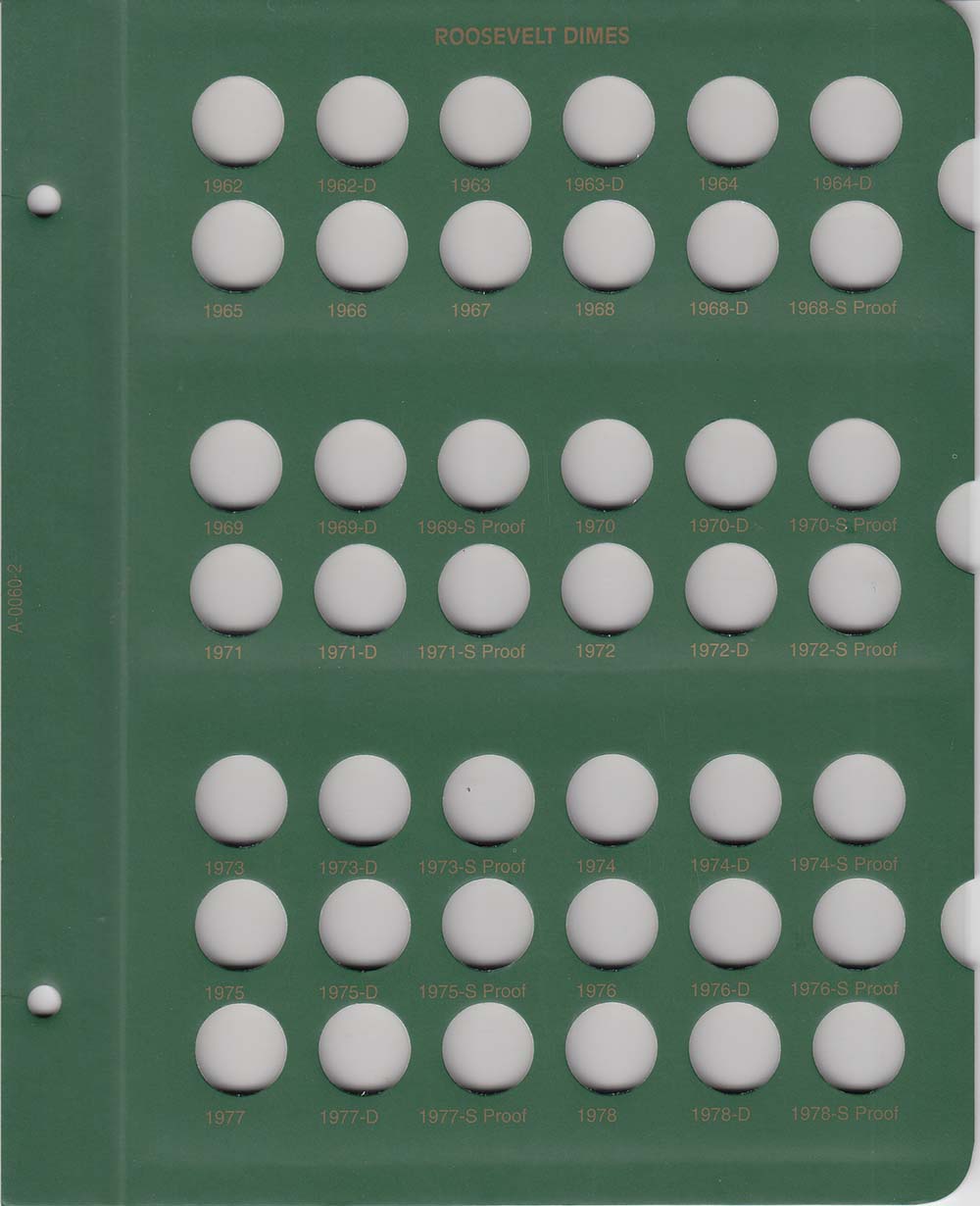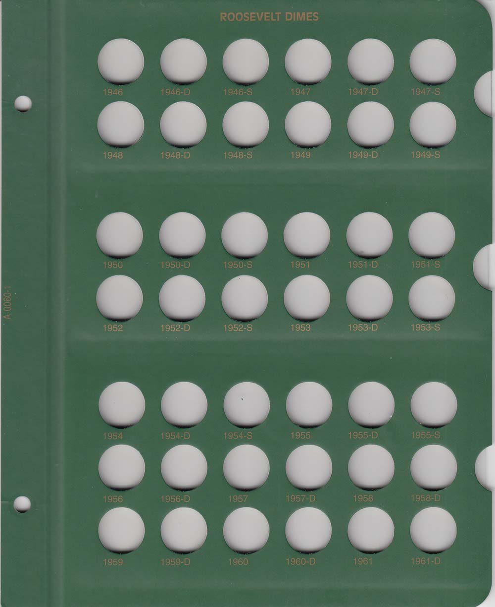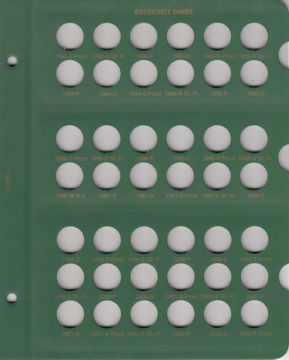 This album includes slots for all of the Roosevelt Dimes issued from 1946 to 2002 from all three mints. Slots are also included for the S-mint proof only issues, including both of the 1979 and 1981 Type 2 S-mint proofs and the silver S-mint proofs starting in 1992.