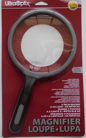 High-powered optical quality 5-inch round, 2.5X power lens with 6X power bifocal insert. The lens is unbreakable and scratch-resistant. Perfect for looking at coins, currency and stamp as well as reading small print, contracts, telephone directories, stock listings, maps and charts.