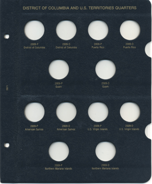 This update page for Whitman's Statehood Quarters Album features the District of Columbia and the five United States trust territories: the Commonwealth of Puerto Rico, Guam, American Samoa, the U.S. Virgin Islands, and the Commonwealth of the Northern Mariana Islands. It has 12 holes for a P and a D mint quarter of each of the six issues.