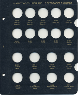 This update page for Whitman's Statehood Quarters Album features the District of Columbia and the five United States trust territories: the Commonwealth of Puerto Rico, Guam, American Samoa, the U.S. Virgin Islands, and the Commonwealth of the Northern Mariana Islands. It has 18 holes for a P, D and S mint quarter of each of the six issues.