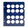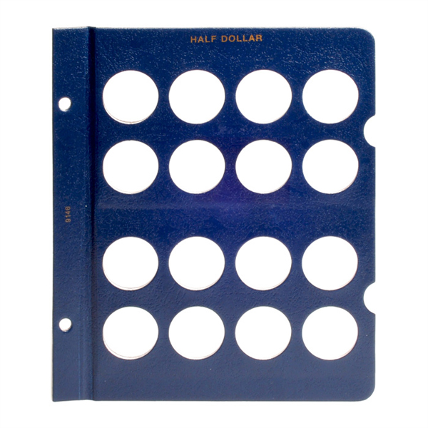 This Whitman Classic Album for Half Dollars (Whitman model number 4478) consists of a dark blue leatherette binder with blue loose-leaf hinged pages. Both the binder and pages are gold stamped. The pages are held in the binder with two posts that screw apart so that pages can be added, removed and replaced with ease and have thumb notches for easy window removal. The album consists of two pages with 16 openings per page for a total of 32 openings.