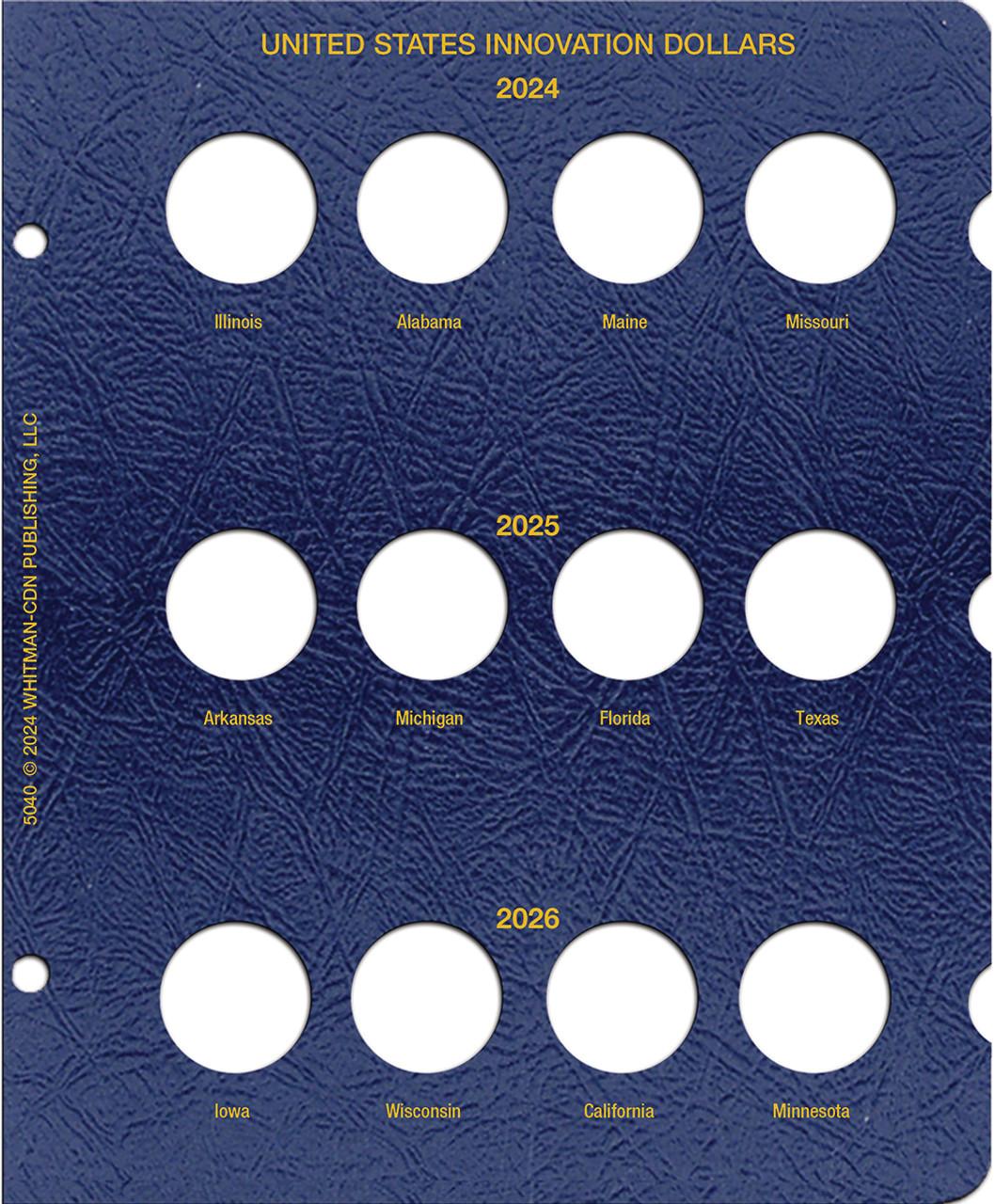 Innovation Dollar dated update page for Whitman Classic Albums or the Universal Binder. Grained leatherette texture. Innovation Dollar Dated Page has 12 openings for 2024 to 2026 type set (one hole per state).