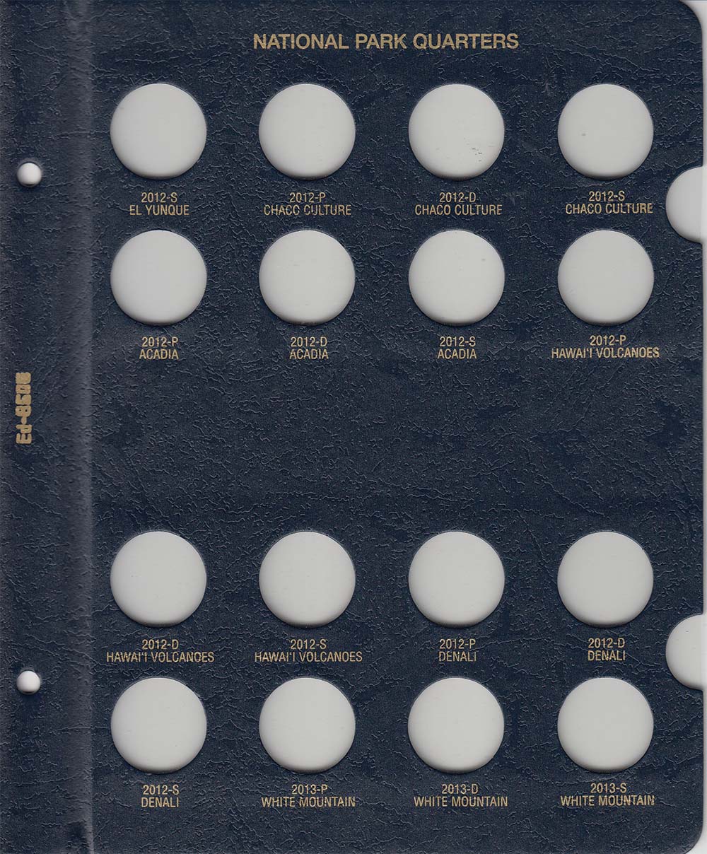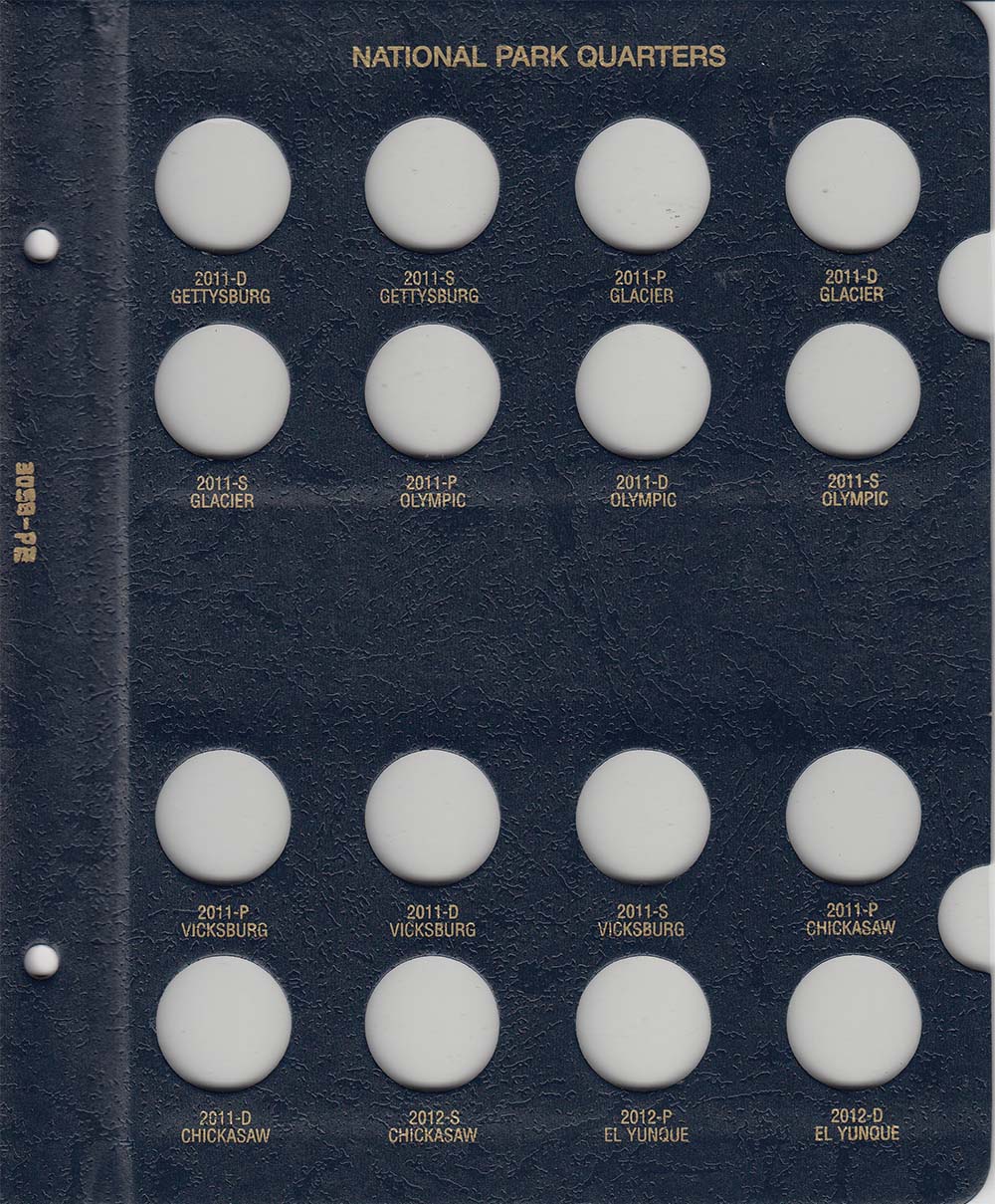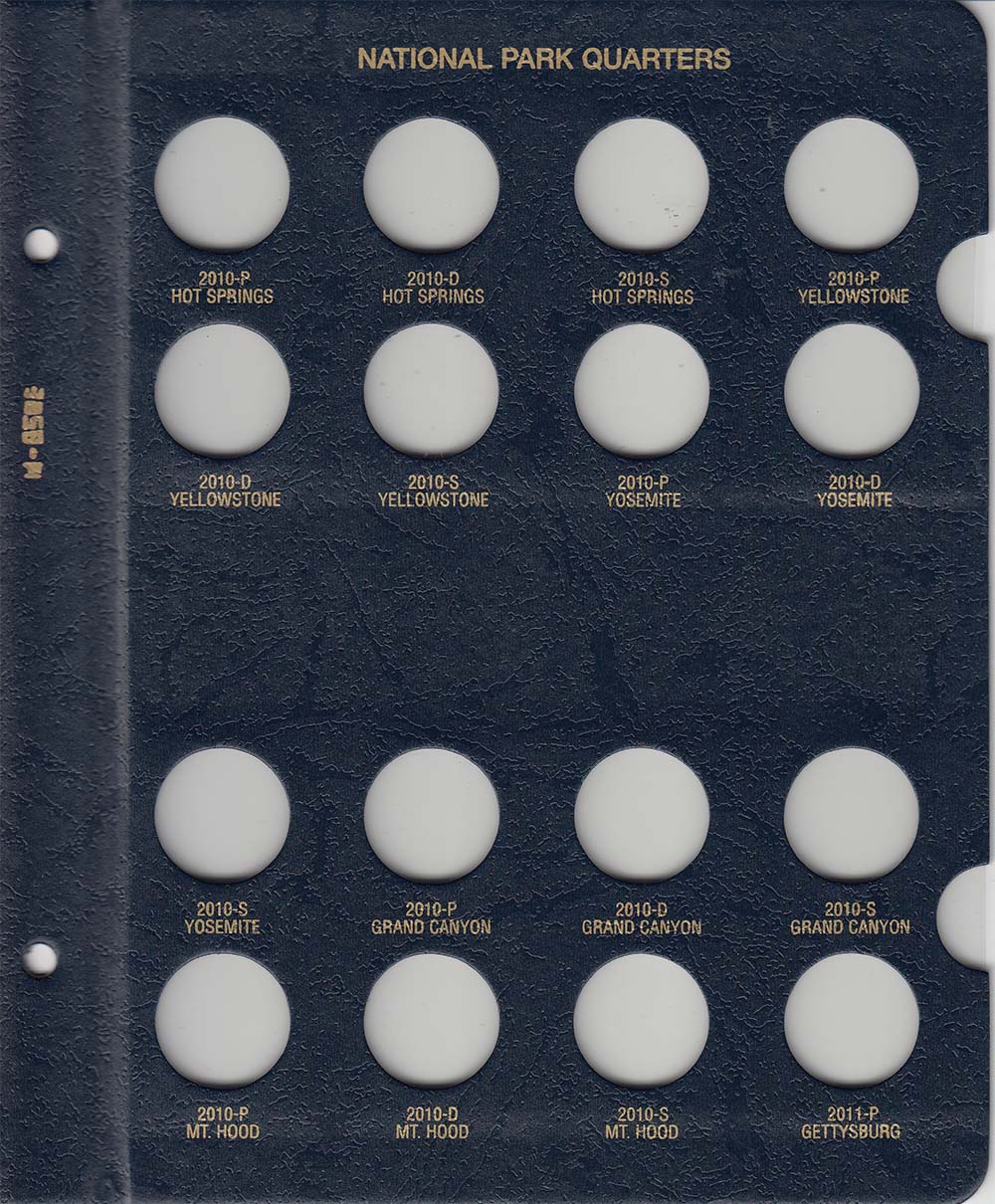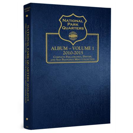 This Whitman Classic Album for National Park Quarters PPS Volume 1 2010-2015 (Whitman model number 3058) consists of a dark blue leatherette binder with blue loose-leaf hinged pages. The six pages included in this album have a total of 96 openings. Both the binder and pages are gold stamped. The pages are held in the binder with two posts that screw apart so that pages can be added, removed and replaced with ease and have thumb notches for easy window removal. The album has a data sheet with mintages and other historical information.