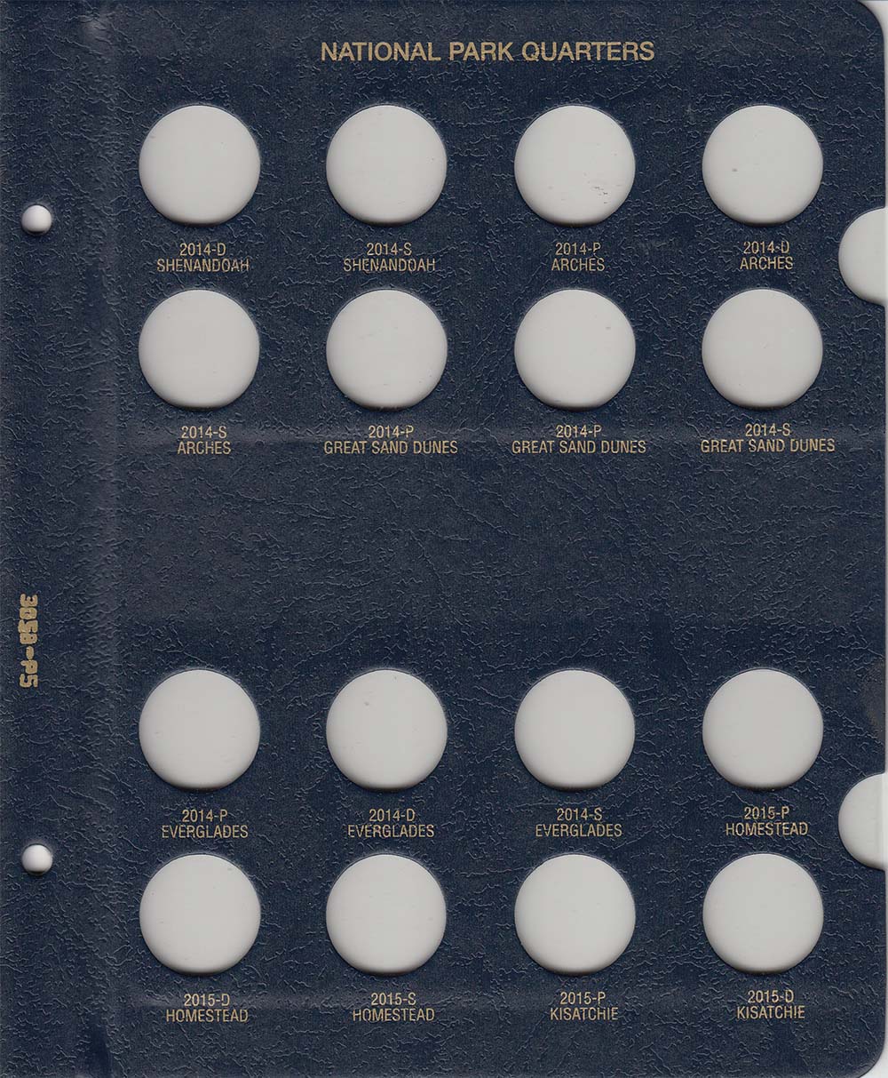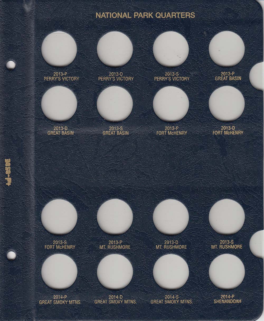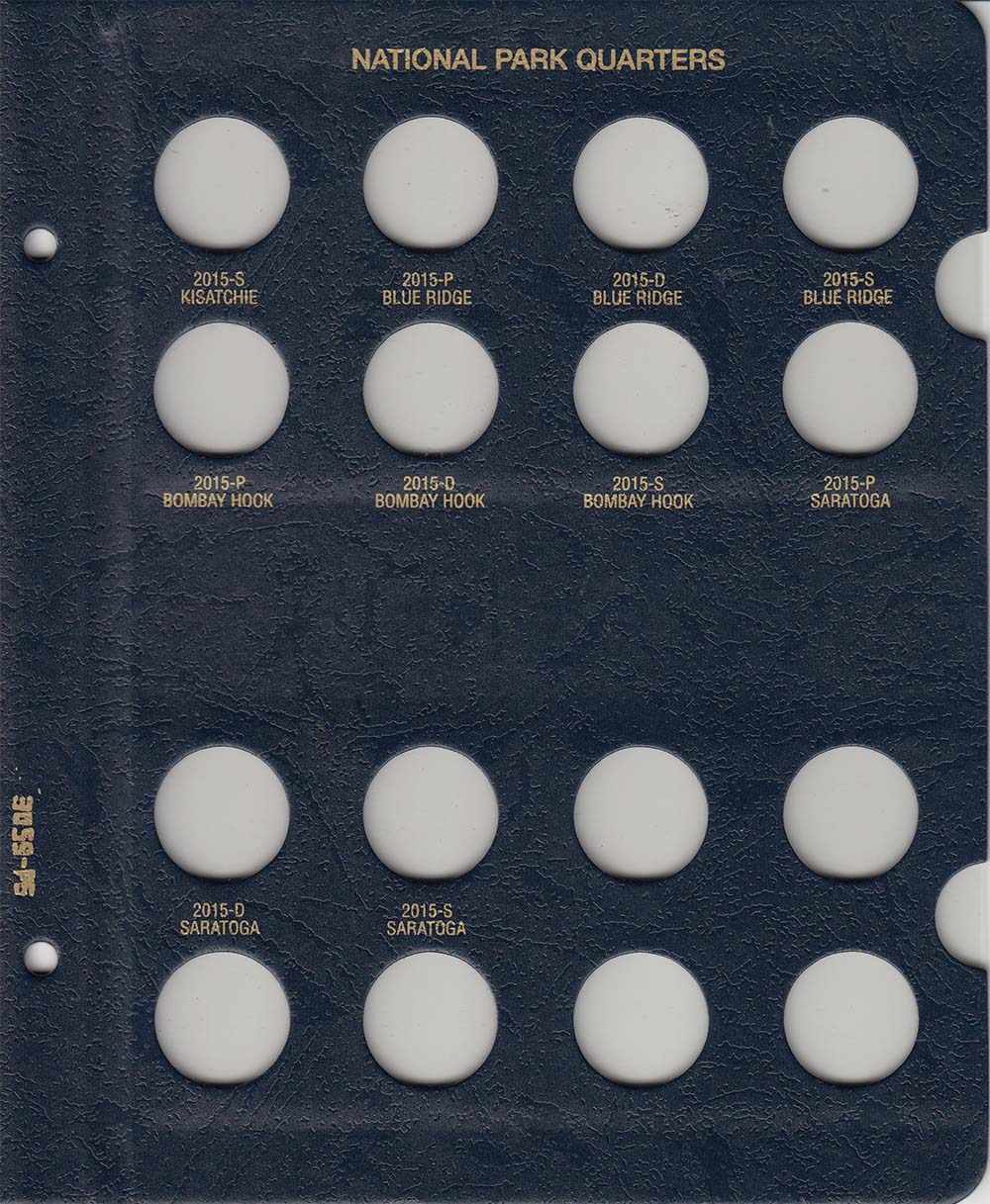 This Whitman Classic Album for National Park Quarters PPS Volume 1 2010-2015 (Whitman model number 3058) consists of a dark blue leatherette binder with blue loose-leaf hinged pages. The six pages included in this album have a total of 96 openings. Both the binder and pages are gold stamped. The pages are held in the binder with two posts that screw apart so that pages can be added, removed and replaced with ease and have thumb notches for easy window removal. The album has a data sheet with mintages and other historical information.