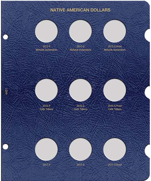Native American dated update page for Whitman Classic Albums or the Universal Binder. Grained leatherette texture. Native American Dated Page has 9 openings for 2015 to 2017 for P, D and S mint coins.