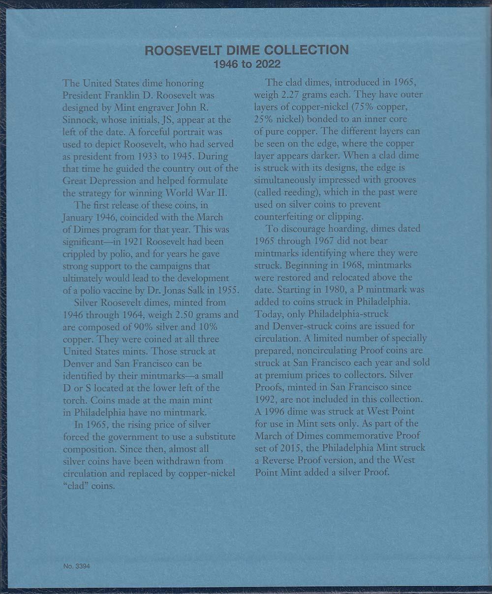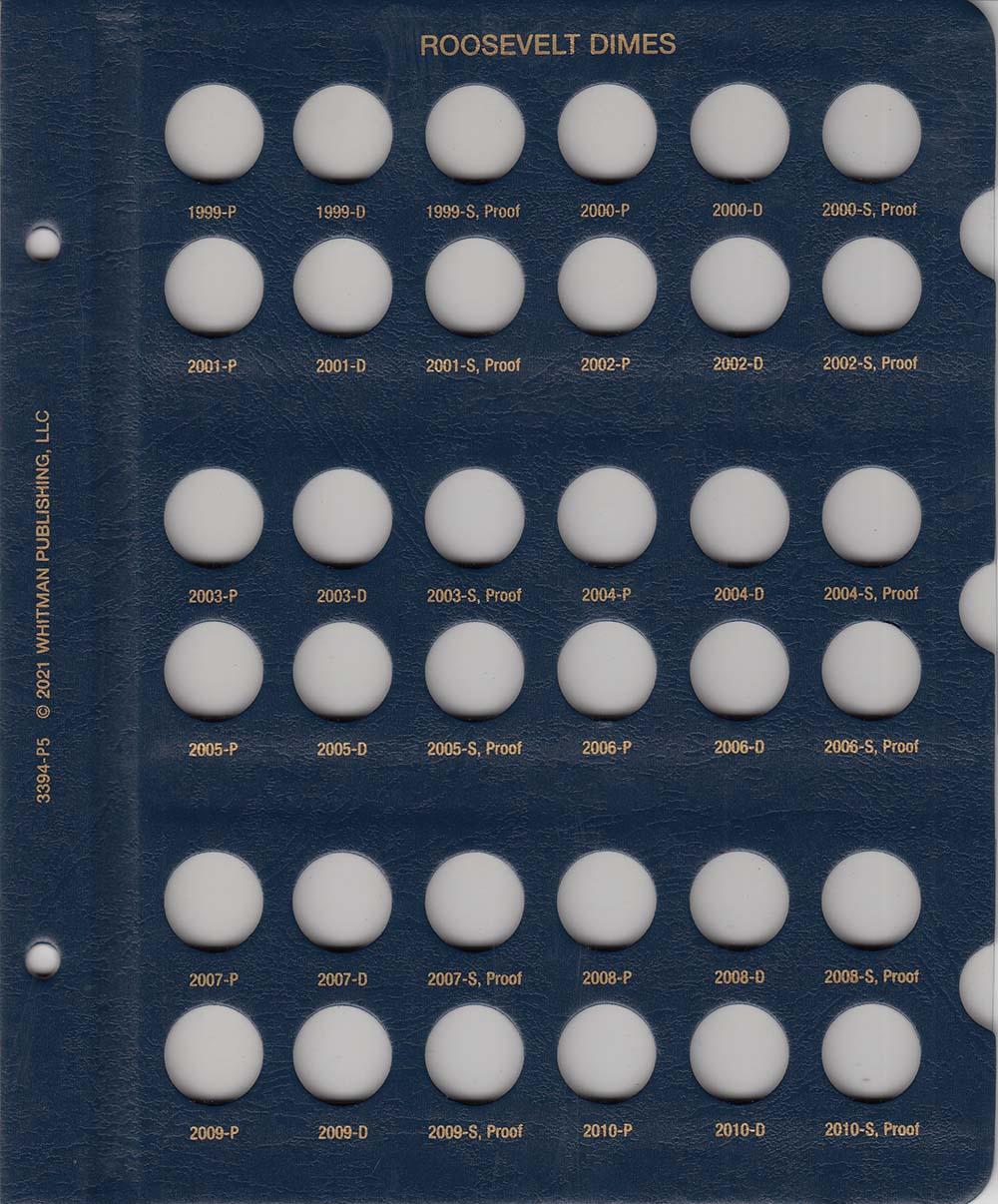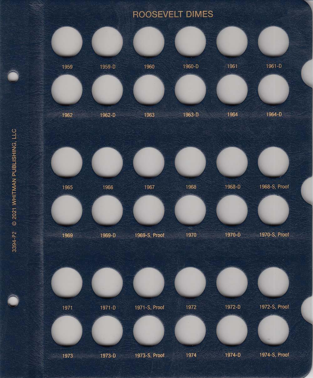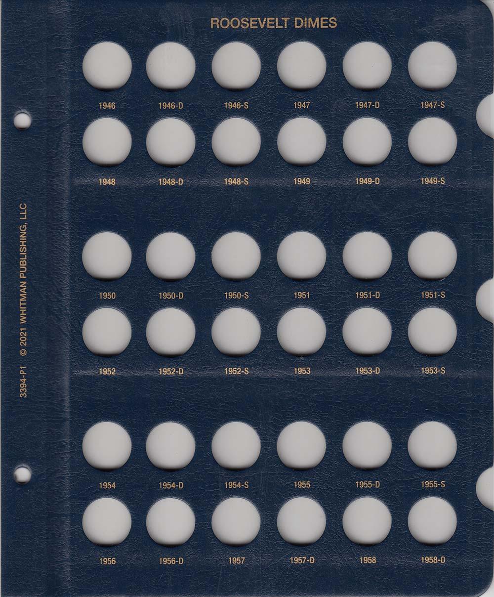 This Whitman Classic Album for Roosevelt Dimes 1946-2022 (Whitman model number 3394) consists of a dark blue leatherette binder with blue loose-leaf hinged pages. Both the binder and pages are gold stamped. The pages are held in the binder with two posts that screw apart so that pages can be added, removed and replaced with ease and have thumb notches for easy window removal. The album has a data sheet with mintages and other historical information.