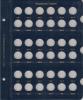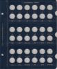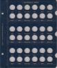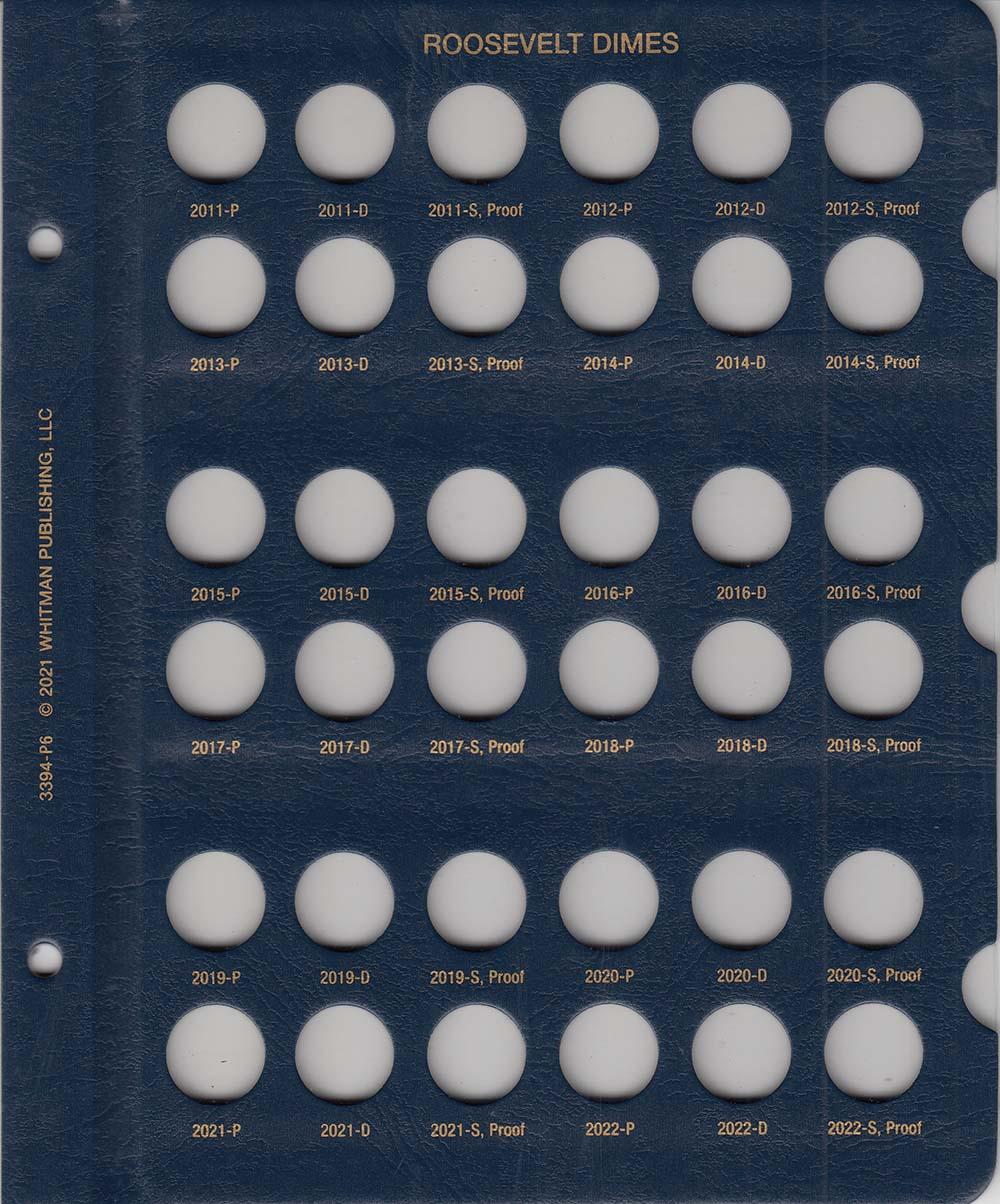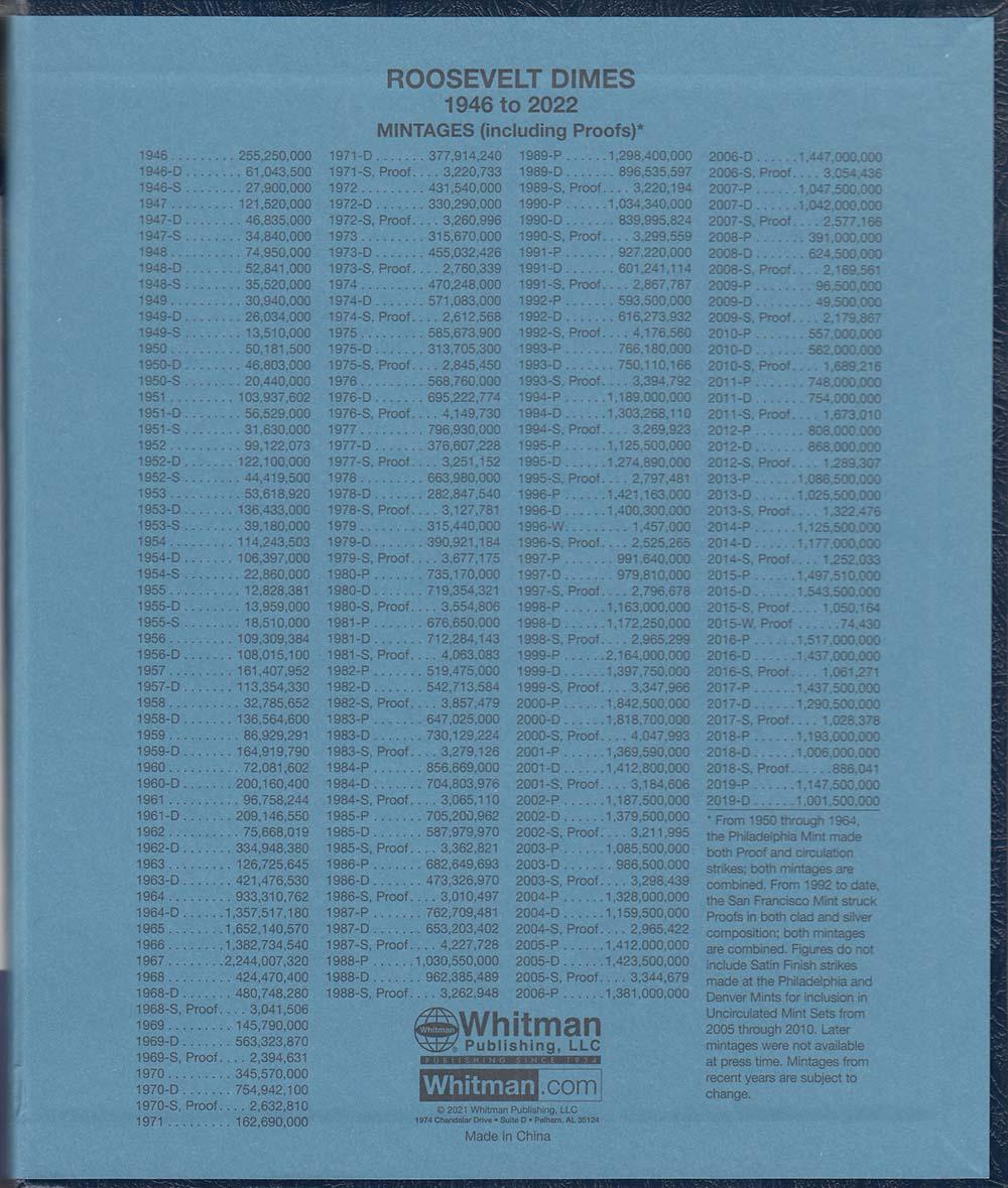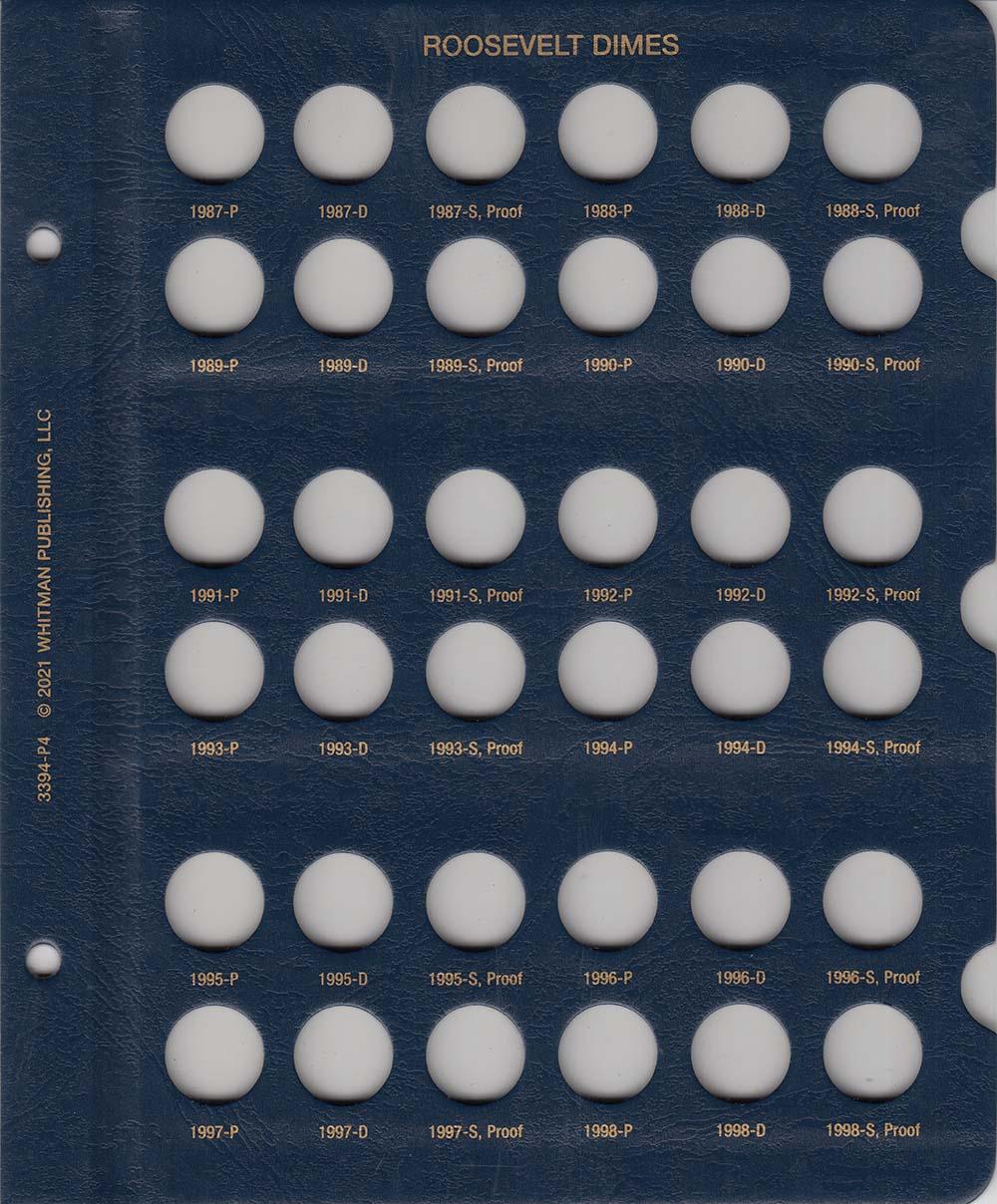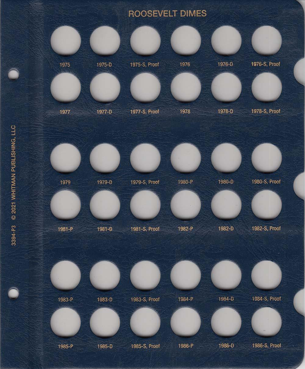 This Whitman Classic Album for Roosevelt Dimes 1946-2022 (Whitman model number 3394) consists of a dark blue leatherette binder with blue loose-leaf hinged pages. Both the binder and pages are gold stamped. The pages are held in the binder with two posts that screw apart so that pages can be added, removed and replaced with ease and have thumb notches for easy window removal. The album has a data sheet with mintages and other historical information.