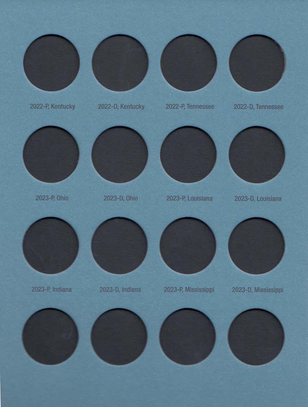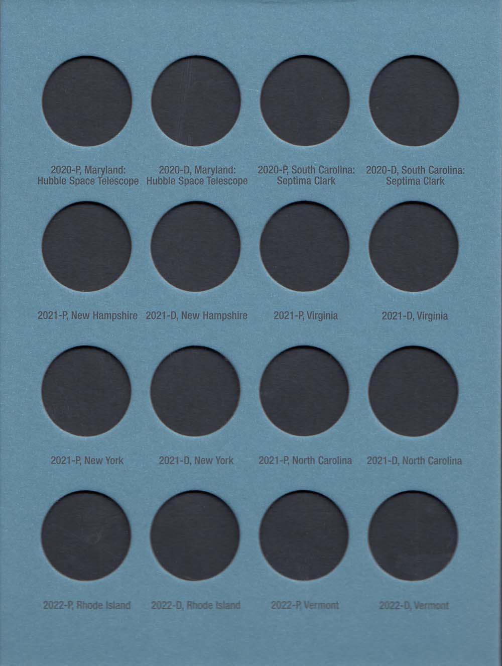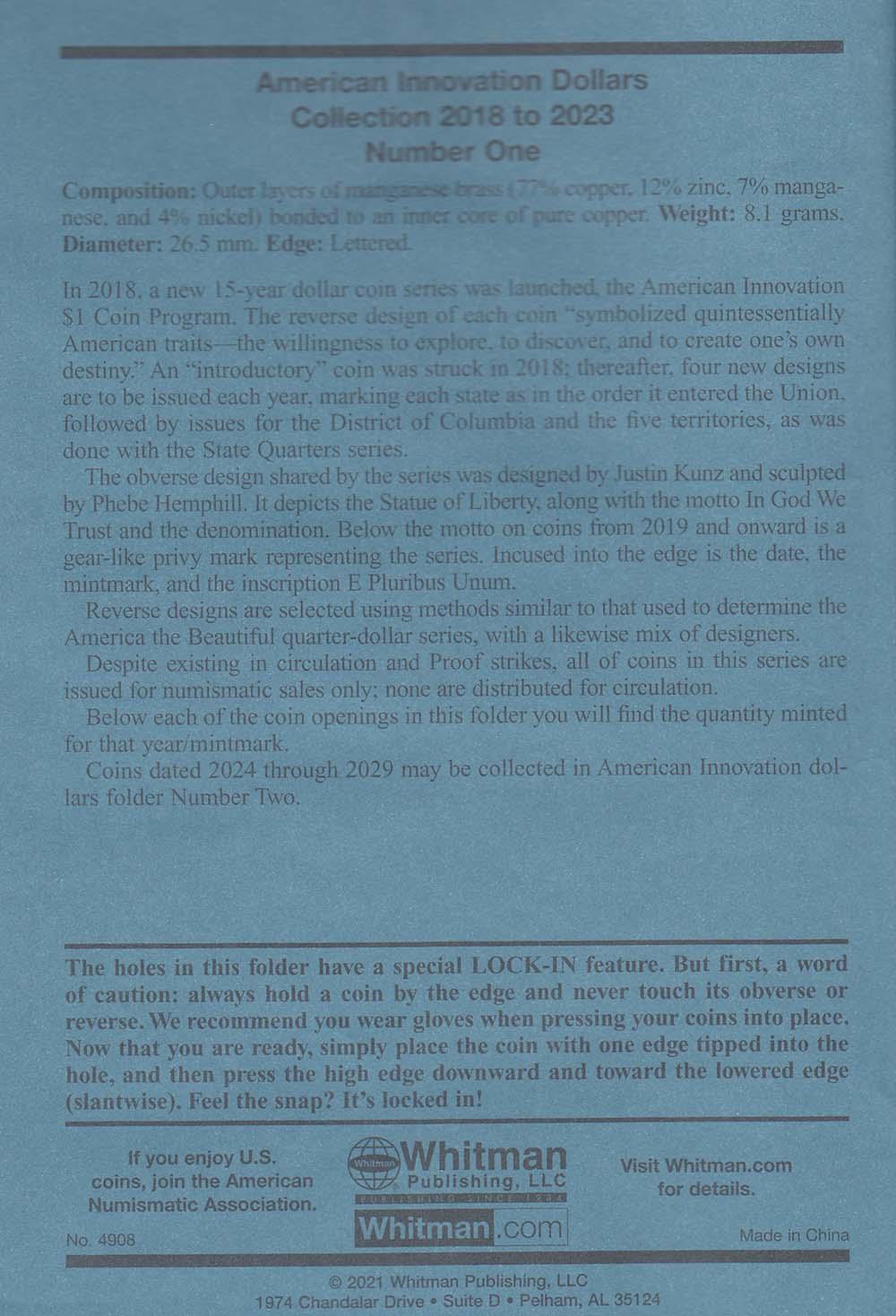 These classic folders have been a mainstay in the hobby for decades. Attractive blue in color, each folder opens flat so that all coins can be viewed at once. Each folder includes information about the series. There are 42 slots for P and D versions of the Innovation Dollars from 2018 to 2023 and four additional unlabeled slots.