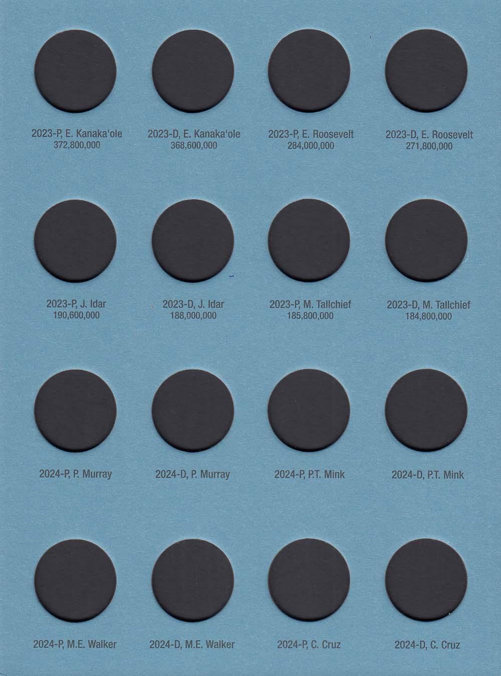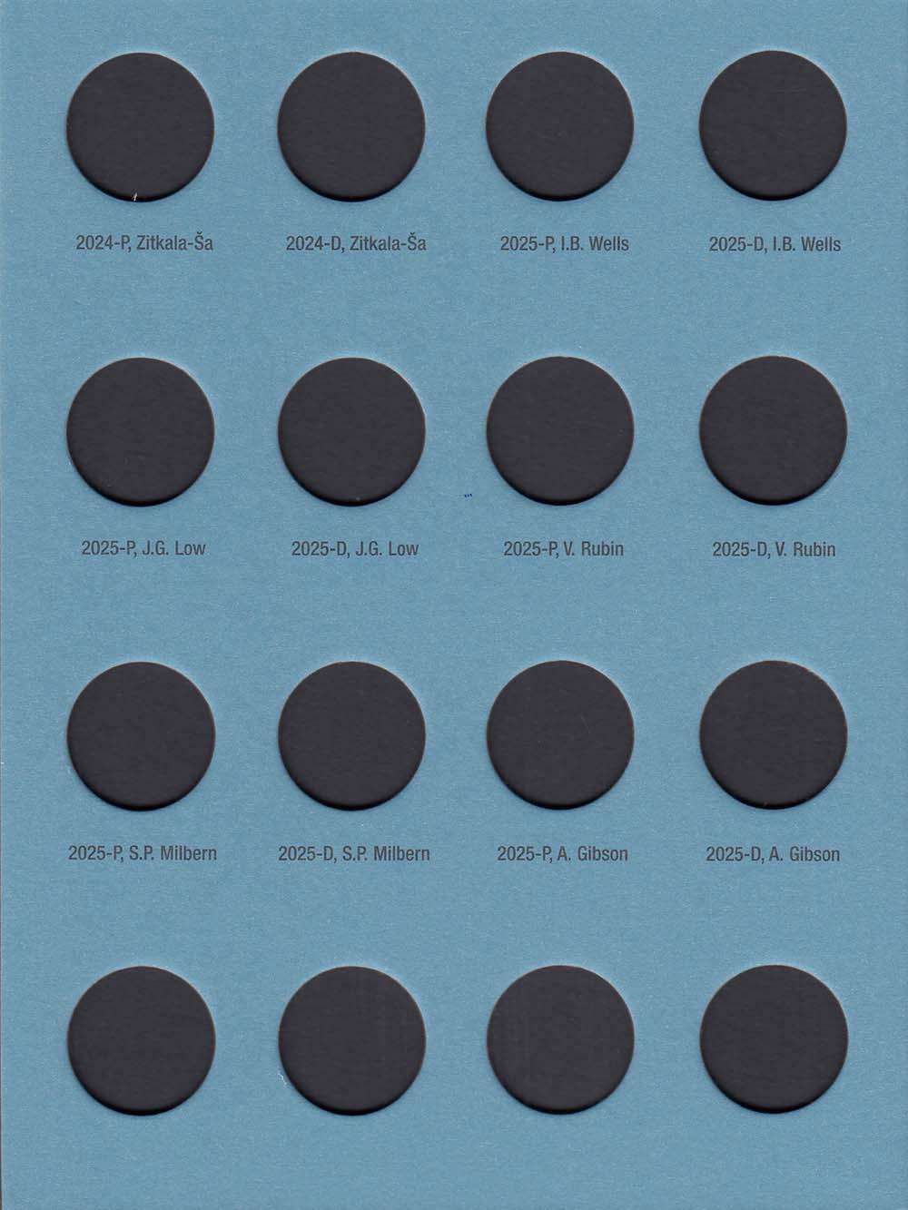 These classic folders have been a mainstay in the hobby for decades. Attractive blue in color, each folder opens flat so that all coins can be viewed at once. Each folder includes information about the series. There are two slots for P and D versions of the 2021 Washington Crossing the Delaware quarter, 40 slots for P and D versions of each of the 2022 to 2025 American Women Quarters and 4 additional unlabeled slots.