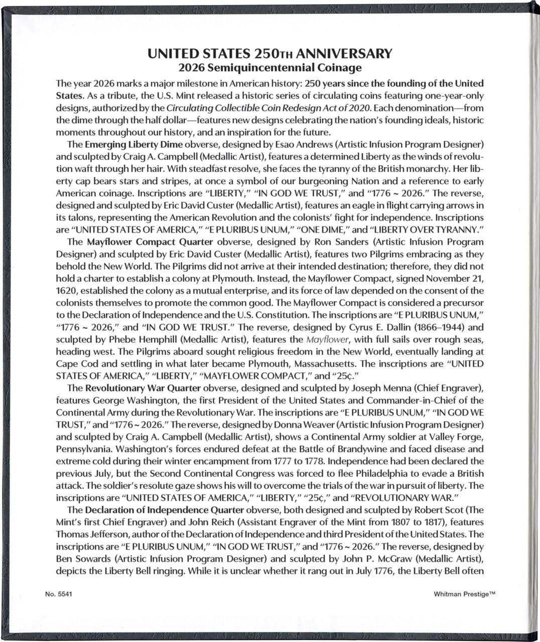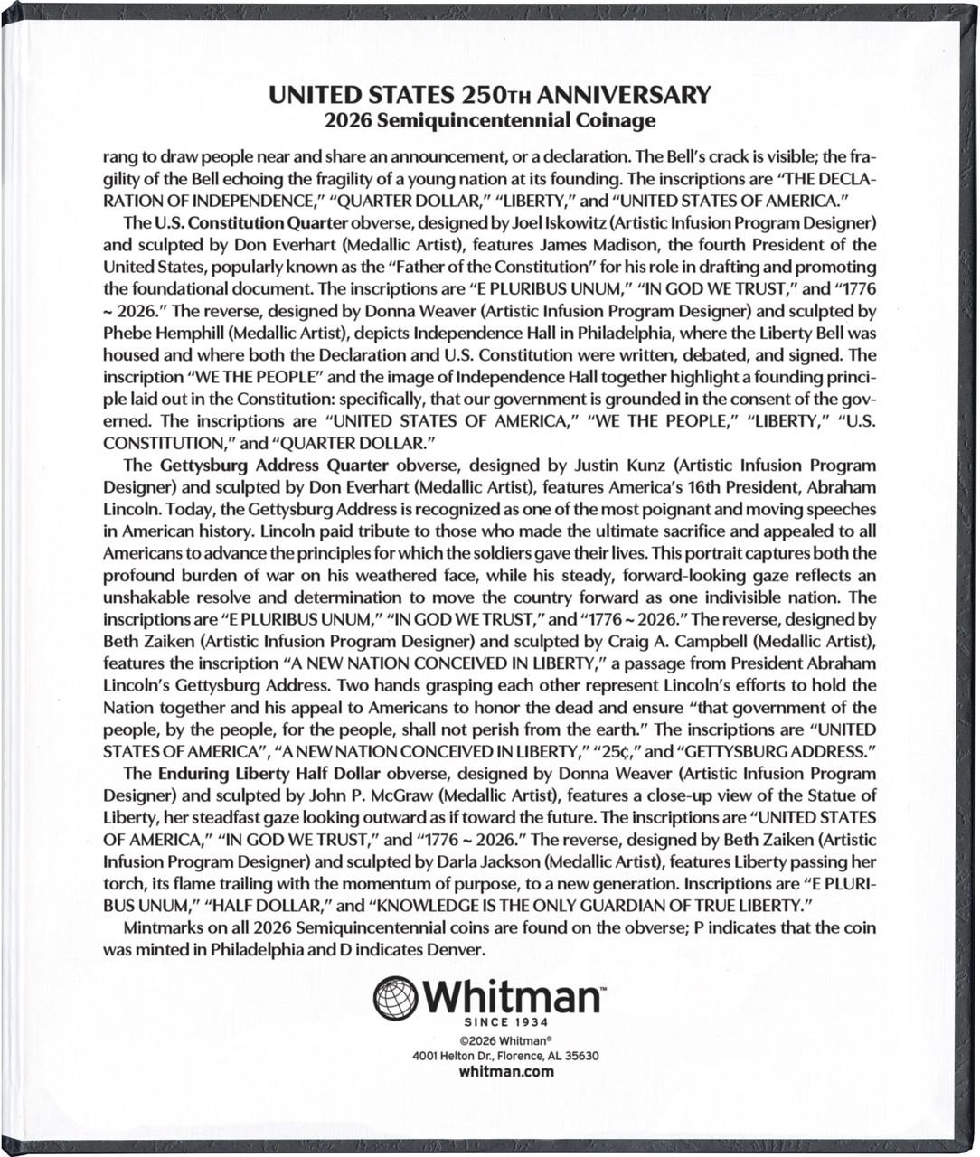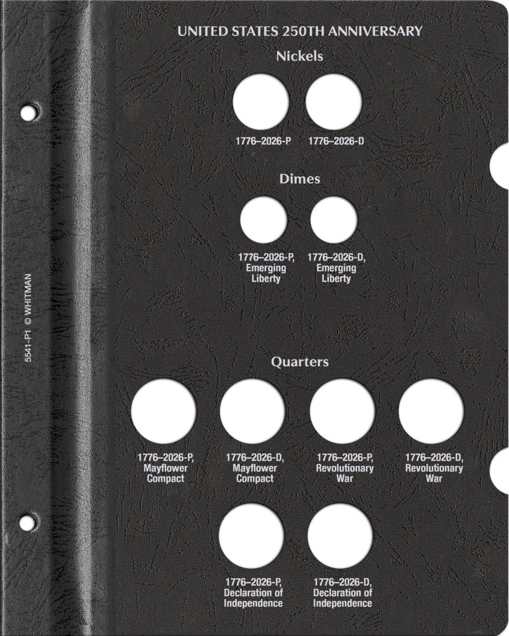 - This album includes 2 pages with a total of 16 openings designed for circulation-strike coins from the Philadelphia and Denver mints for 2026 to celebrate the 250th Anniversary of the United States (Semiquincentennial)
