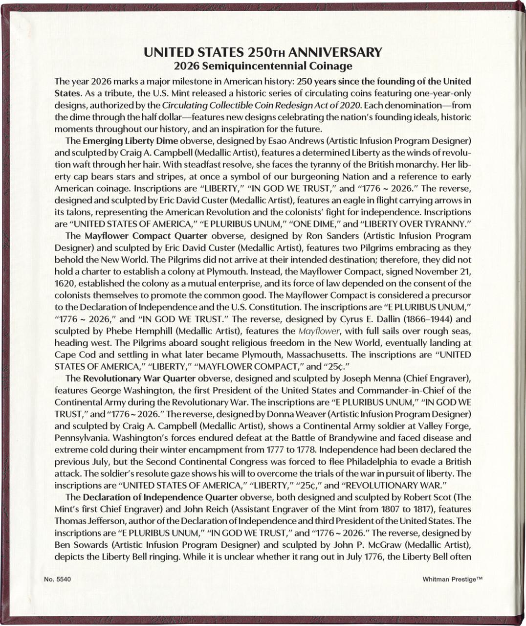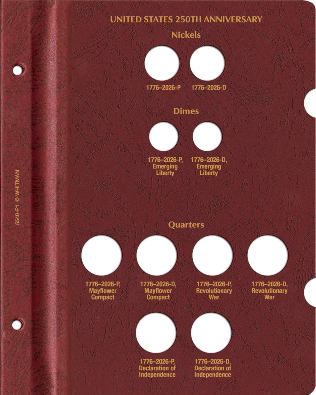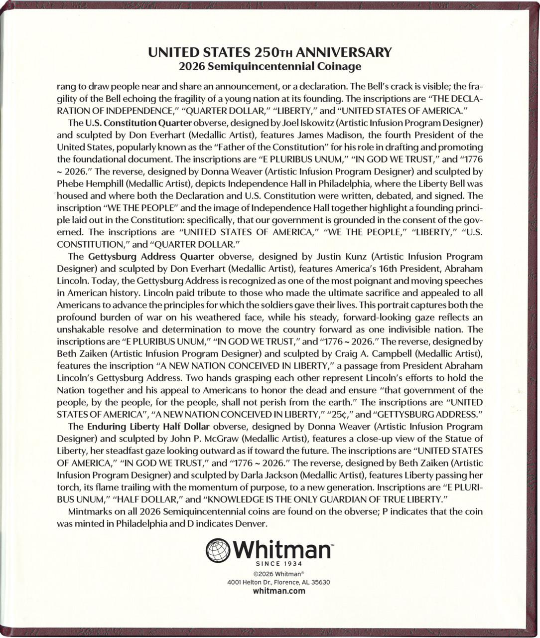 - This album includes 2 pages with a total of 16 openings designed for circulation-strike coins from the Philadelphia and Denver mints for 2026 to celebrate the 250th Anniversary of the United States (Semiquincentennial)